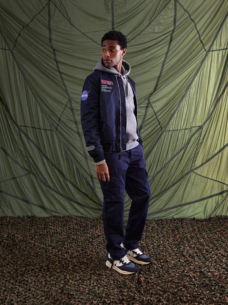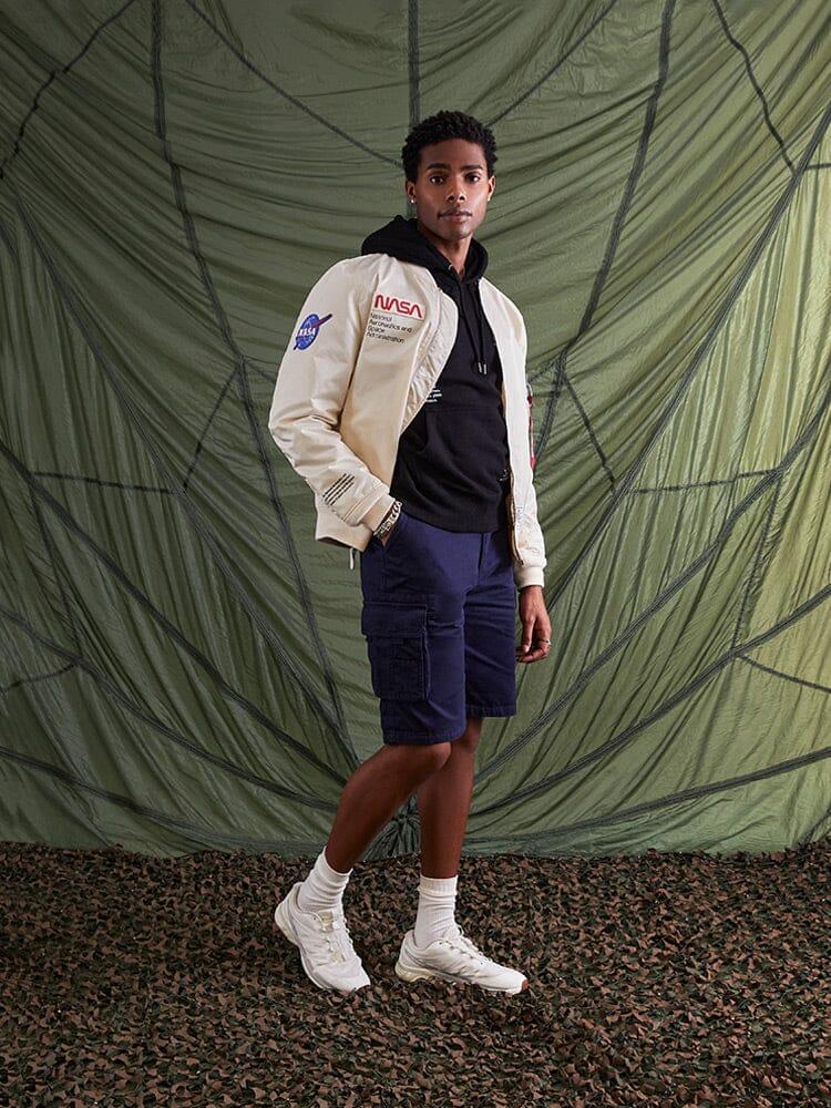 Show off your intergalactic style with this lightweight version of our popular NASA flight jacket, complete with NASA and American flag patches. It’s water resistant and comes in two space-inspired colors, replica blue and off white, for that authentic astronaut look. A flight jacket with NASA logo patches. DETAILS A flight jacket with NASA logo patches. FEATURES NASA worm logo rubber patch on wearer's right Two exterior welt pockets Two interior welt pockets Knit cuff, collar, and waistband Utility sleeve pocket with Alpha red ribbon American flag patch on wearer's left sleeve Alpha label at bottom hem MODEL INFORMATION: White Variant Model: Height: 6'4” Size: Large Replica Blue Variant Model: Height: 6’ 2” Size: Large