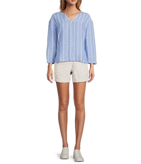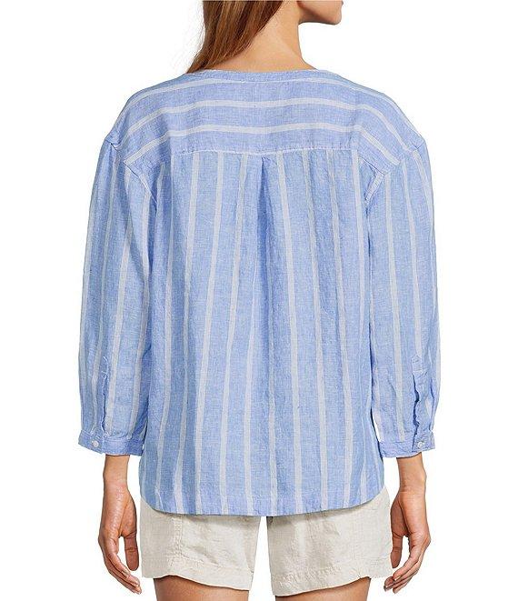 L.L.Bean Linen Twill Striped Split Round Neck Long Sleeve Blouse
