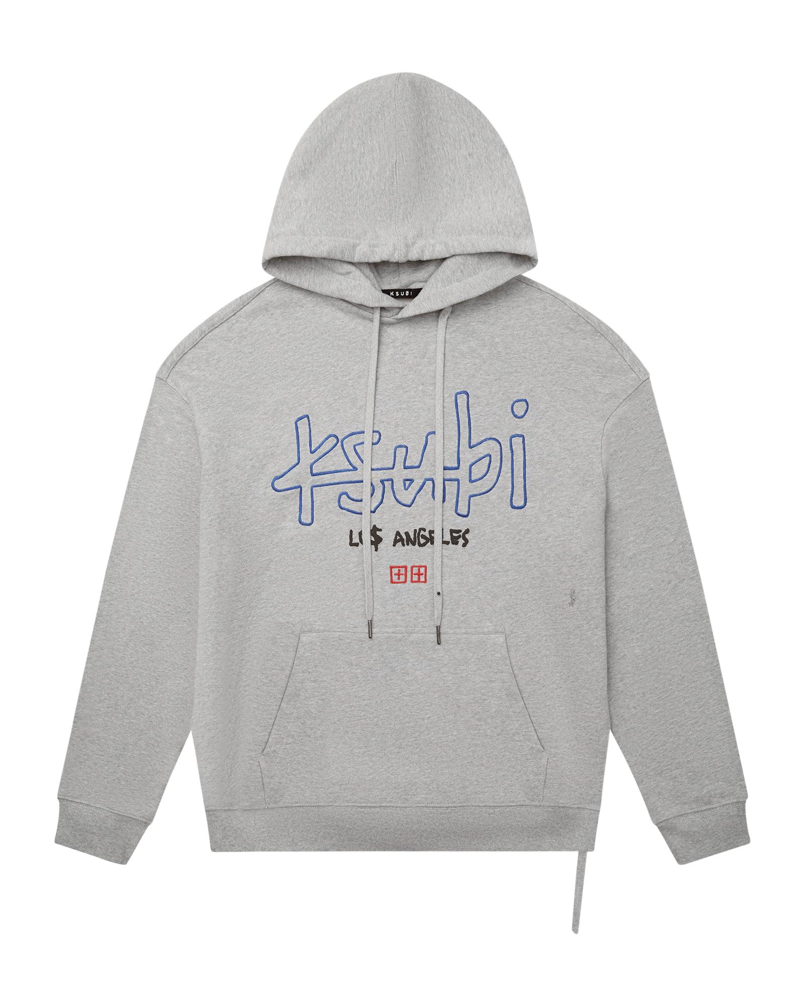 The LA 4x4 Biggie Hoodie is an oversized fitting hoodie with drawstrings and a signature rats tail detail. Cut from a premium loopback fleece in a grey marle colourway, this style features Ksubi 'Los Angeles' original artwork screen printed and embroidered onto the front and back. Finished with signature t-box and 4x4 screen printed artwork on the back, and Ksubi branded metal hardware. Available exclusively in the US online and in store at Ksubi LA.Cool machine wash with like colours, wash inside out, do not bleach, remove promptly after wash, do not wring, do not tumble dry, cool iron on reverse, do not iron directly onto prints or metal hardware, do not dry clean.