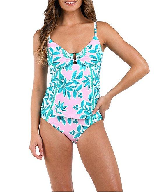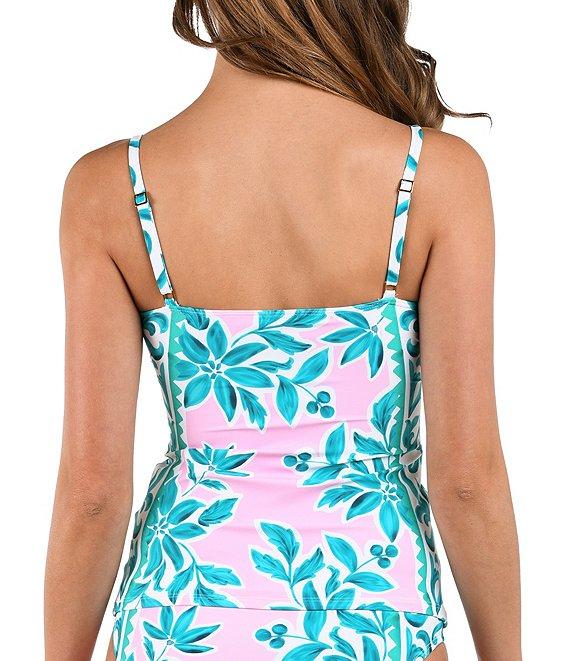 From La Blanca, this swim top features: Tankini silhouette Engineered palm print V-neckline Removable padded cups Adjustable over the shoulder straps Tummy control Gold ring detail Fully lined Pullover construction Nylon/elastane Hand wash Imported.