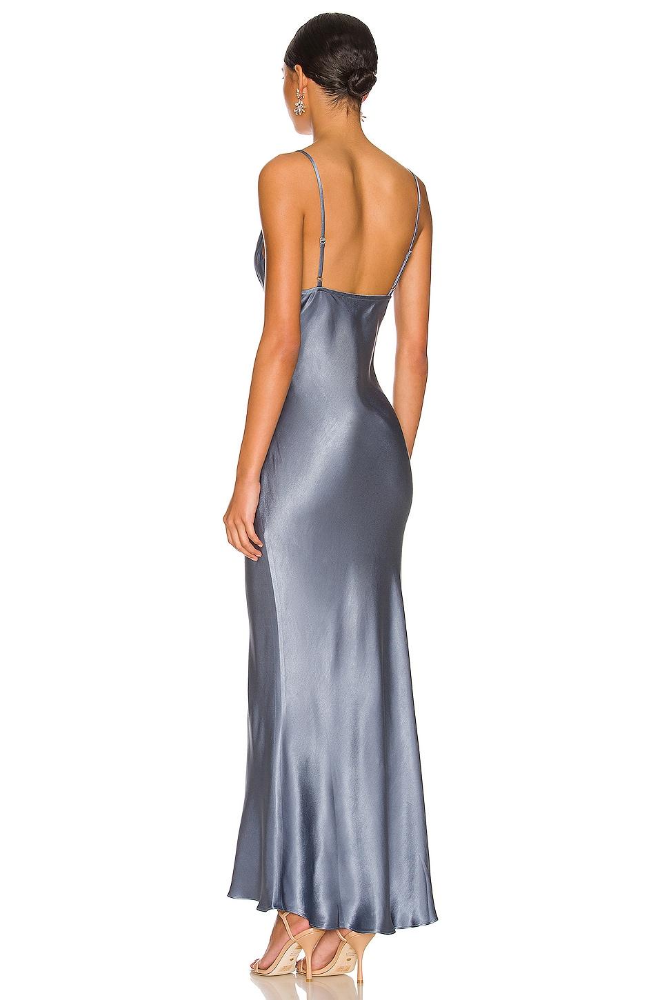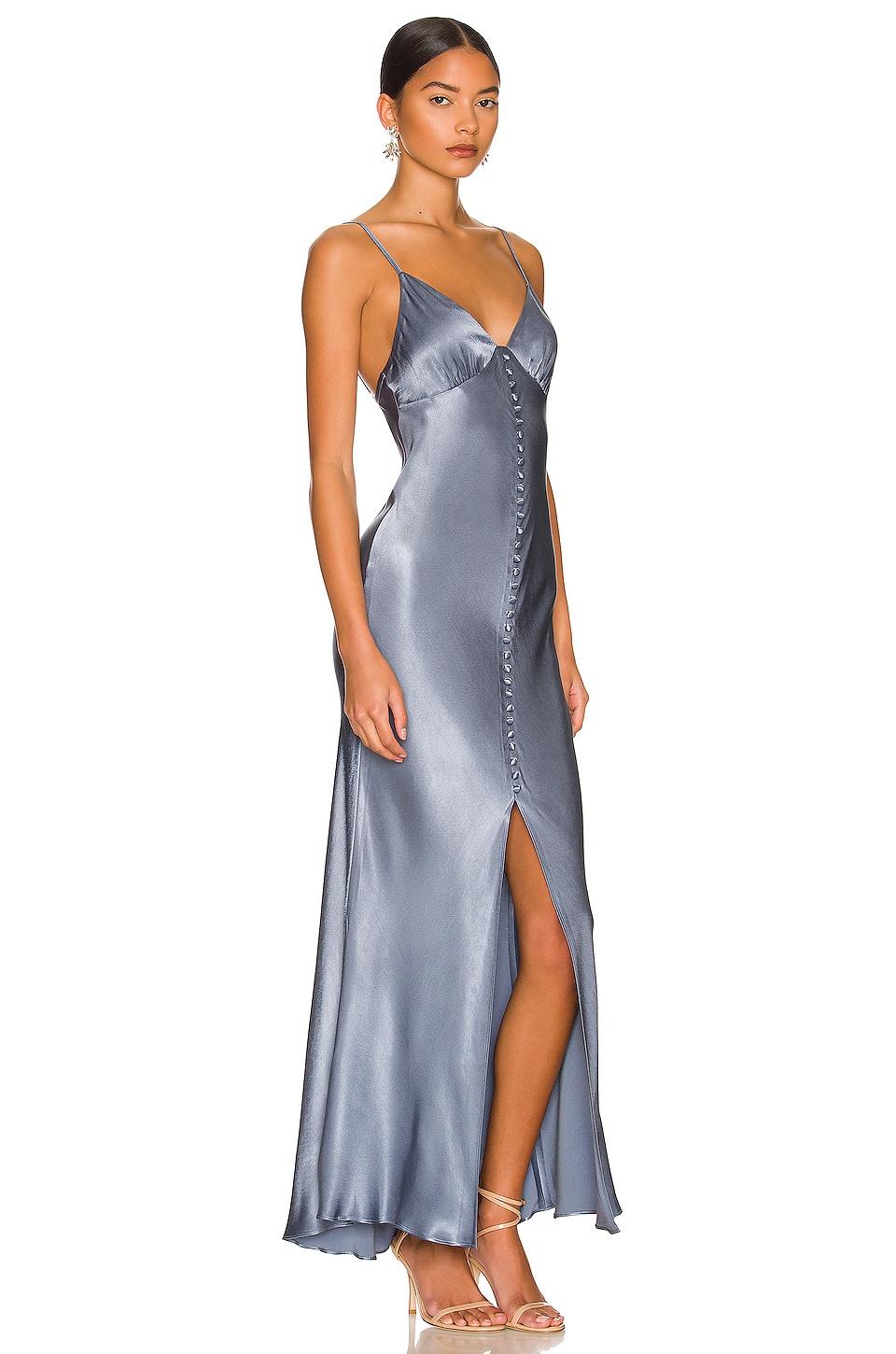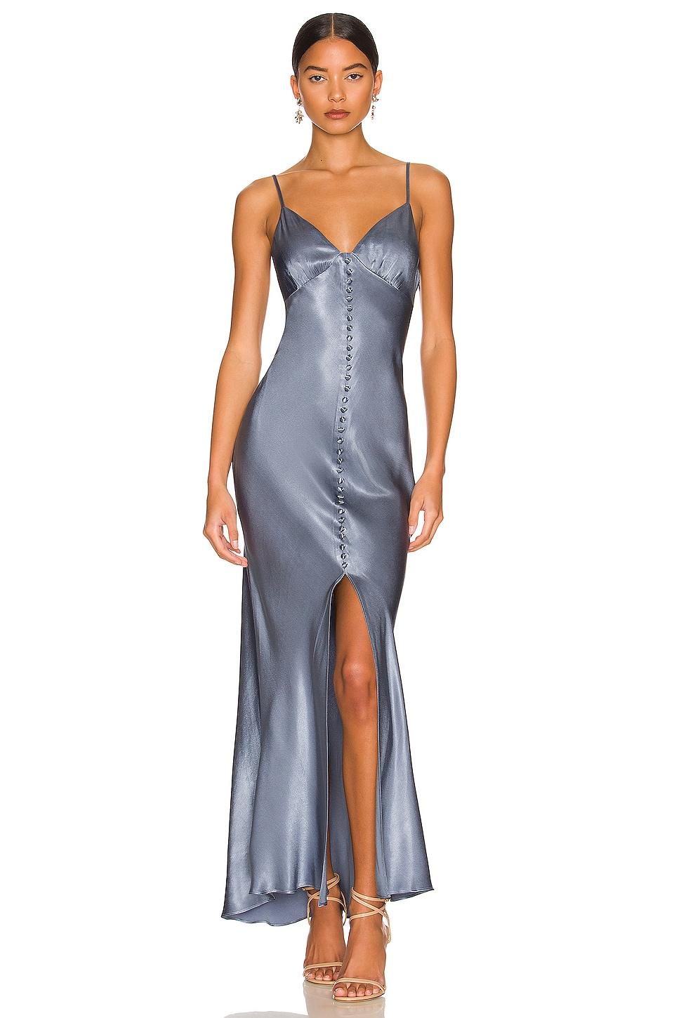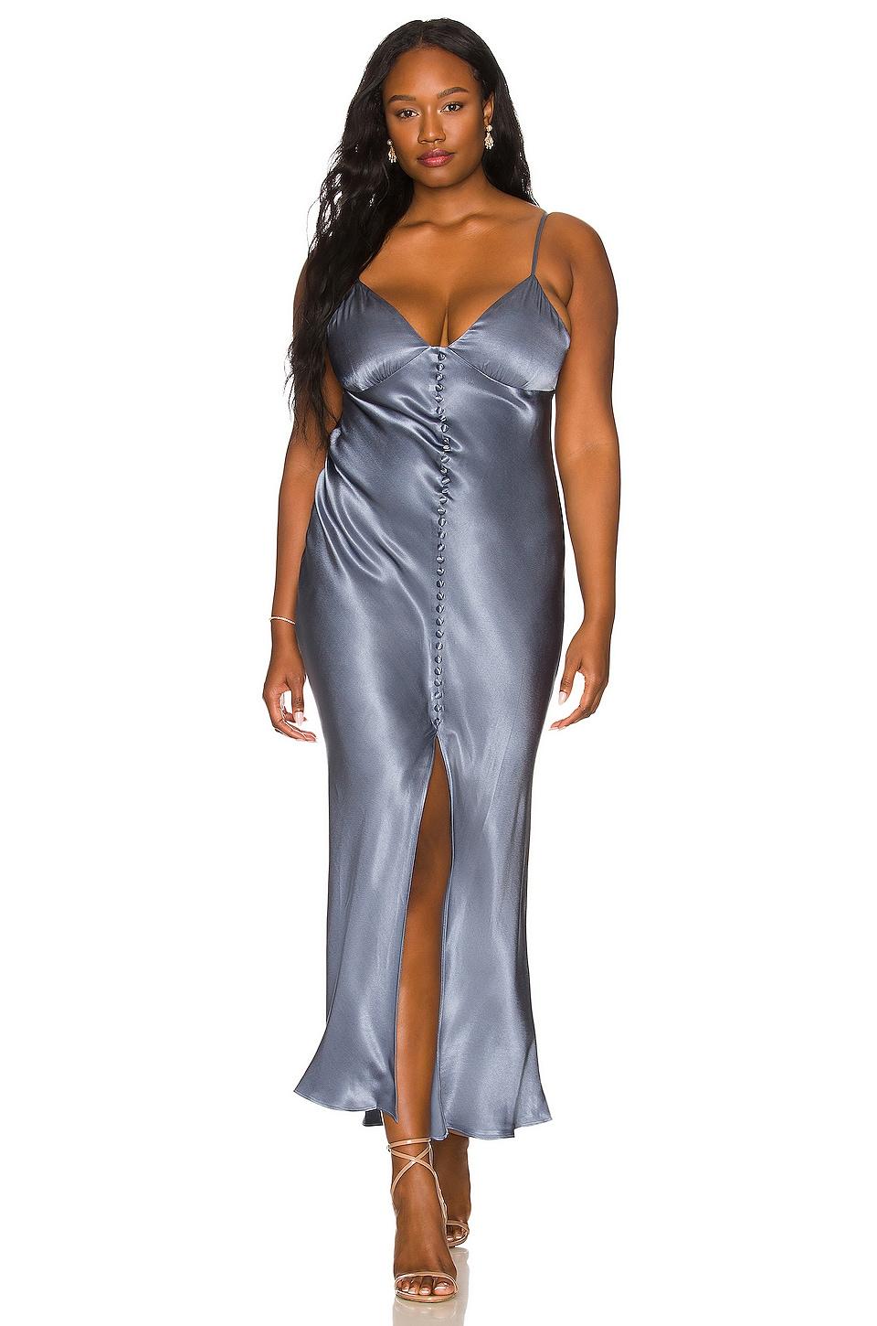 58% lenzing ecovero, 42% viscose. Made in China. Hand wash. Partially lined. Hidden side zipper closure. Lustrous satin fabric with adjustable shoulder straps. Faux button center trim with hem slit. Model 1 is wearing size US 2Model 2 is wearing size US 6Model 3 is wearing size US 10. Revolve Style No. SHON-WD365. Manufacturer Style No. SJ3952.