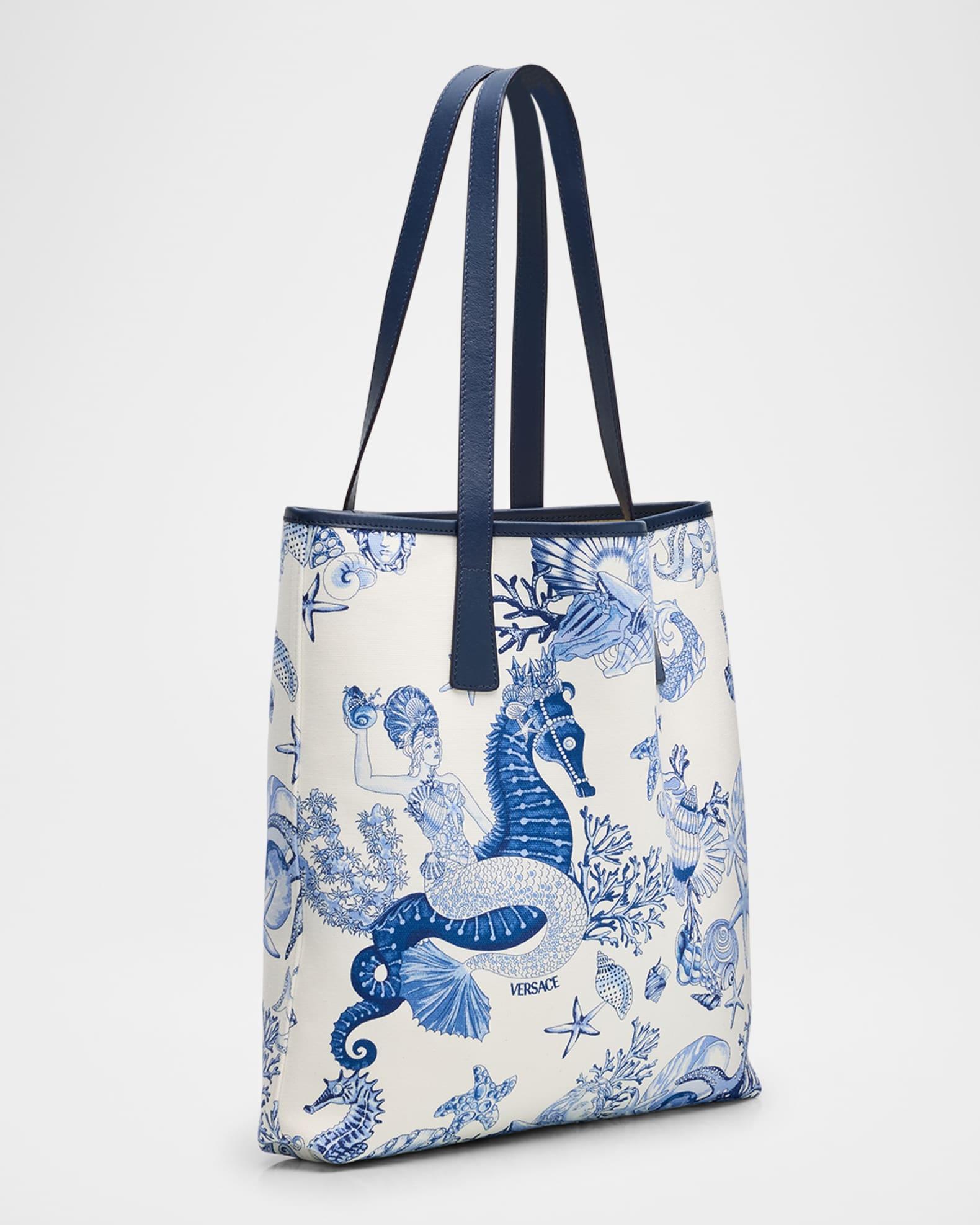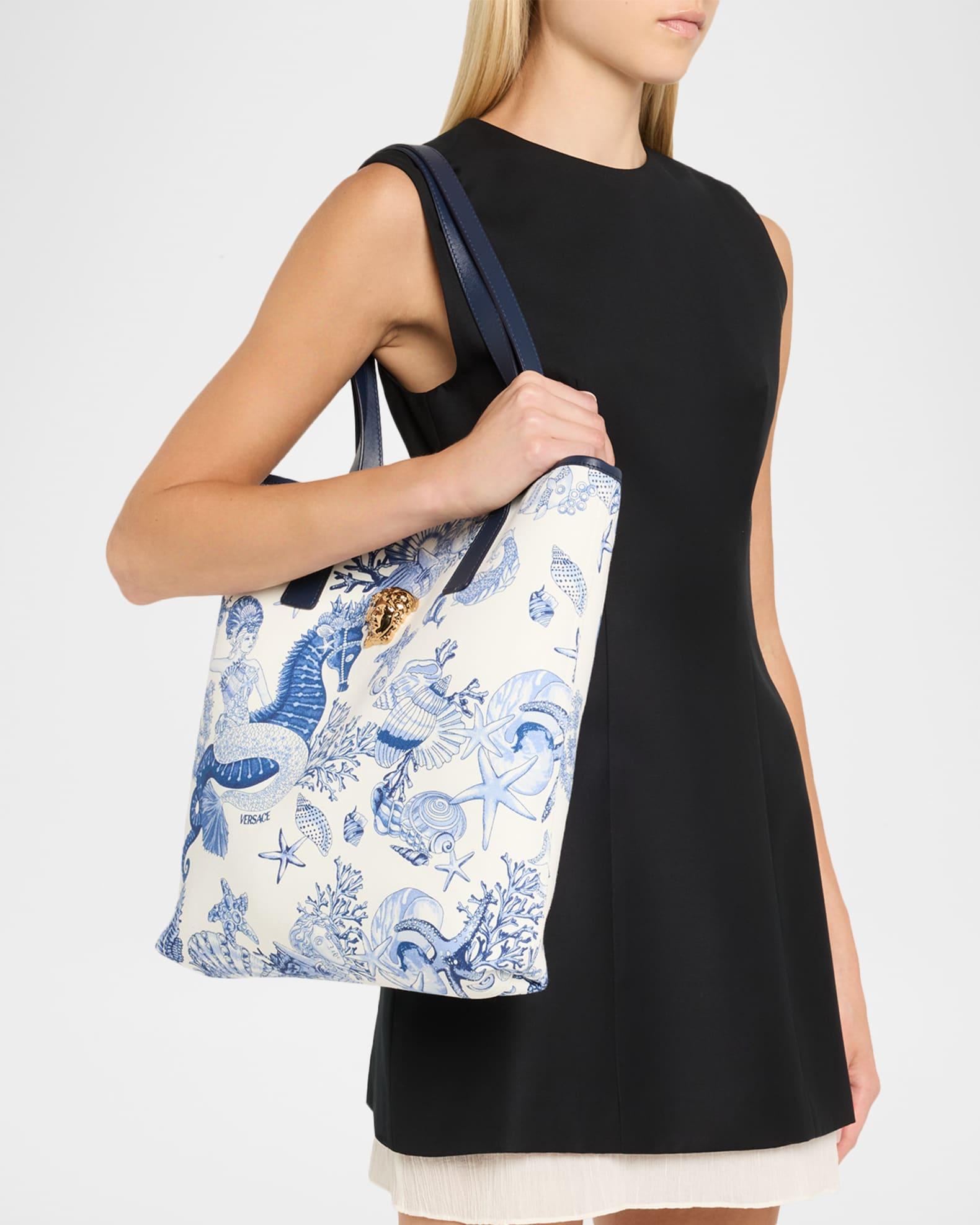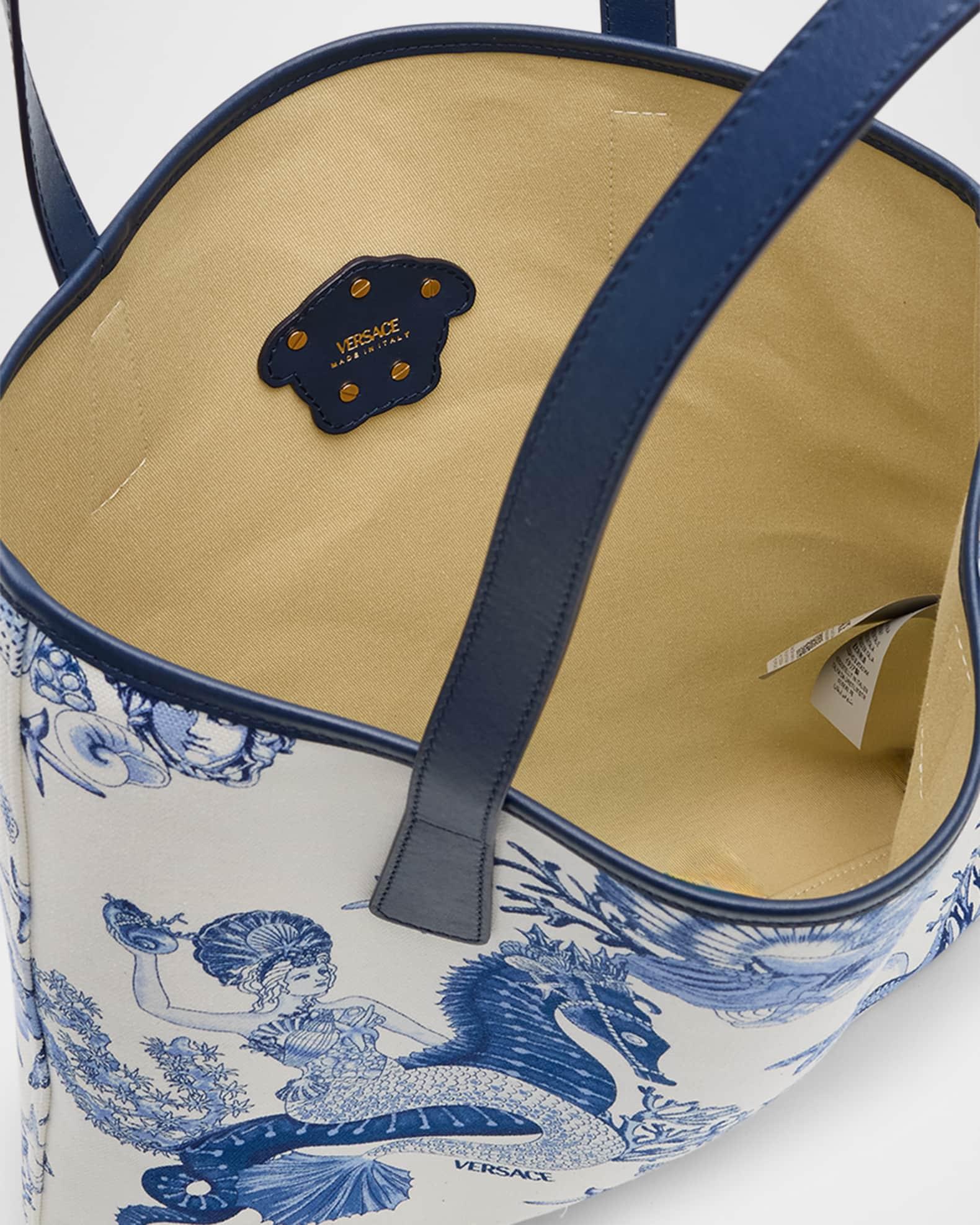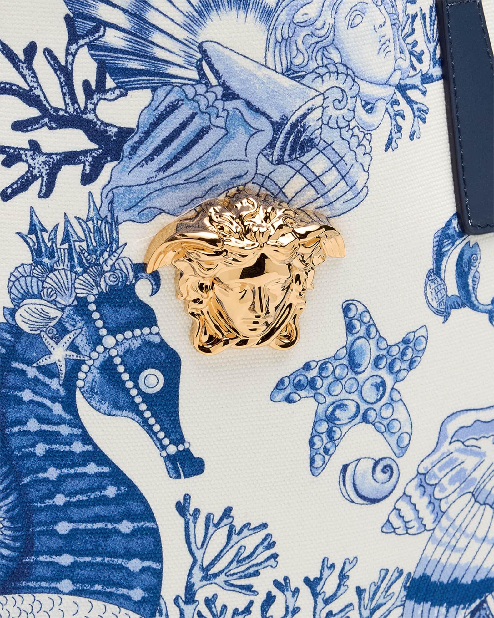 Versace "La Medusa" tote bag in cotton canvas features the bright Coral Theater Allover print Detailed with solid leather trim and signature Medusa head hardware Shoulder straps Open top Approx. 14.9"H x 14.1"W x 2.8"D Made in Italy