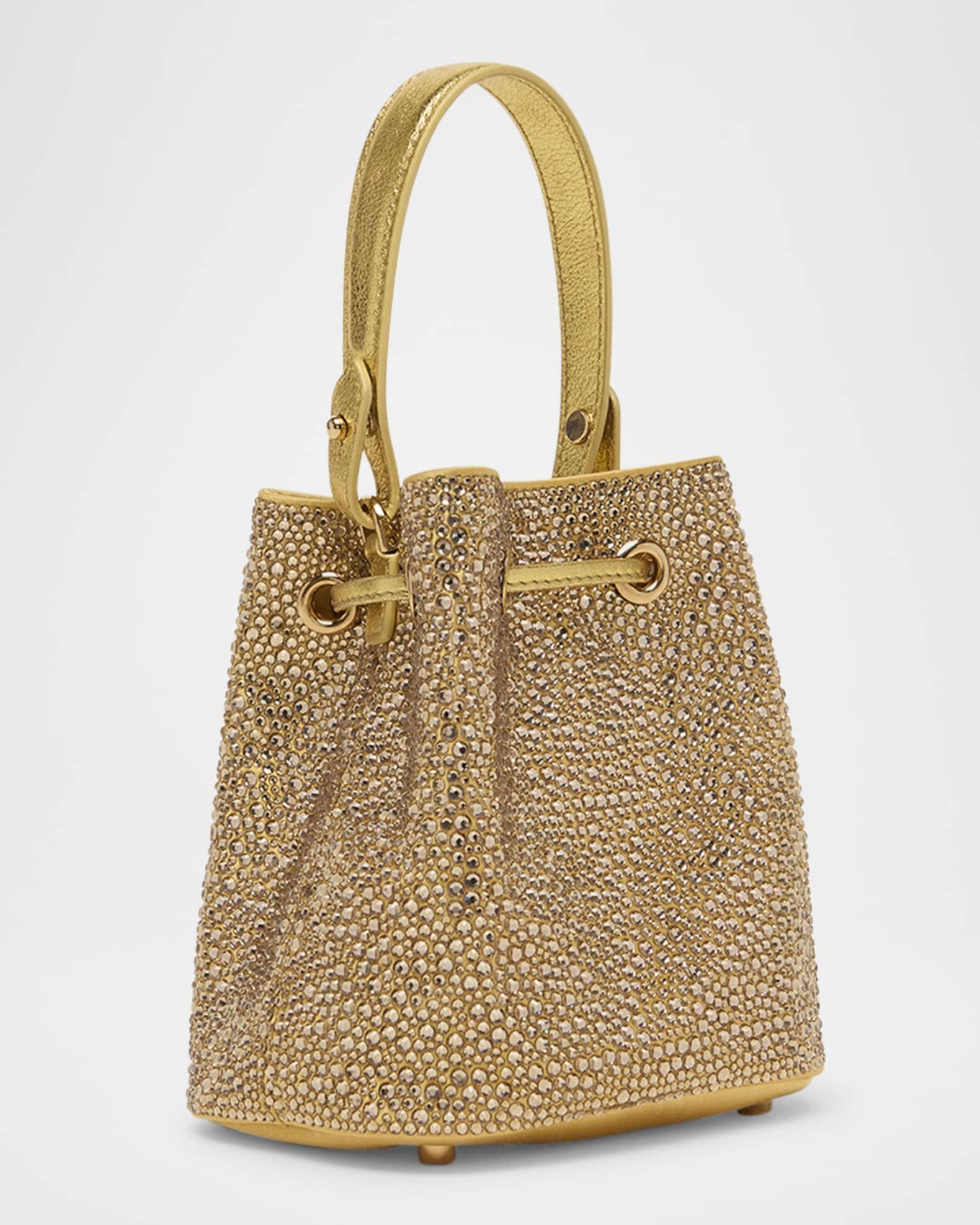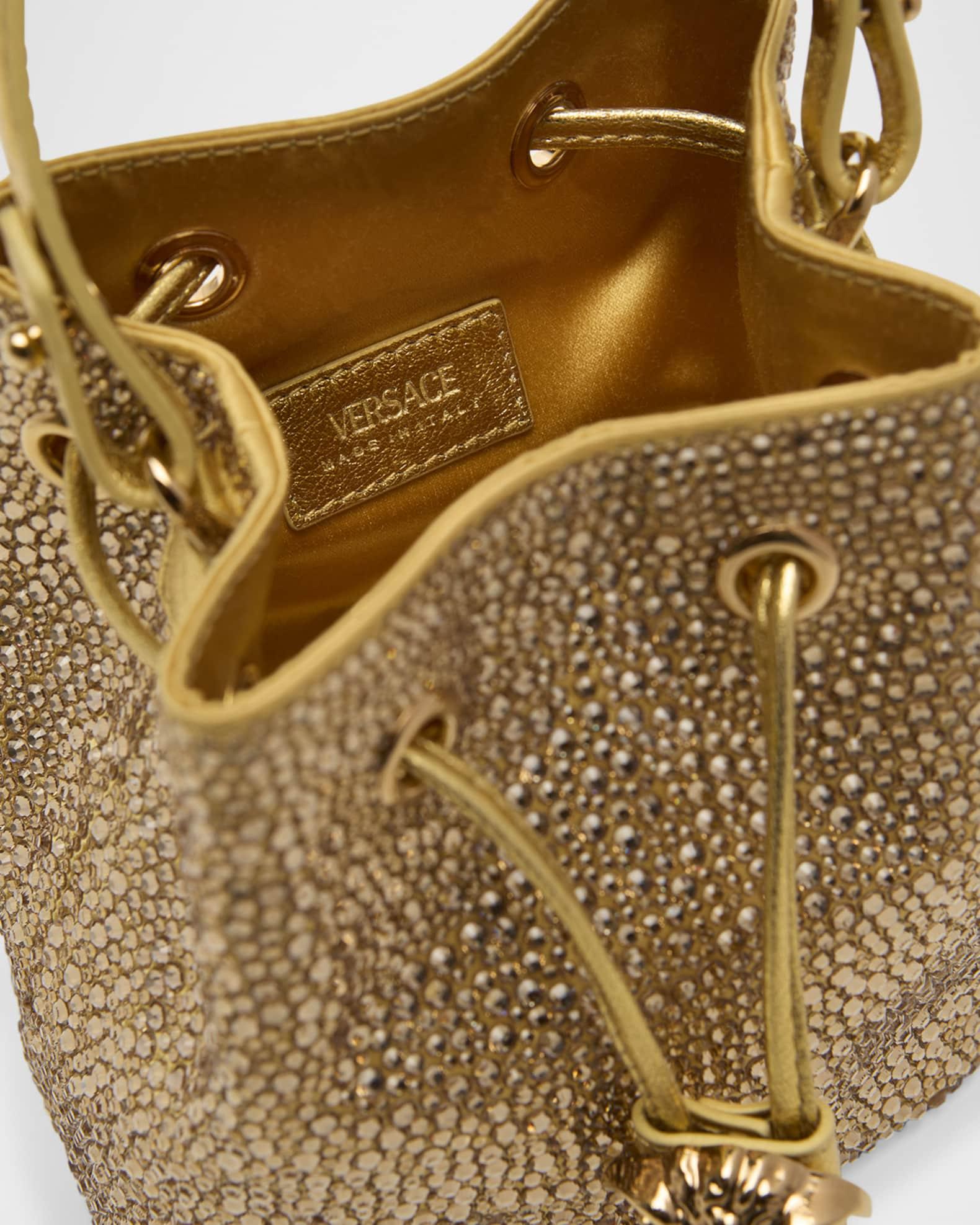 Versace "La Medusa" bucket bag in embellished fabric Top handle Detachable chain crossbody strap Can be worn as a top handle or crossbody bag Drawstring closure with Medusa head hardware Feet protect bottom of bag Approx. 5.9"H x 5.3"W x 3.9"D Made in Italy