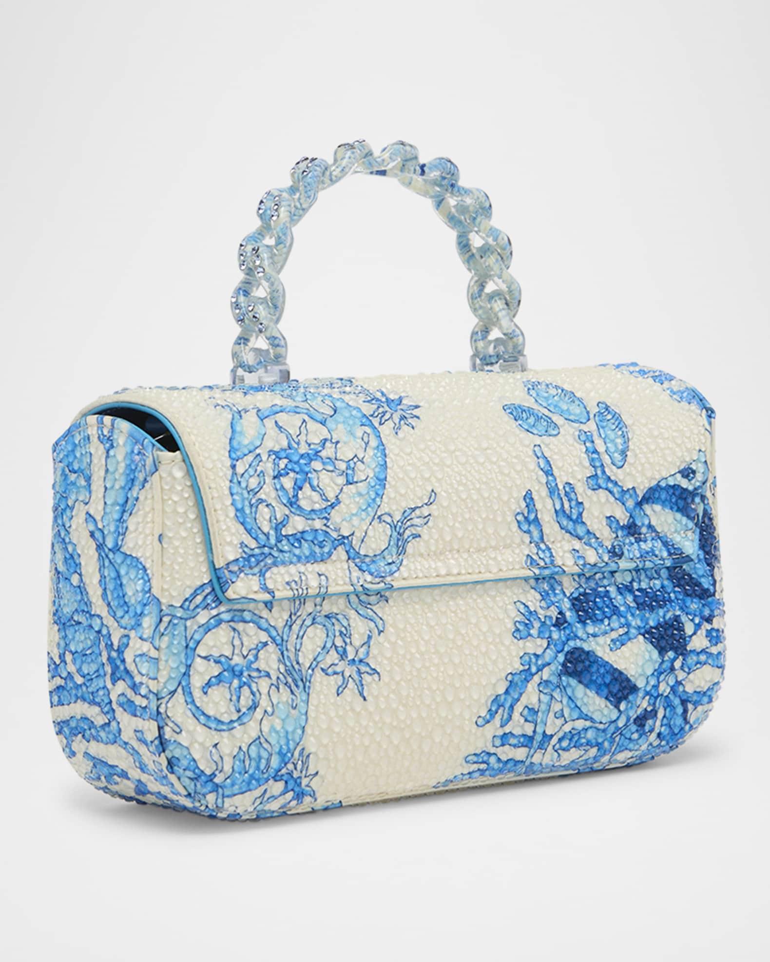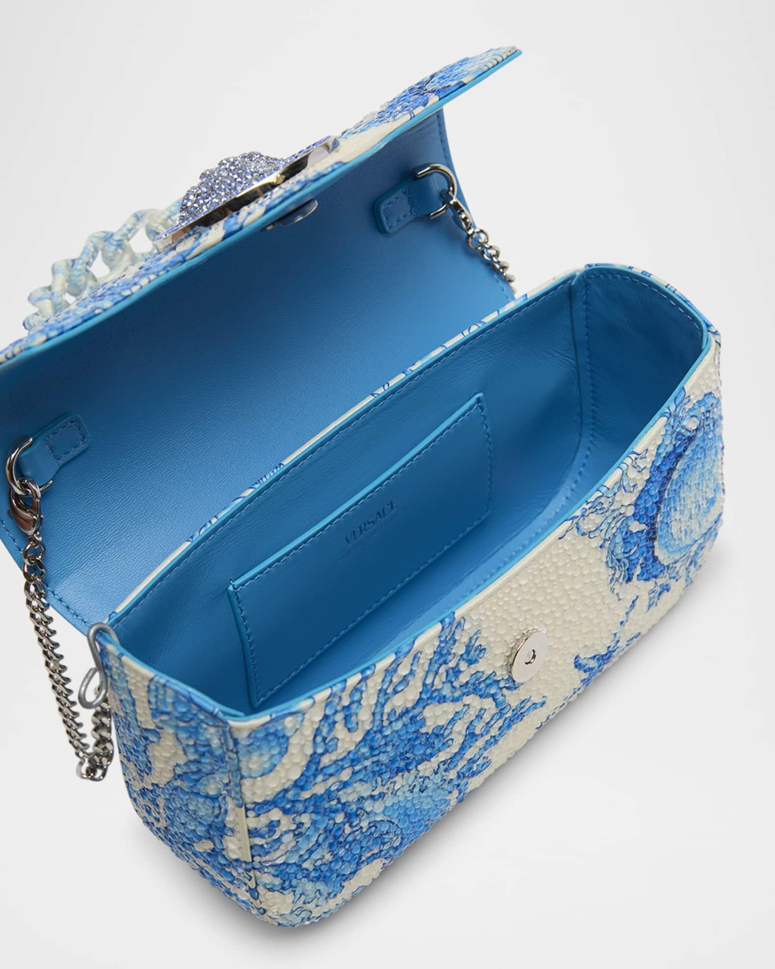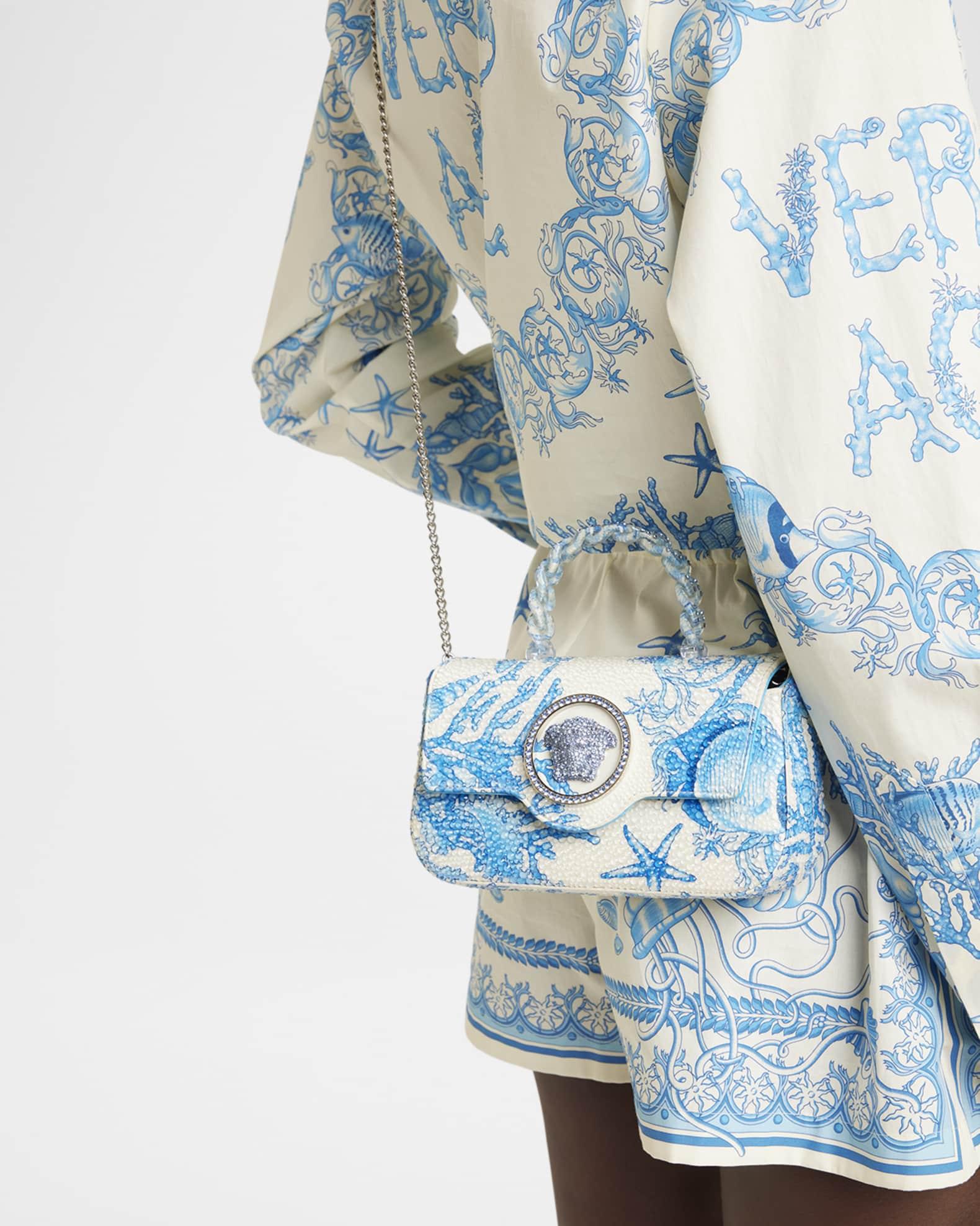 Versace "La Medusa" top handle bag in sea life embellished fabric Features signature Medusa head Twisted top handle Detachable chain crossbody strap Can be worn as a top handle or crossbody bag Flap top with magnetic closure Interior, one card slot Approx. 4.7"H x 7.5"W x 2"D Polyester Made in Italy