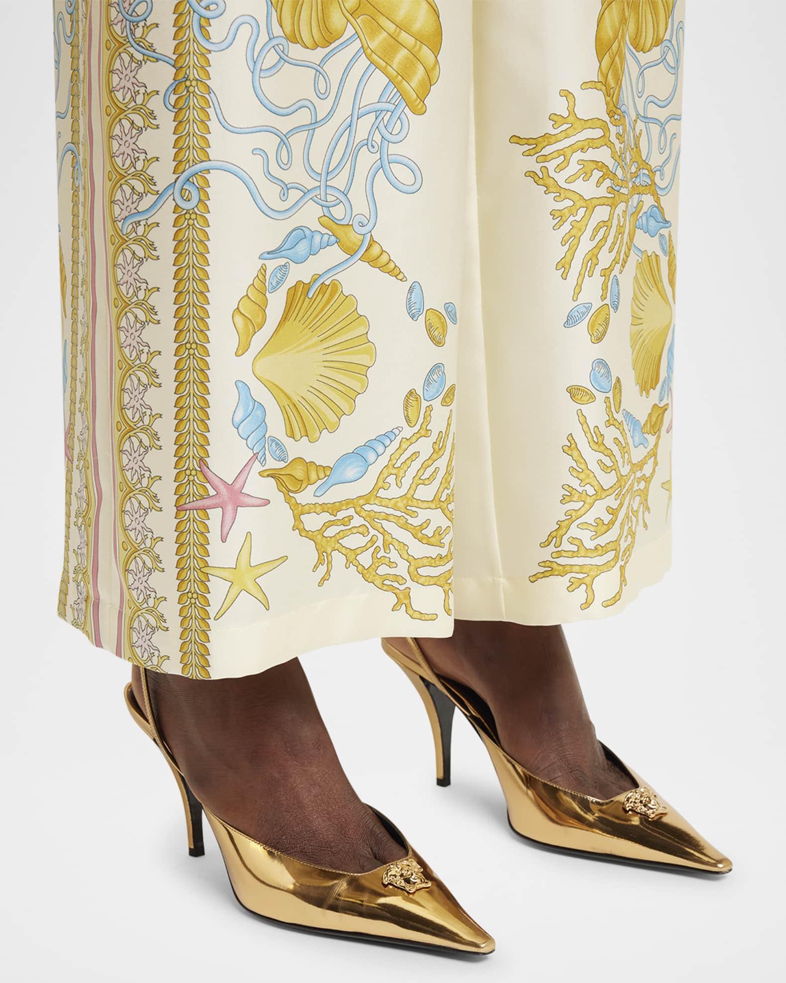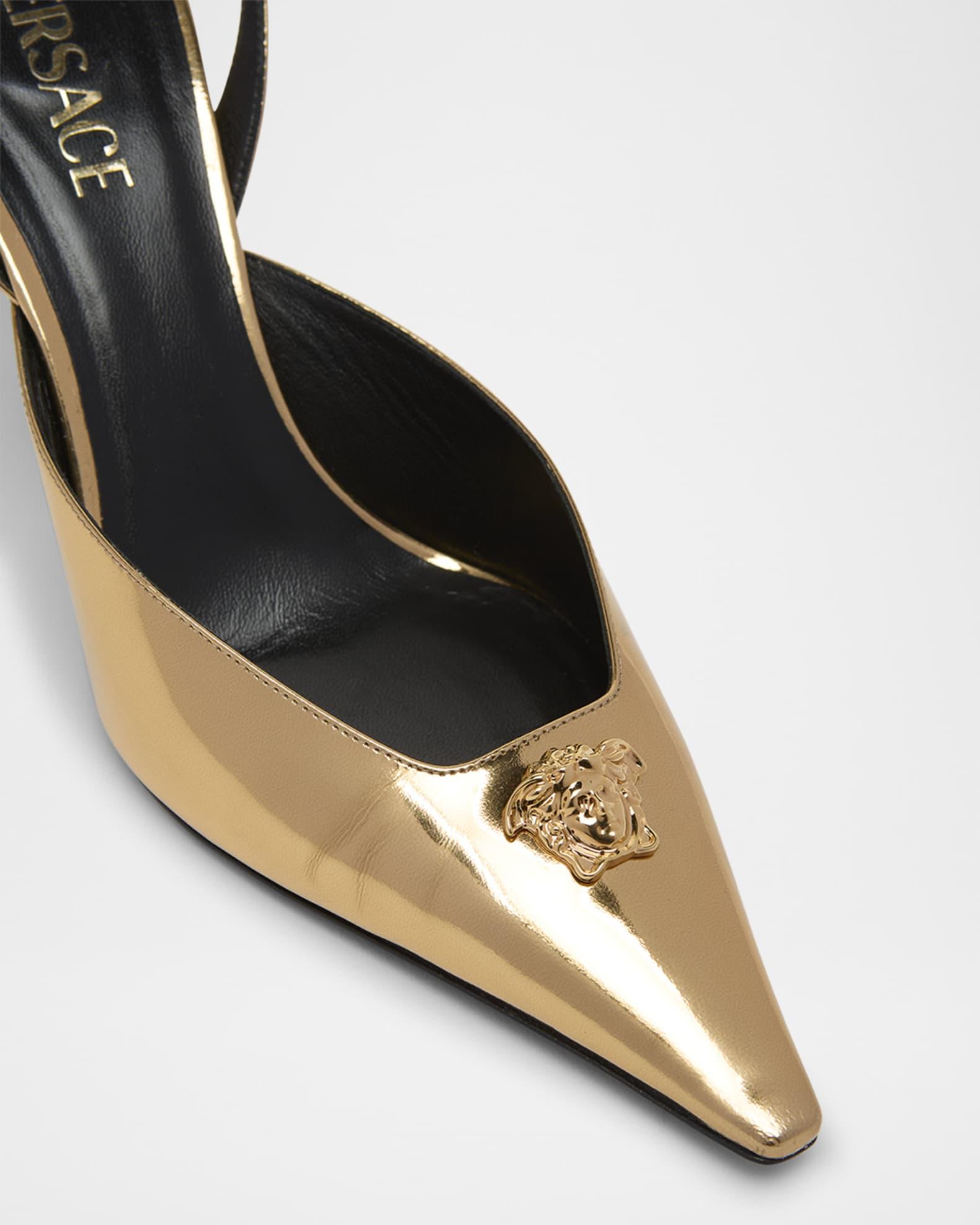 Versace shiny patent leather pumps with signature Medusa accent 3.25 in / 85 mm stiletto heel Pointed toe Adjustable ankle strap Leather outsole Lining: Leather Spot clean Made in Italy