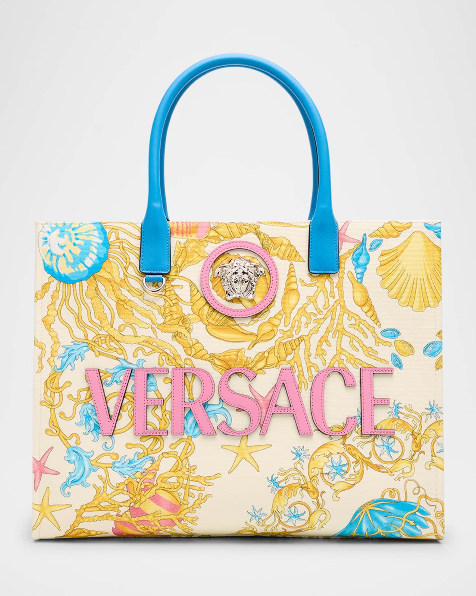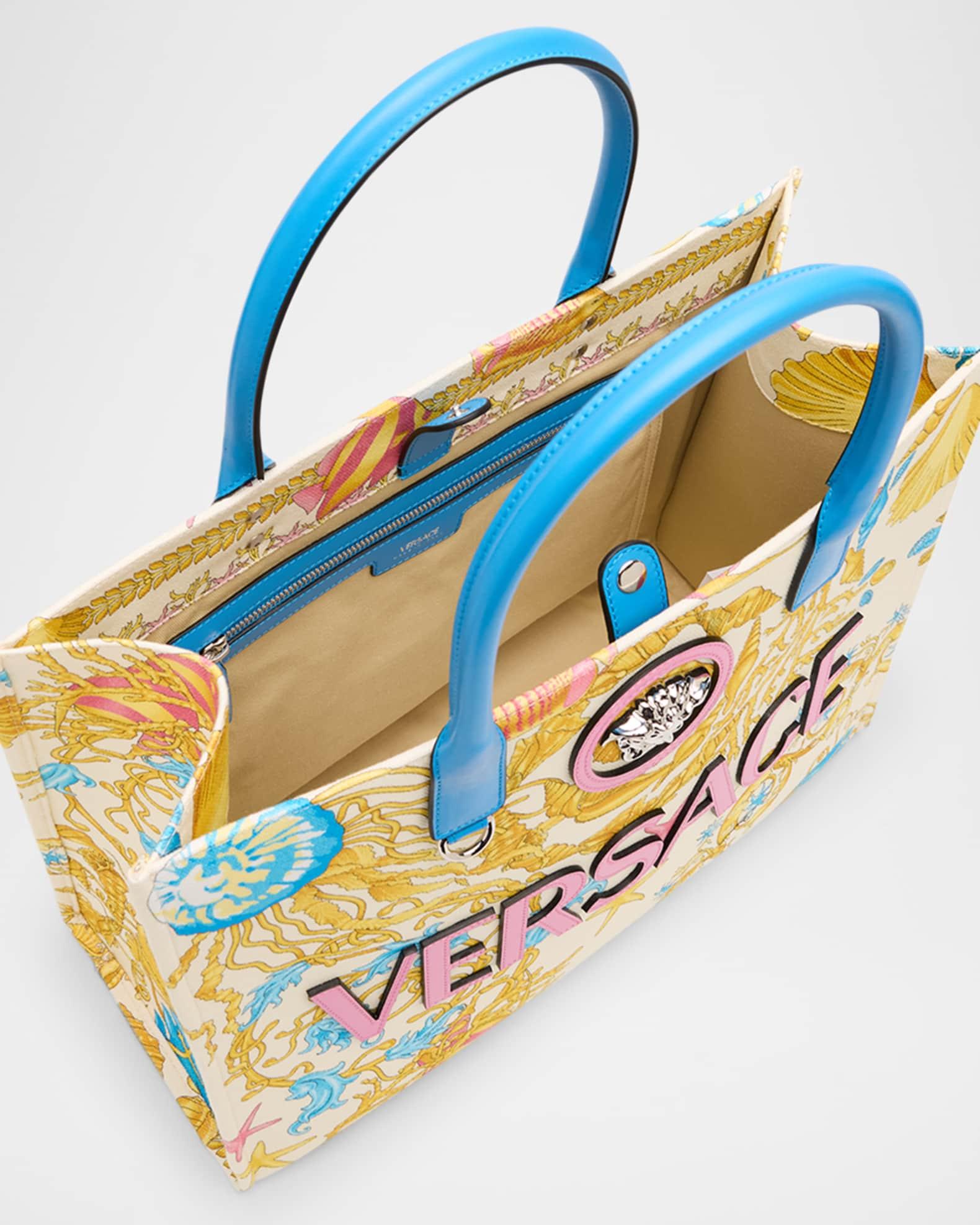 Versace "La Medusa" tote bag crafted in a bright sea life printed cotton fabric with smooth calf leather details Features the signature Medusa head accent Rolled top handles Open top with center snap strap closure Interior, one zip pocket Approx. 11.8"H x 15.7"W x 6.3"D Made in Italy