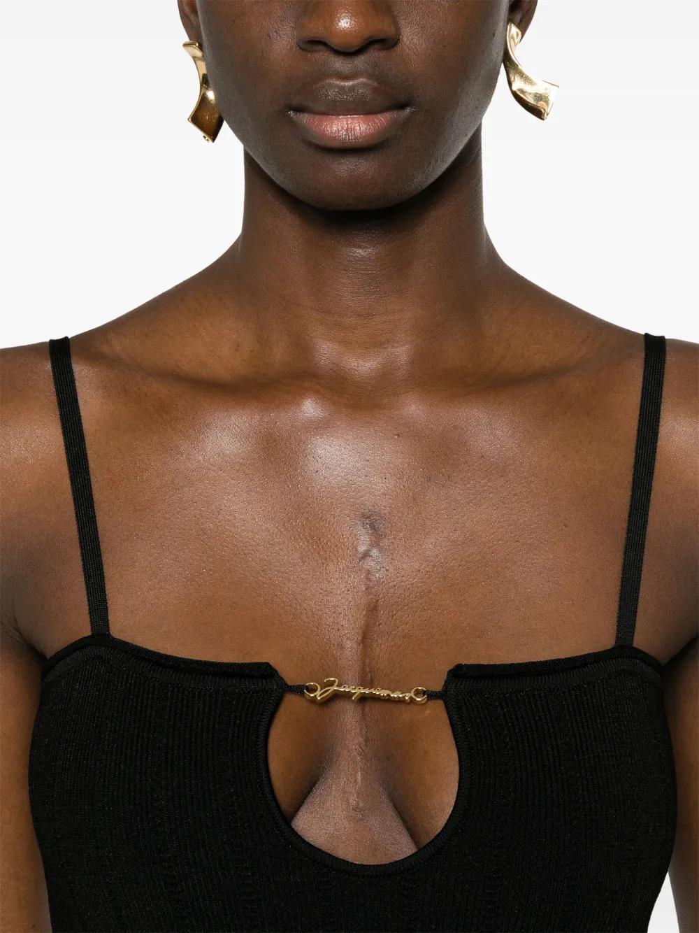 A brand icon, Jacquemus' logo plaque embellishes the front of this black Sierra dress, accentuating the plunging neckline. It's crafted in Italy from finely ribbed fabric, boasting a languid midi silhouette.
