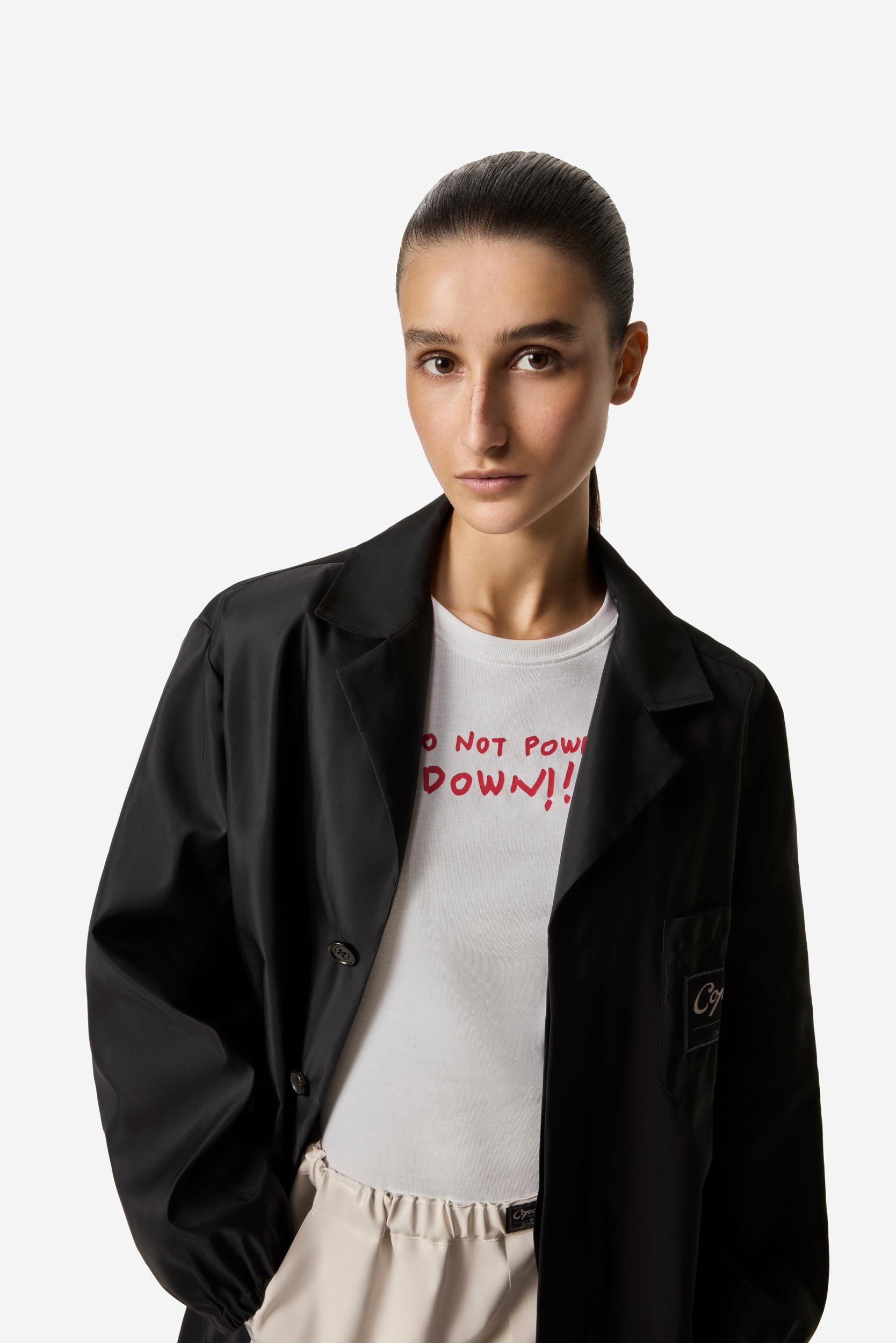 Drawn to ground-breaking technologies and how they can fuse with fashion, Coperni designers looked to the Geneva-based science organisation CERN, home of the Large Hadron Collider as a springboard for a collection centred around the day-to-night looks of a female researchers and physicists. Crafted from recycled high-performance material and lined with soft cotton, this black coat has the loose look of a classic lab coat. It is finessed with a large Coperni logo patch with a vintage graphic design.