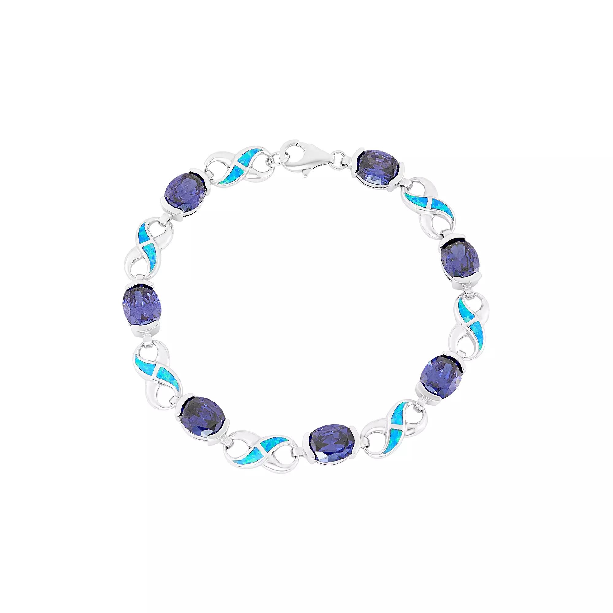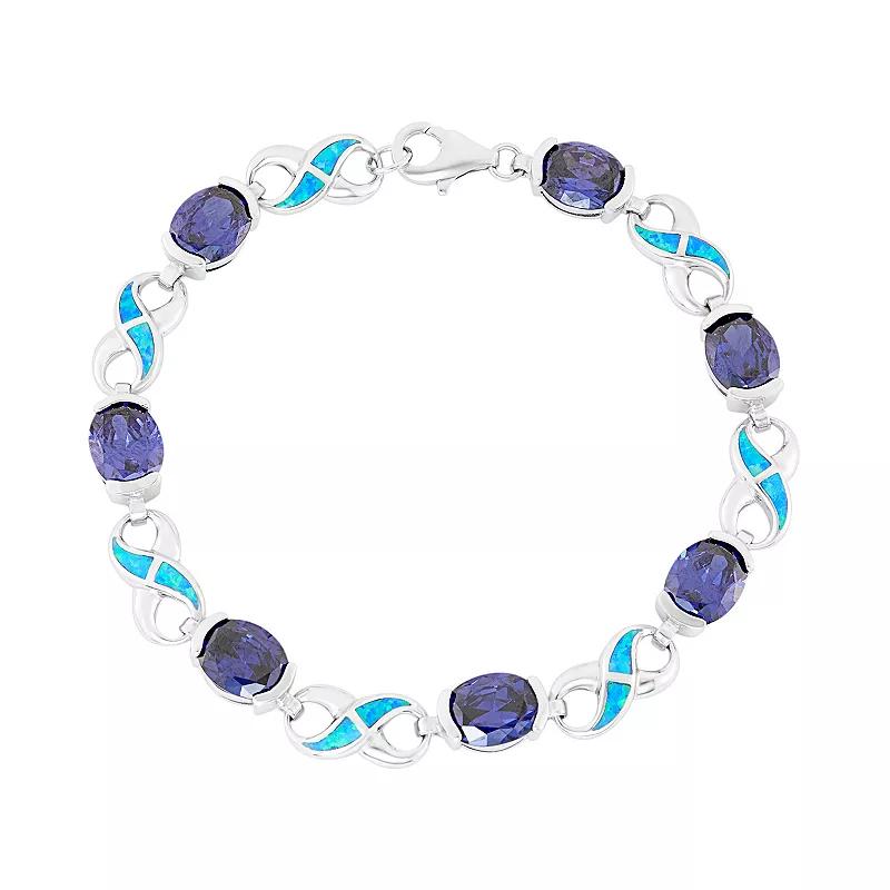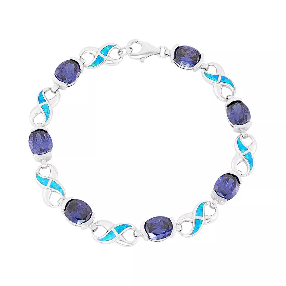 Featuring lab-created blue opals set within infinity links, and shimmering blue cubic zirconia stones, this sterling silver bracelet offers unsurpassed beauty. Comes in a gift box.BRACELET DETAILS Length: 7.5 in. Clasp: lobster-claw Metal: rhodium-plated sterling silver STONE DETAILS Stone type: lab-created blue opal Setting: inlay CUBIC ZIRCONIA DETAILS Shape: oval Color: blue Setting: bezel Size: 7.5. Color: Multicolor. Gender: female. Age Group: adult.