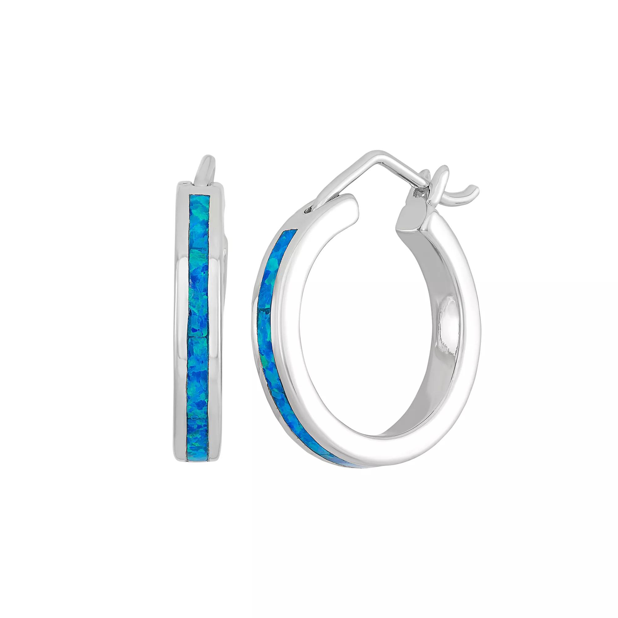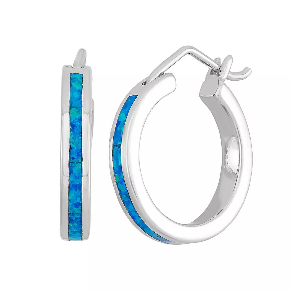 Featuring stunning lab-created blue opal inlays, these hoop earrings offer eye-catching style. Comes in a gift box. EARRING DETAILS Length: .78 in. Backings: click-it Metal: rhodium-plated sterling silver STONE DETAILS Stone type: lab-created blue opal Setting: inlay Size: One Size. Gender: female. Age Group: adult.