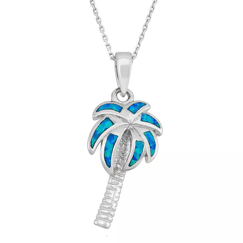 Add tropical charm to your jewelry collection with this sterling silver necklace. A palm tree pendant with lab-created blue opal inlays makes it the perfect choice for your warm-weather ensembles. Comes in a gift box.PENDANT DETAILS Pendant length: 1.33 in. Chain length: 18 in. Clasp: spring-ring Metal: rhodium-plated sterling silver STONE DETAILS Stone type: lab-created blue opal Setting: inlay Size: 18. Gender: female. Age Group: adult.