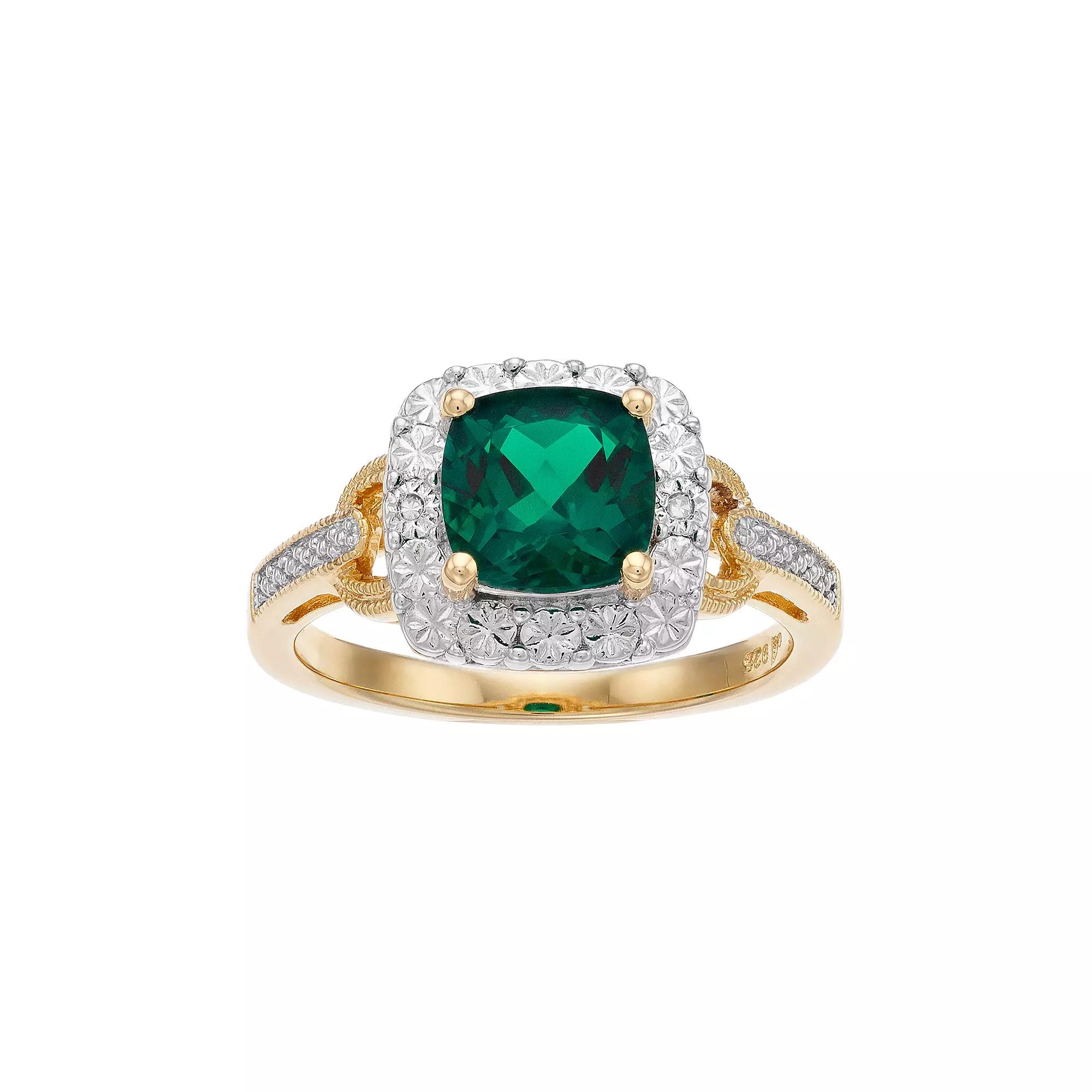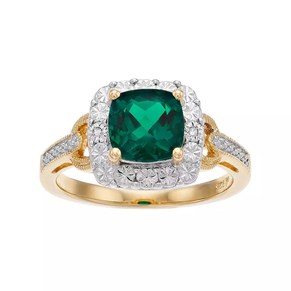 A lab-created emerald gemstone serves as the focal point to this radiant halo ring, while diamond accents add eye-catching style.RING DETAILSWidth: 0.44 in.Metal: sterling silverPlating: 14k goldFinish: polishedPackaging: boxedSTONE DETAILSStone type: lab-created emeraldTotal weight: 1 3/8 ct.Center stone size: 7 mm x 7 mmShape: cushion-cutSetting: prongDIAMOND DETAILSTotal weight: less than 1/10 ct.Shape: roundColor grade: IJClarity: I2-3Setting: bezelImage(s) may be enlarged to show detail.Diamond weights are approximate. Diamond total weights may vary between .01 and .08 ct. Some diamonds have fewer than 17 facets.Gemstones may have been treated to enhance their appearance. Special care may be required. Please visit our Gemstone Treatment & Special Care Guide for more information. Color: Gold Tone. Gender: female. Age Group: adult. Material: Gold Over Sterling.