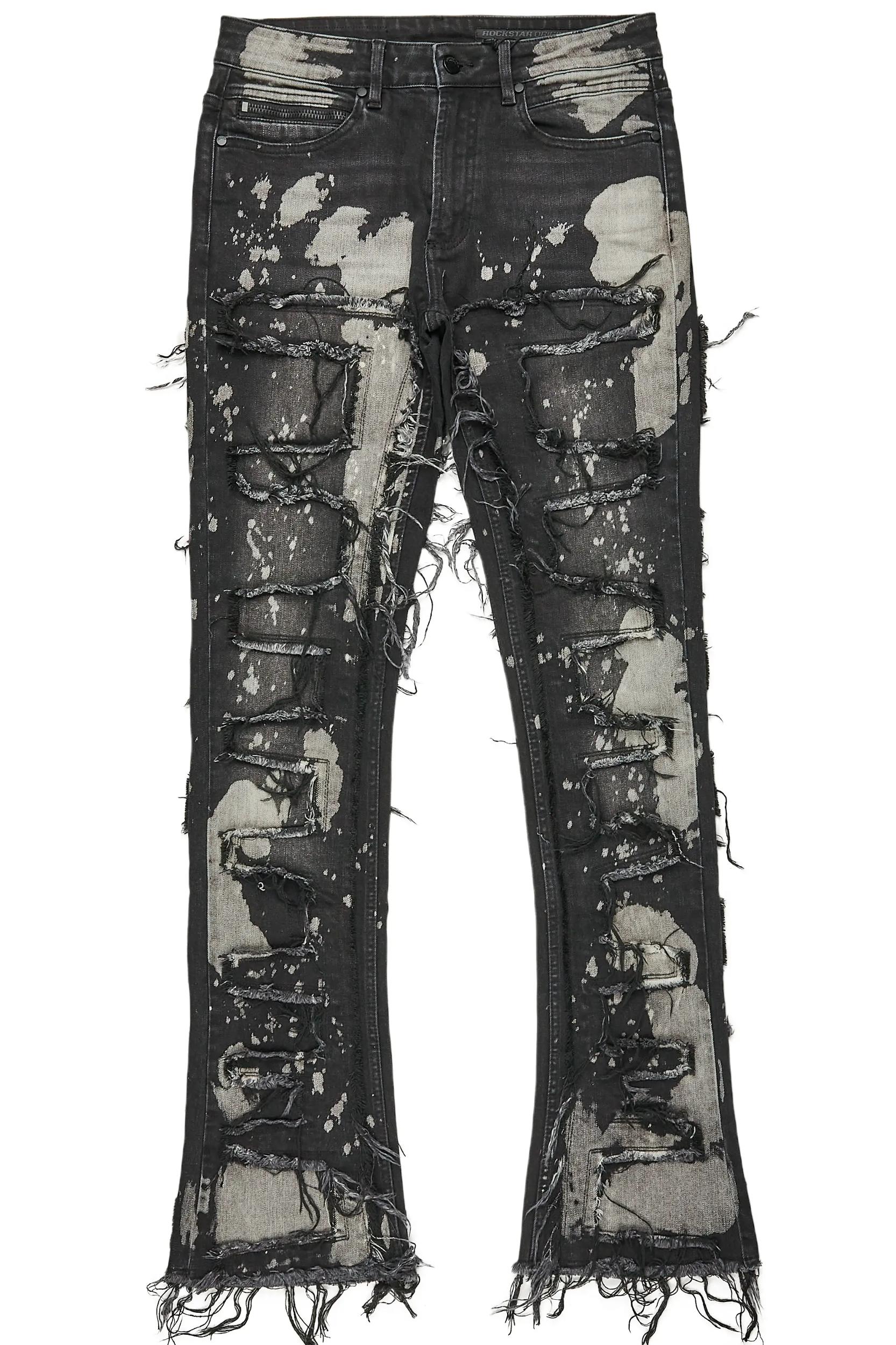 An urban stacked flare denim jean for men in black beach. Designed with organic cotton and extra long legs for an essential streetwear style. Zip fly with button closure 5-pocket build Distressed detailing Stacked construction Frayed patterned seams Flared leg openings 35.75" seams *NOTE: These jeans are purposefully designed with extra long legs so the fabric properly bunches at the hem, creating the stacked flare style.