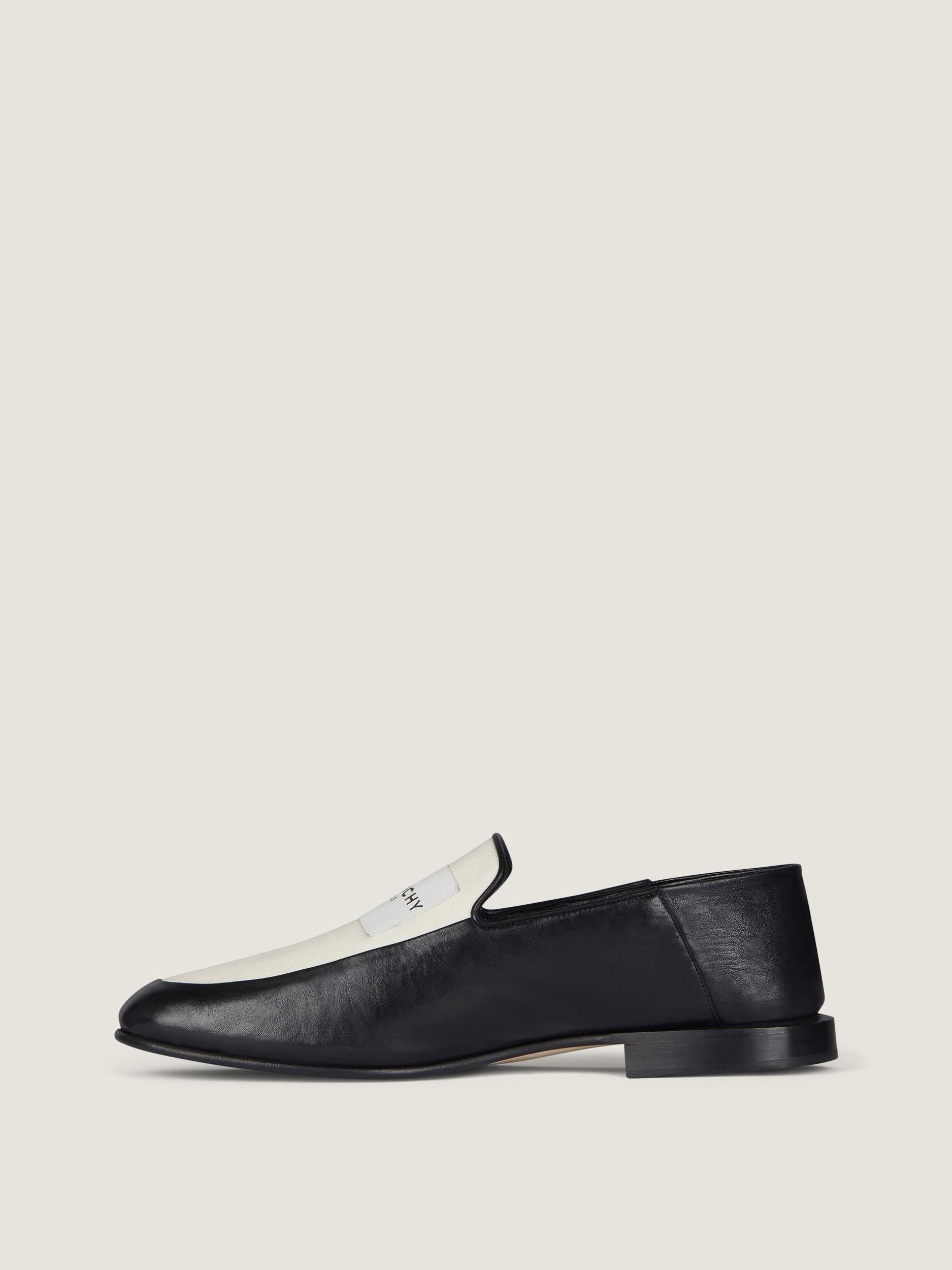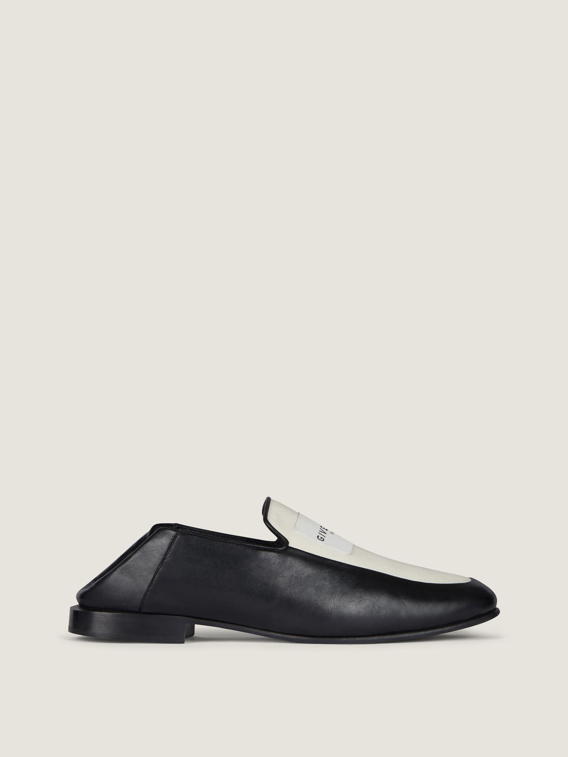 Loafers in shiny lambskin and cotton canvas. Label line. GIVENCHY Paris leather label with jacquard effect stitched on the top. GIVENCHY signature debossed on the leather insole. Almond toe shape. Folding back to be worn as slippers. Water-repellent fabric label and easily washable.
