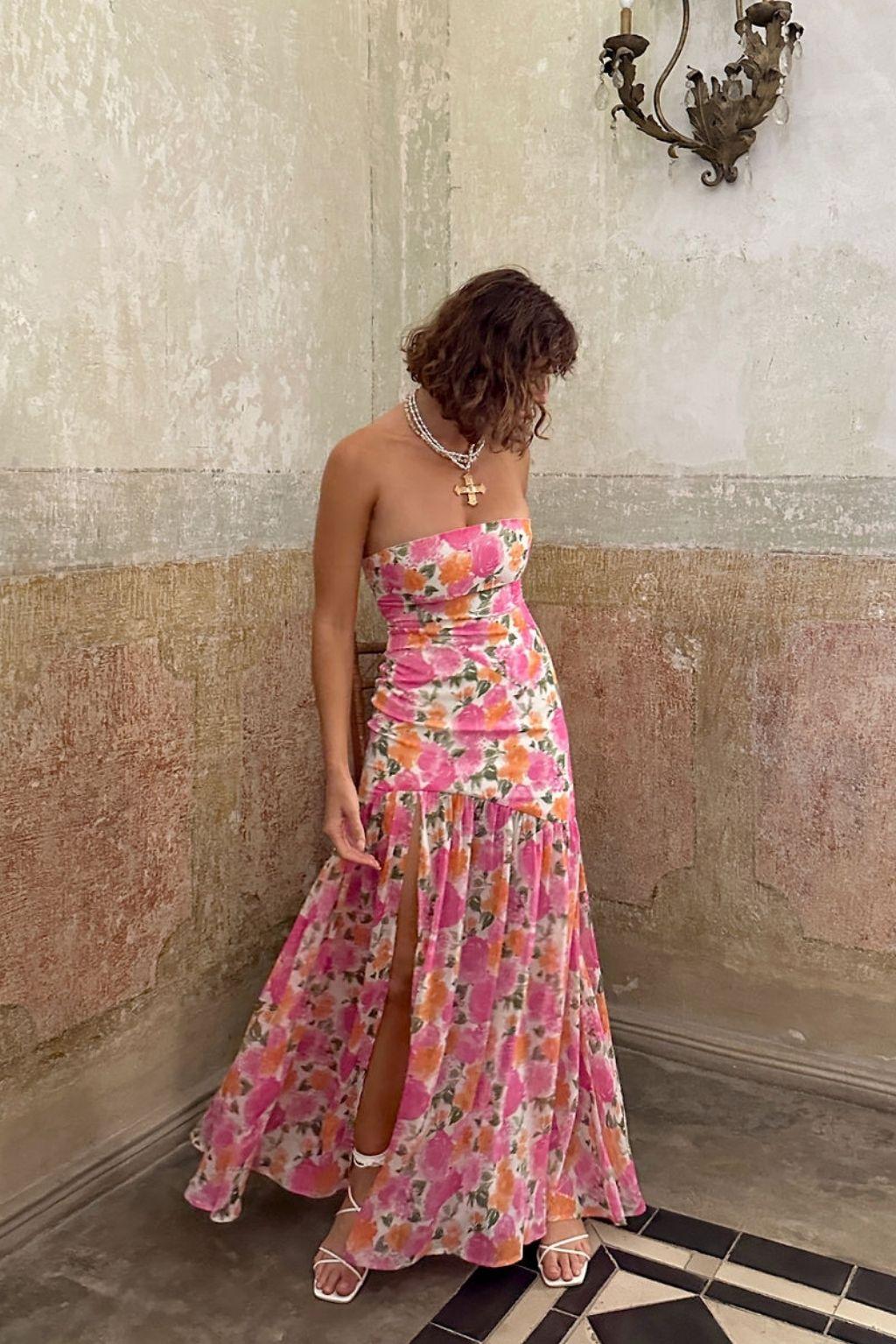 We're dreaming in florals this summer in the best selling LaBelle Strapless Pink Floral Maxi Dress. With a maxi silhouette, fitted body and flowy skirt with a slit the LaBelle is so effortless flirty and cute. Pair with your favorite accessories and wear this cutie to all your special occasions this summer.