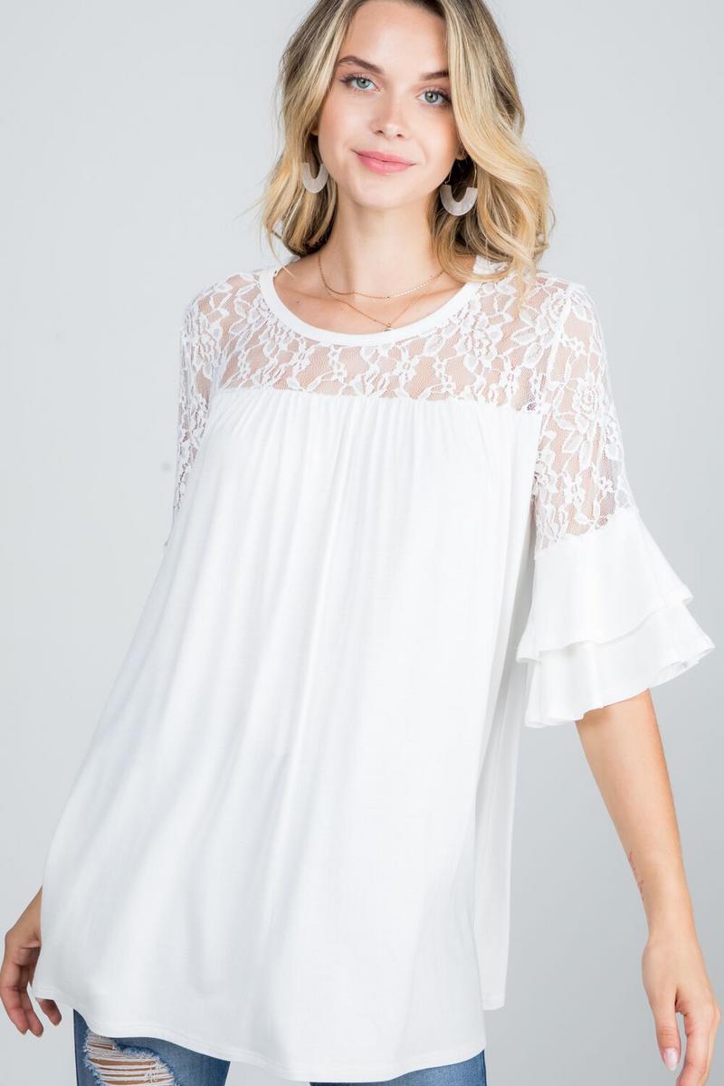 This beautiful lace top adorned with ruffle tiered sleeves is a great way to add a touch of elegance to any outfit. The lightweight fabric makes it comfortable and perfect for any occasion. Fabric 50% polyester 38% cotton 12% rayon