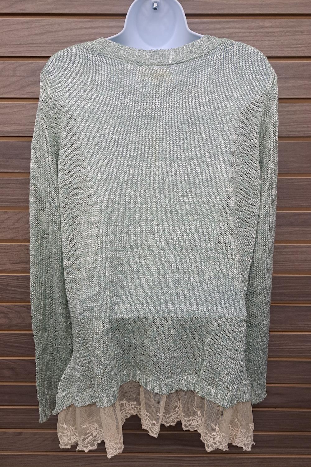 This light green sweater is made with a luxuriously soft material and decorated with a beautiful lace bottom. It's the perfect way to dress up any outfit with a touch of femininity. The lightweight fabric will keep you cozy in cool weather, while the delicate lace adds allure.