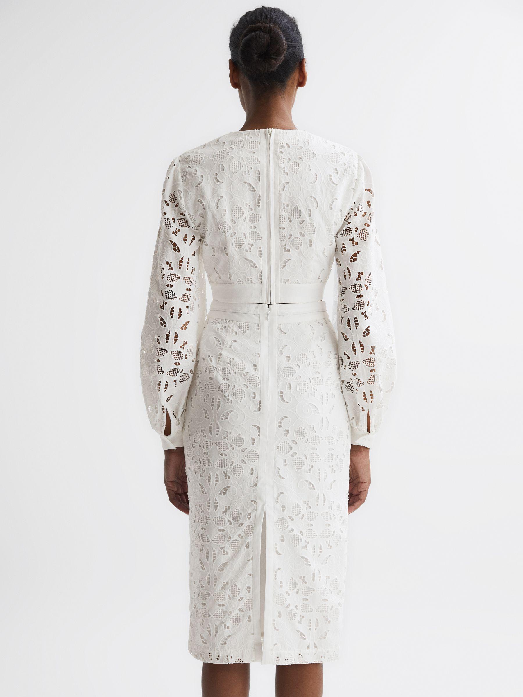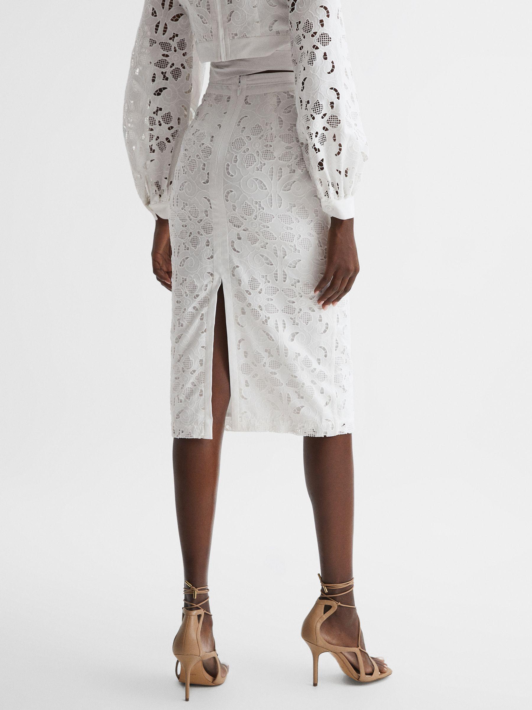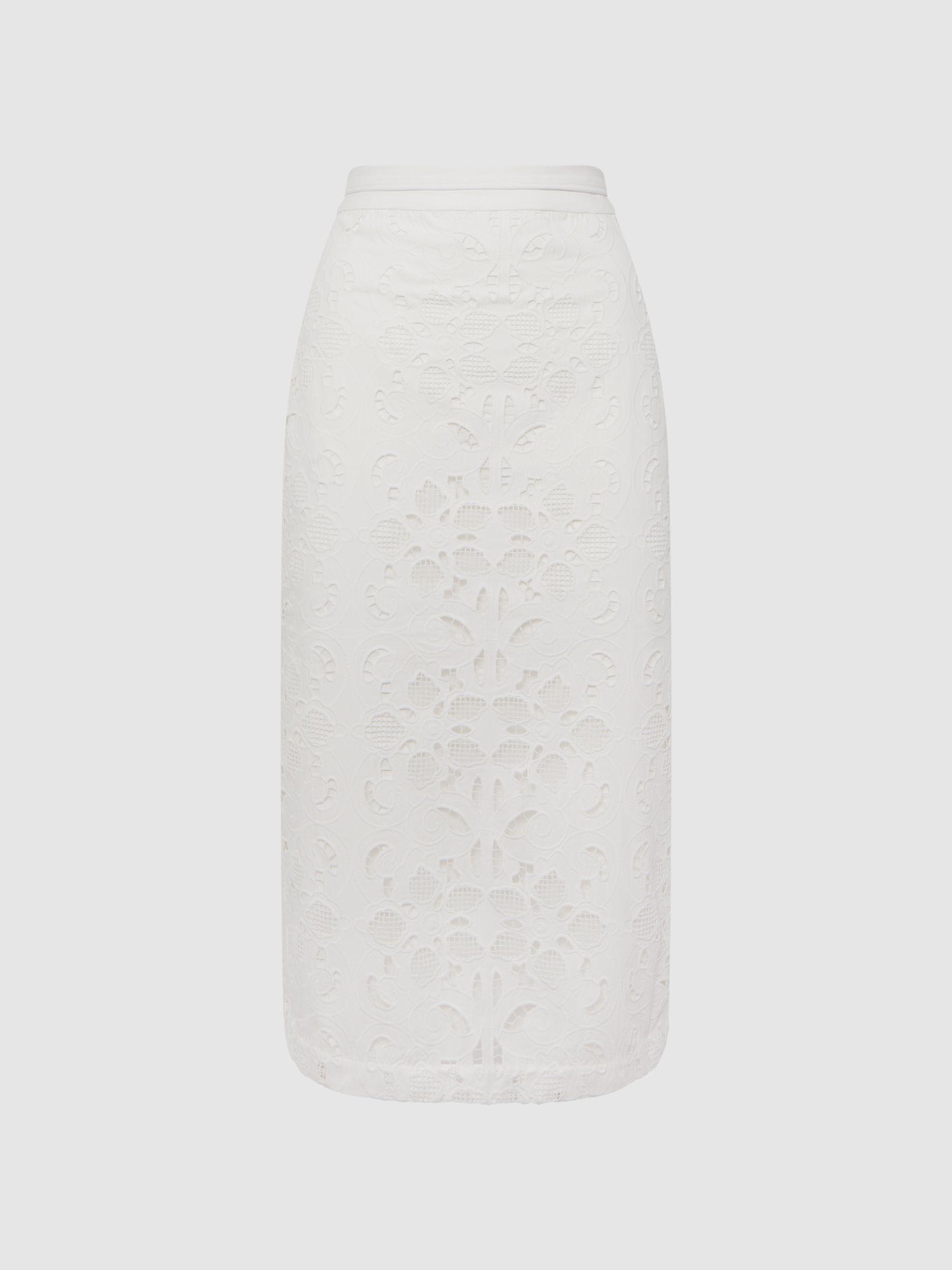 The Immi midi skirt in white gives a feminine touch to your occasionwear rotation. It’s crafted from 100% cotton into a lace design, and features a sophisticated slip to the reverse. Opt for the co-ordinating top, or tuck in a plain blouse to make this skirt the centre piece. 100% cotton. Lace design. High rise. Midi length. Slip to reverse. Zip closure to reverse. Fitted. The model is wearing a size 8.
