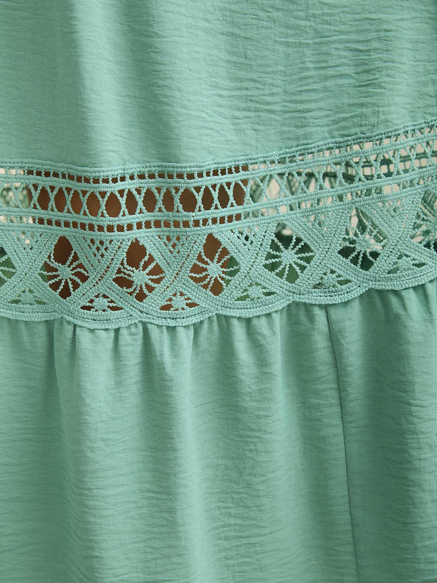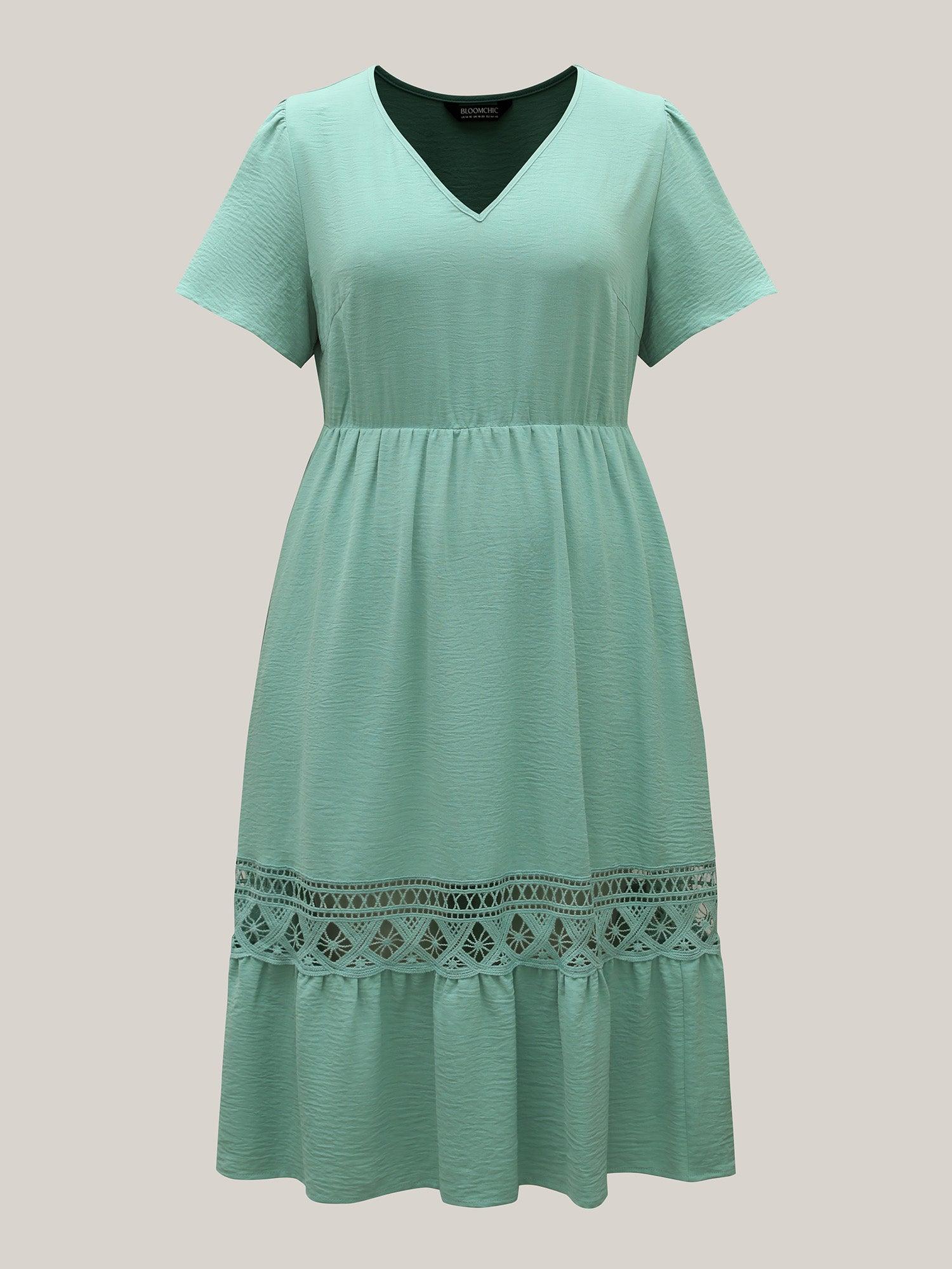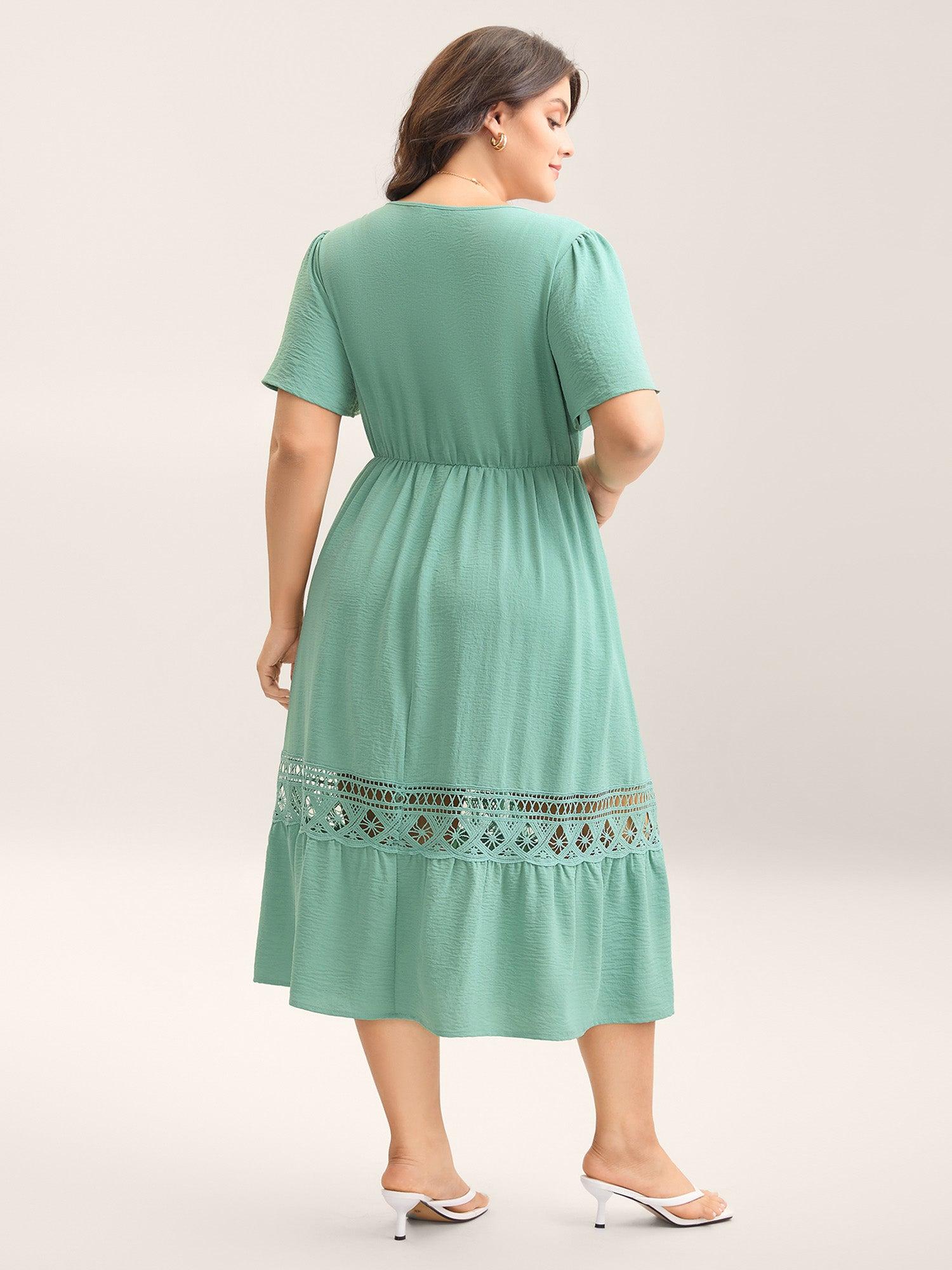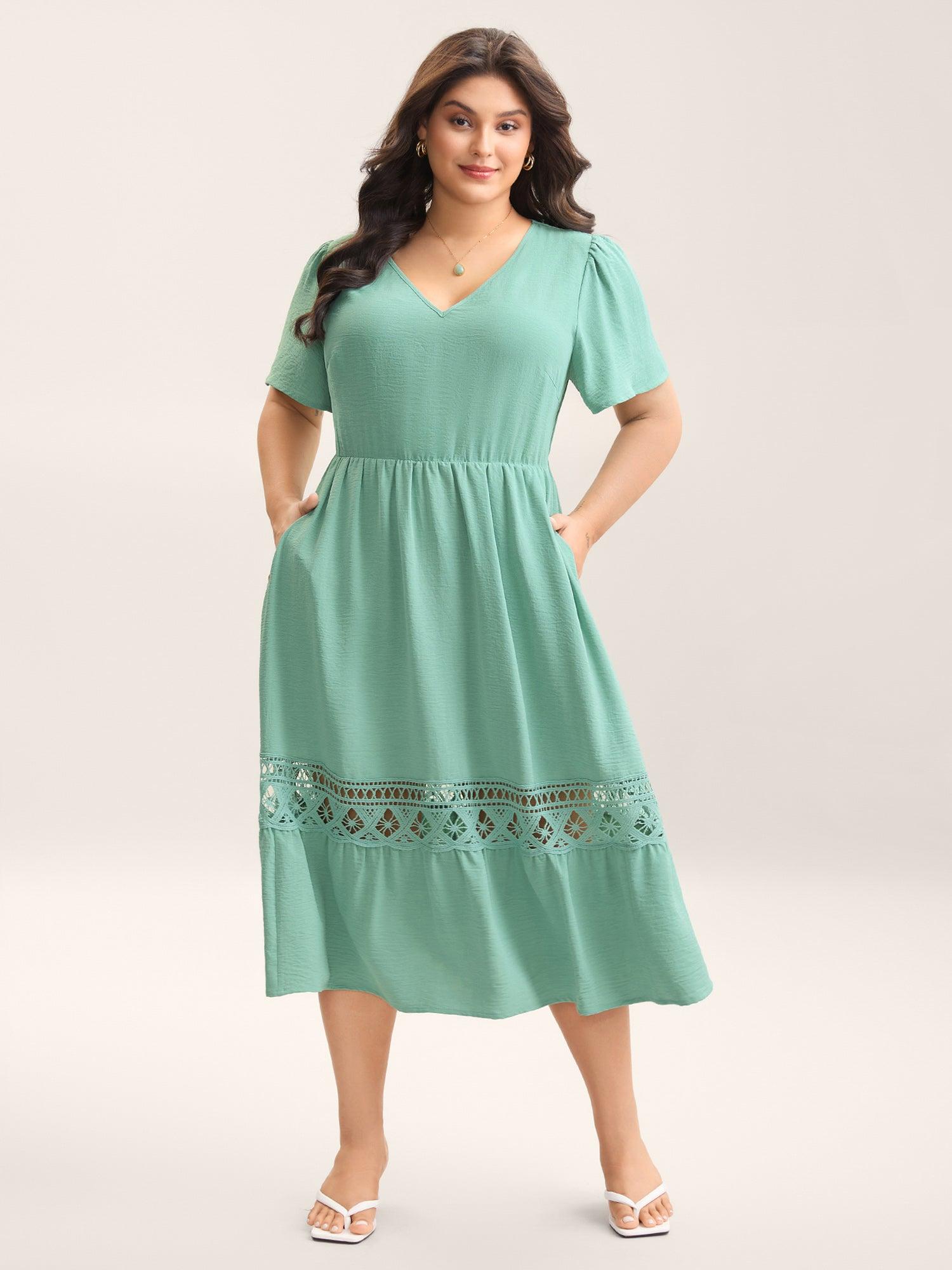 Shop Lace Cut-Out Lotus Leaf Sleeve Midi Dress now and redefine your style with confidence at BloomChic. Tailored for mid and plus-size women. This trendy Dress, sizes 10-30. You can never go wrong with BloomChic Dresses. Color:Greenbean;Style:Elegant;Neckline:V-neck;Sleeve Type:Ruffle Sleeve;Prints:Non;Details:Woven ribbon&lace trim;Pocket:Side seam pocket;Belt:No-belt;Closure Type:Non
