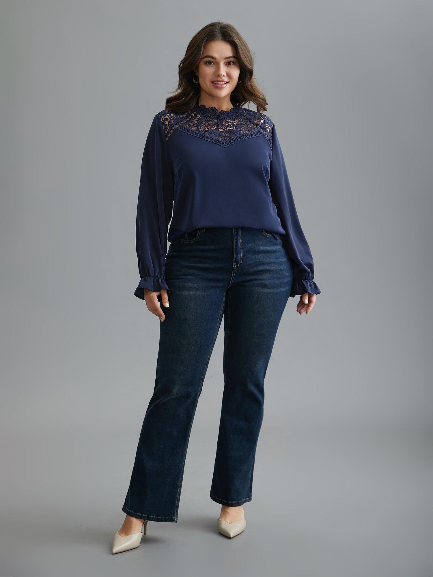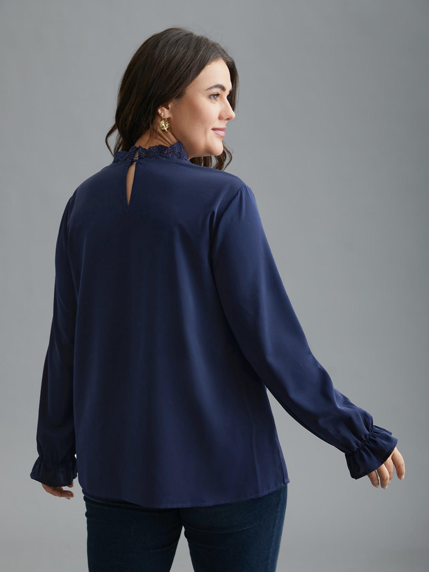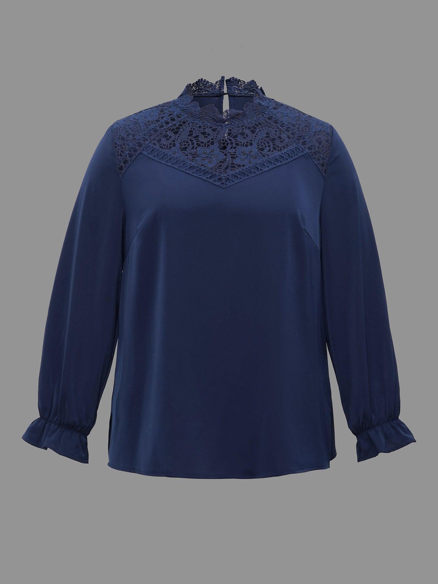 Shop Lace Cut-Out Sheer Stand Collar Blouse now and redefine your style with confidence at BloomChic. Tailored for mid and plus-size women. This trendy Tops Women, sizes 10-30. Season:Winter;Color:Indigo;Style:Elegant;Prints:Non;Neckline:Stand-up collar;Sleeve Type:Lantern Sleeve;Details:Patchwork, Cut-Out, Button;Pocket:No-pocket