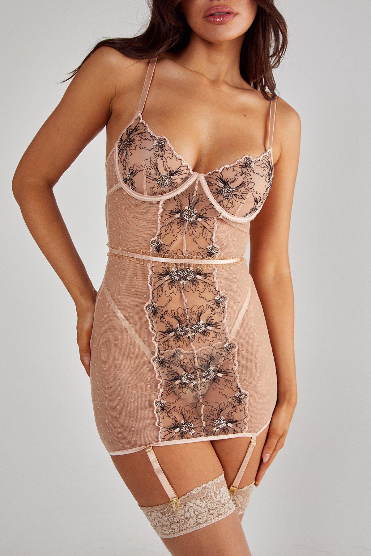 Lace Embroidered Lace Up Back Chemise And Thong Set