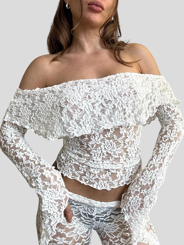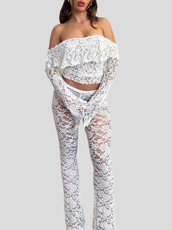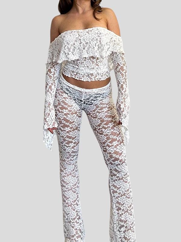 Lace Off Shoulder Long Sleeve Tee & Flared Pants Set