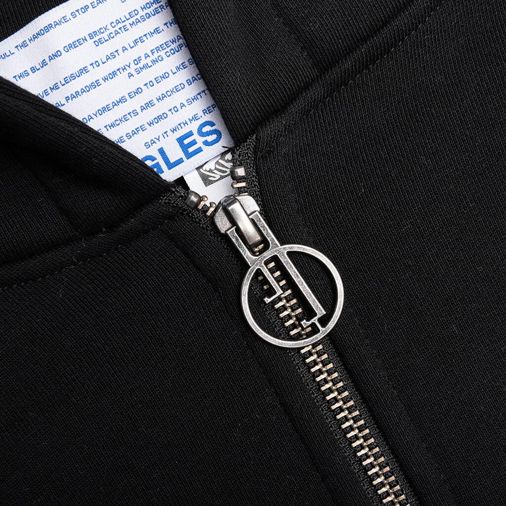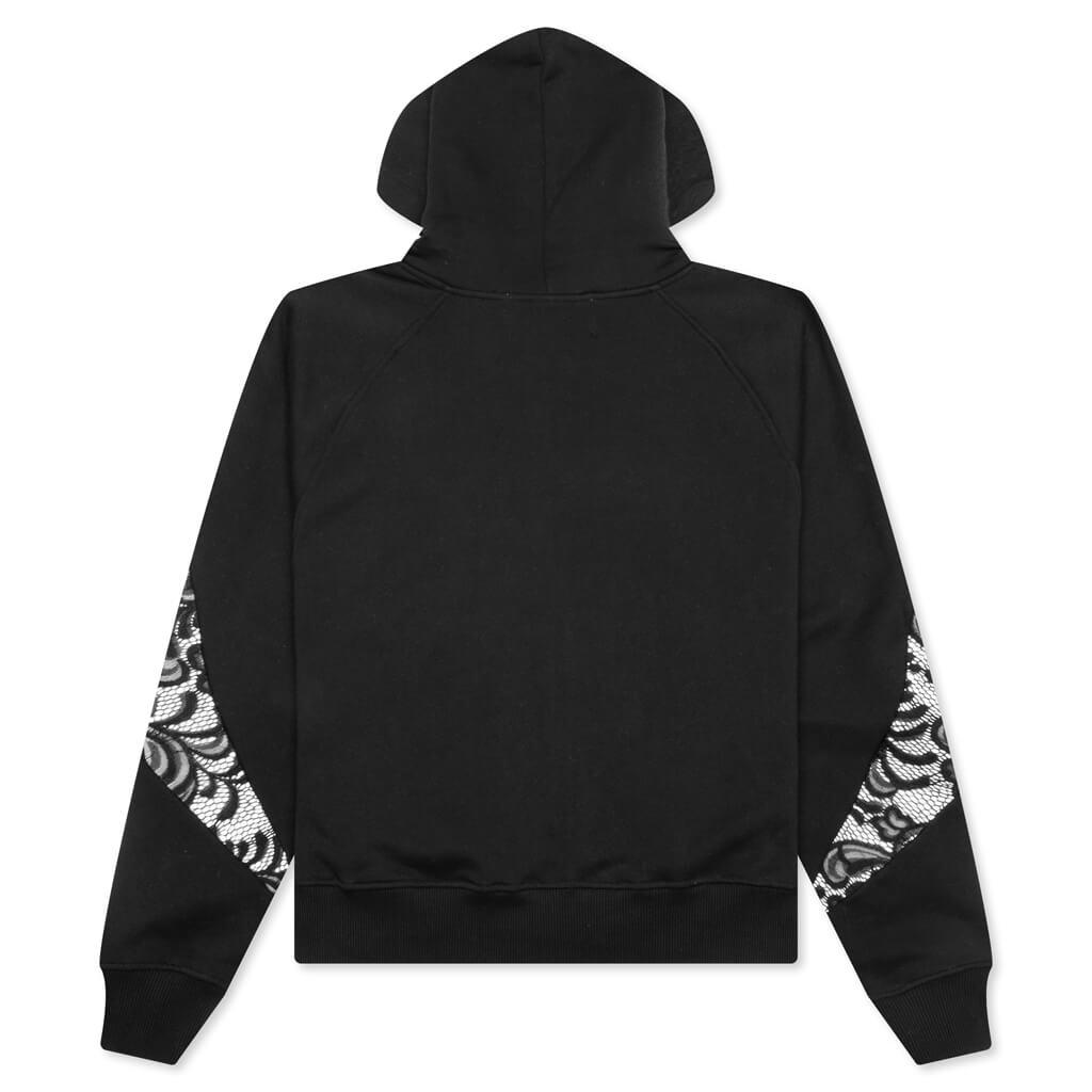 Jungles elevates its outerwear with the Lace Panel Hoodie. The full zip hoodie is constructed from cotton and features contrasting lace panels on the sleeves. Raglan sleeves are placed for an oversized look. Finishing touches include the double-layered hood, ribbed trims, and kangaroo pocket. Heavyweight fleece Metal zip pull Double layer hood Lace panels Ribbed trims Kangaroo pocket Style No: H-LAC-BLK