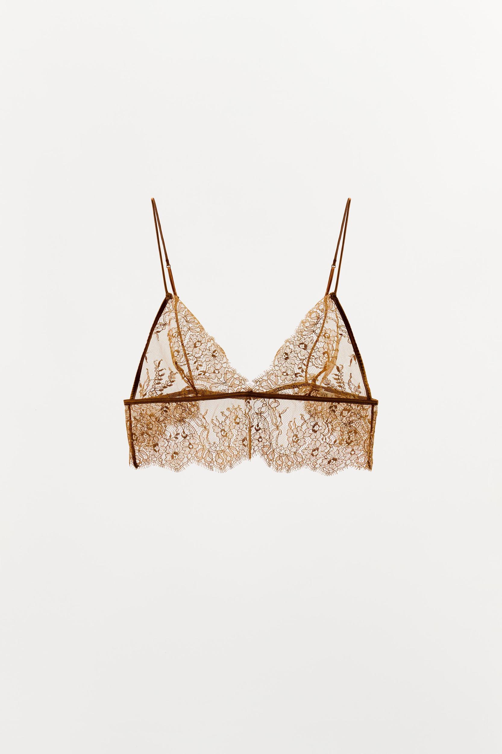 Bralette made of soft lace fabric. V-neck and adjustable thin straps. Back closure with metal hook.