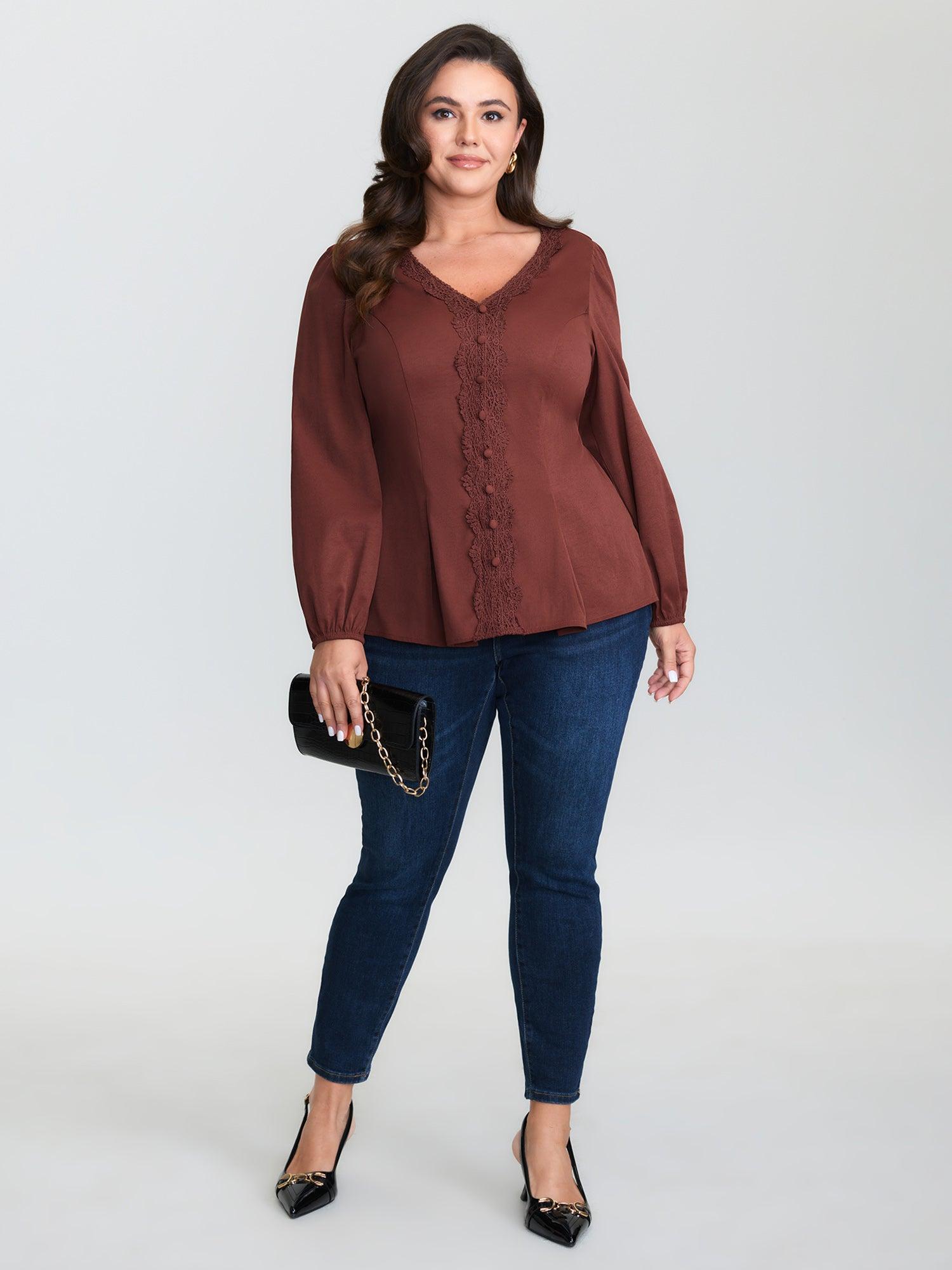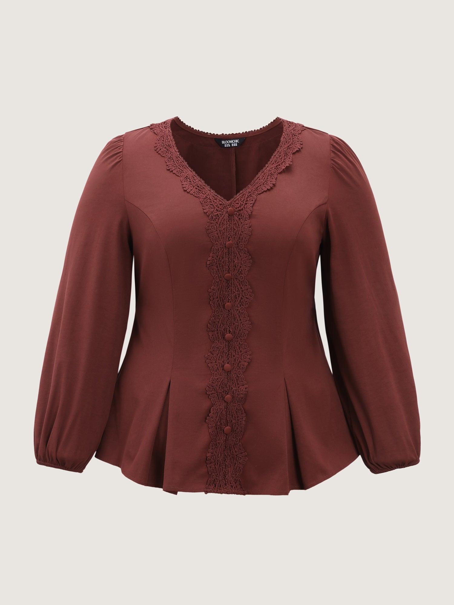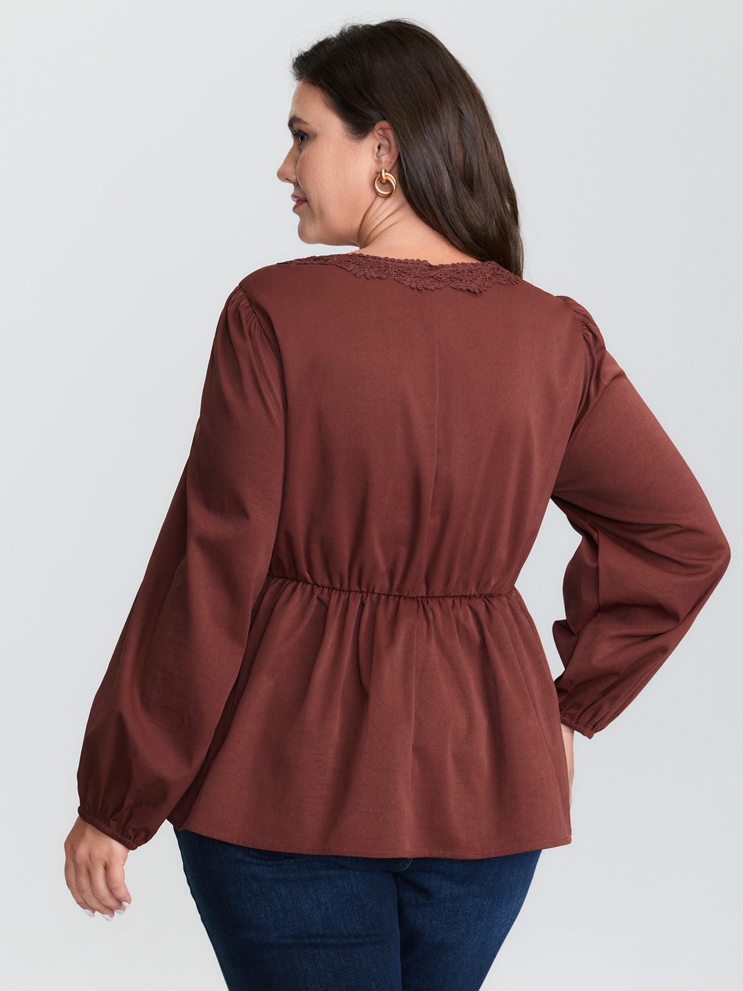 Shop Lace Trim Cinched-Flared Blouse now and redefine your style with confidence at BloomChic. Tailored for mid and plus-size women. This trendy Tops Women, sizes 10-30. Color:Rust;Style:Timeless;Prints:Synthetic texture;Neckline:V-neck;Sleeve Type:Lantern Sleeve;Details:Gathered, Texture, Patchwork;Pocket:No-pocket