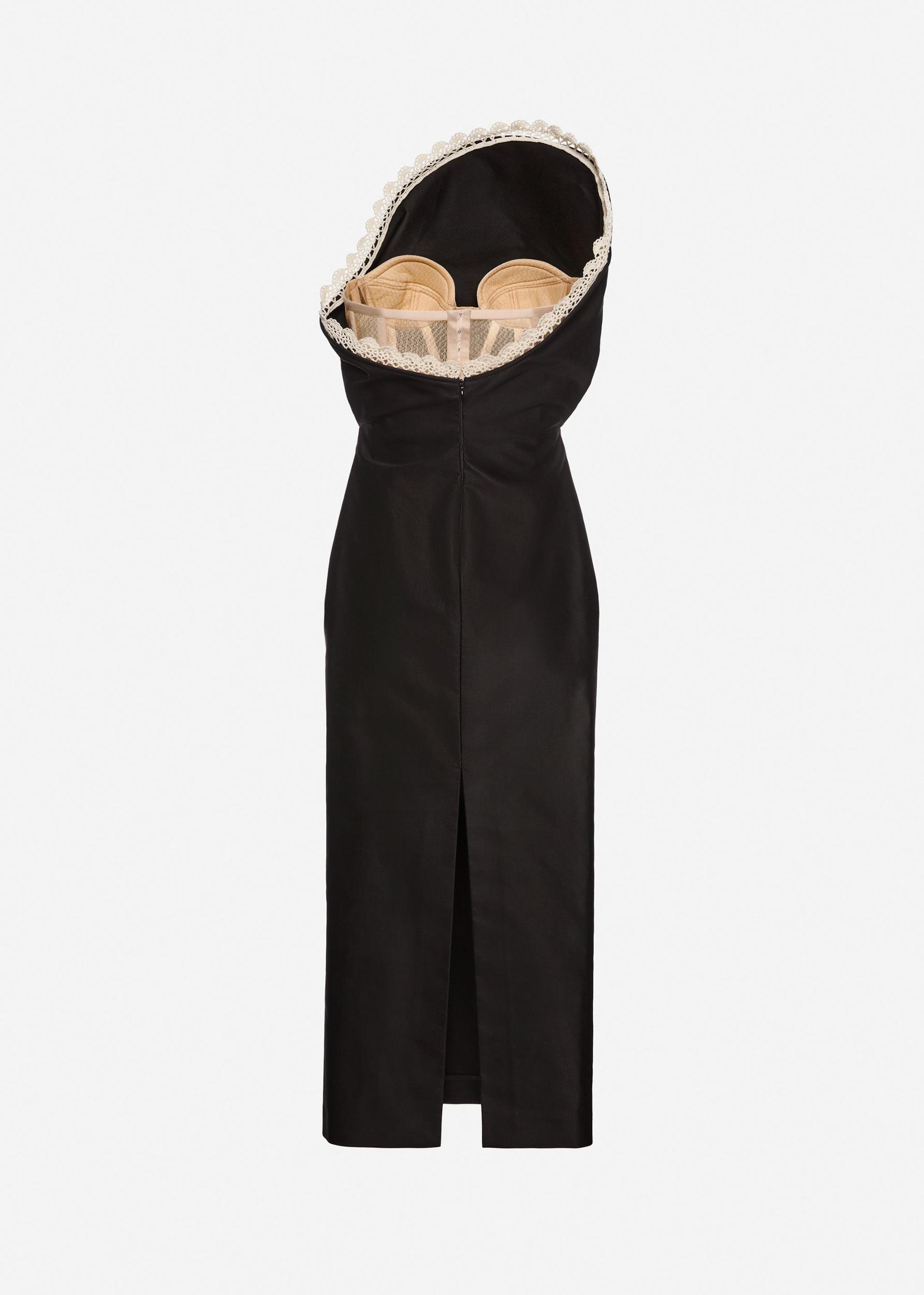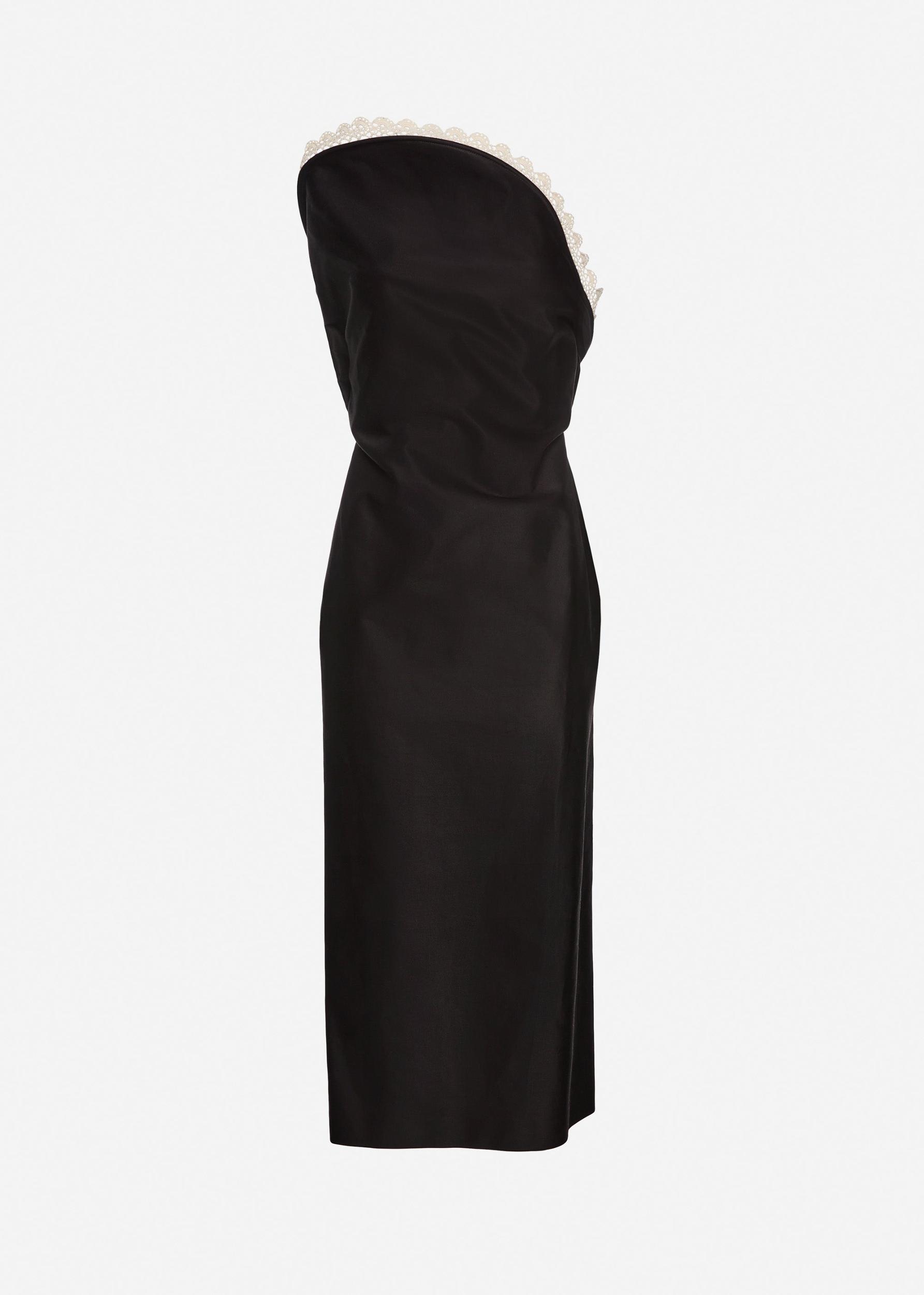 This elegant midi dress has a classic sheath fit with a sculptural 3D shape at the chest that is inspired by a blooming flower, finished with a handmade crochet lace trim.