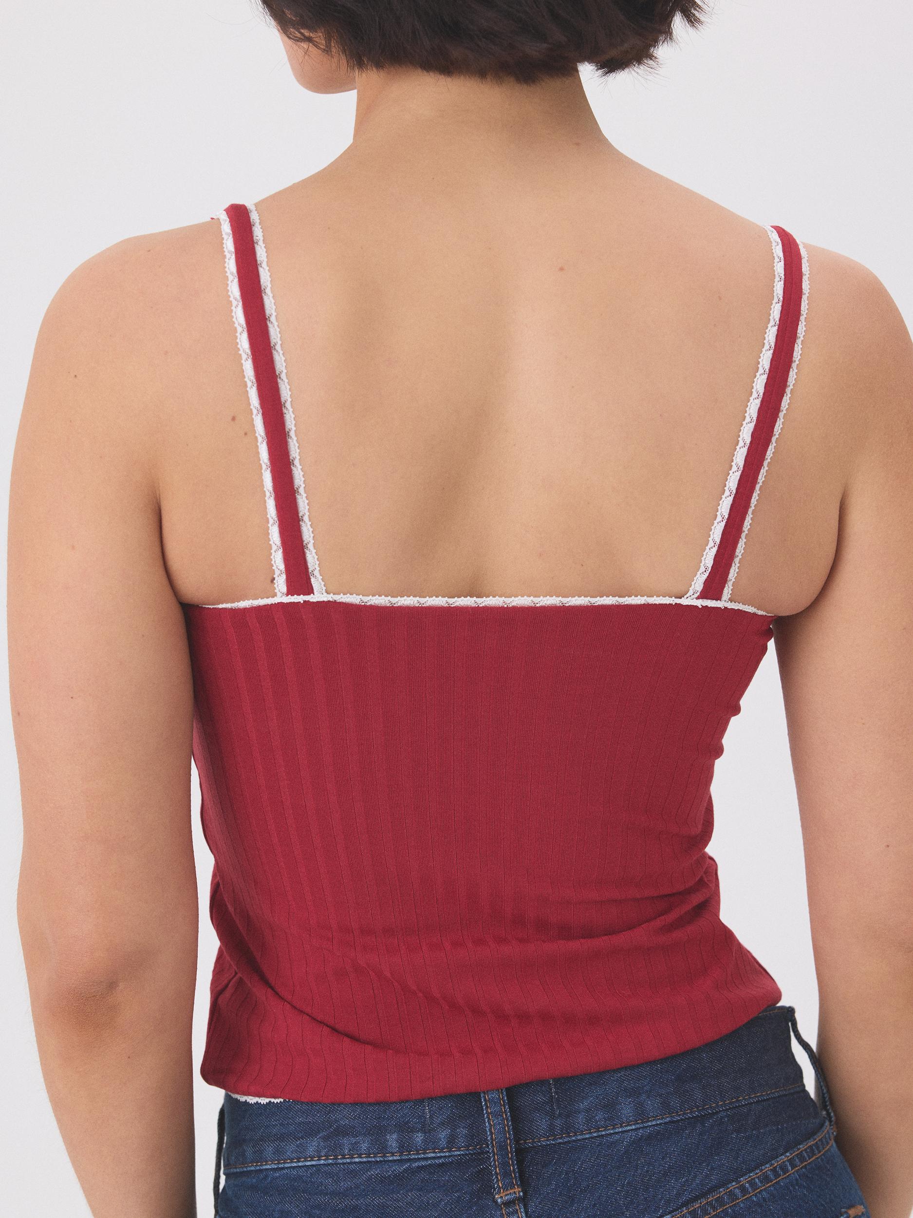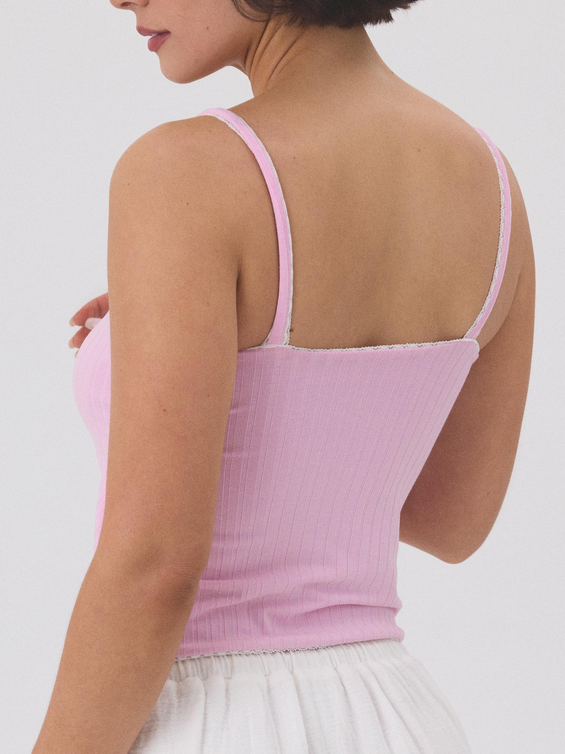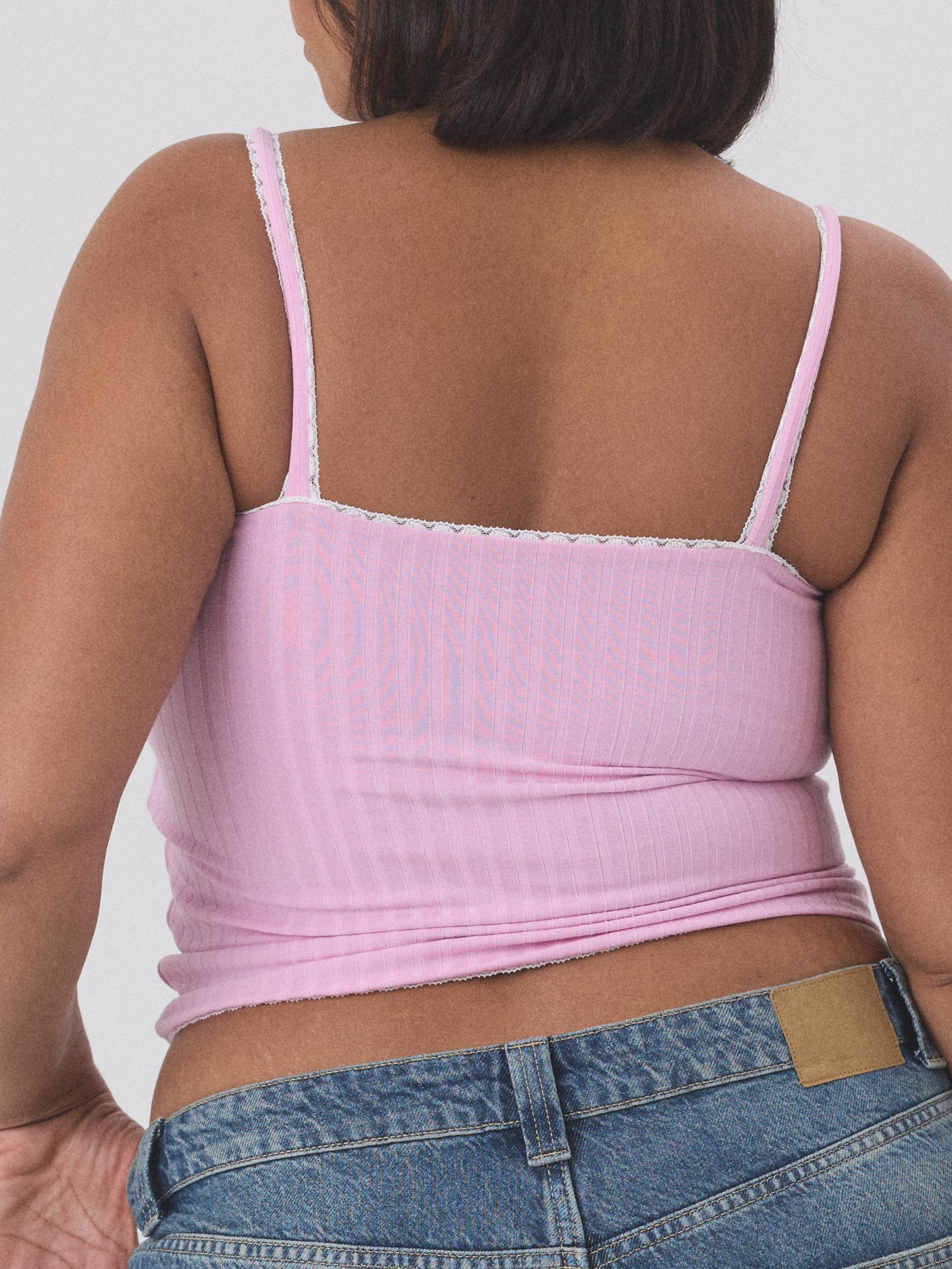 A feminine and dainty cami tank with lace trim, bows and our signature built-in padding. No folding, rolling, or flimsy pads! Our padding is designed to keep its shape for maximum support and coverage. This mid length design is made in a wide ribbed fabric and is fully lined in soft modal blend for maximum comfort. It has a square neckline and stretchy straps that meet with a tiny satin bow at each corner designed to make an effortless transition from loungewear to a casual going out look. Details: Square neckline, lace trim, double lined, ribbed fabric Fit: True to Size, size down if in between sizes Support: Low to Medium Fabric: 65% Polyester 30% Rayon 5% Spandex Internal Structure: Band-less Internal Fabric: Siro Modal, Spandex (1) FREE Standard Signature Padding Set Included: Size XXS: Small pads included Size XS-S: Medium pads included Size M-L: Large pads included Size XL: XL pads included Size 2X-3XL: 2XL pads included
