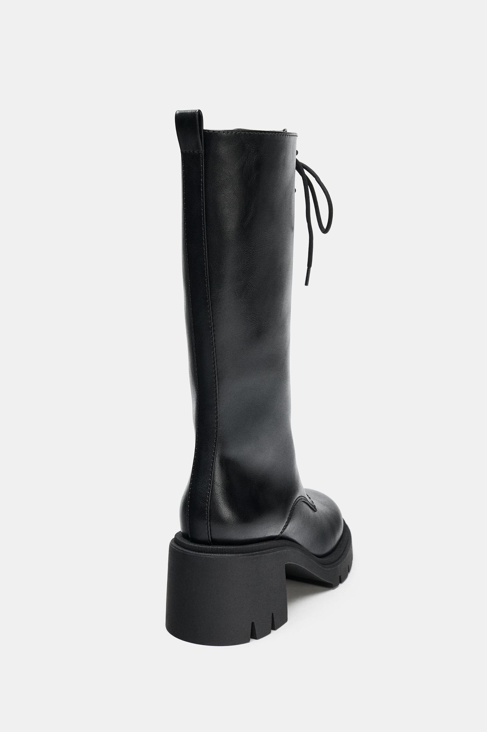 Boots with front lacing. Block heel with lug sole. Side zip closure. Back pull tab. Rounded toe. Heel height: 3 inches (7.5 cm)