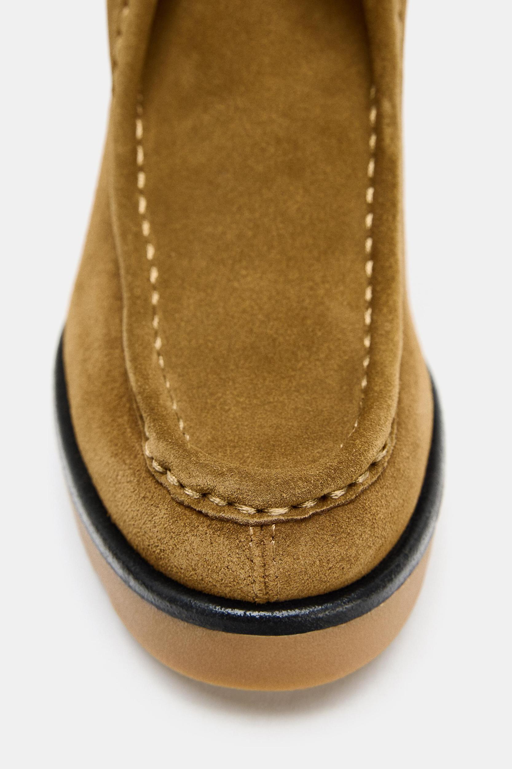 Ankle boots. Moccasin style. Topstitching detail on the upper. Front lace-up closure. Back made of a combination of materials. Back pull tab. Wide rubberized high heels. Rounded toe. Platform height: 2.8 inches (7 cm)