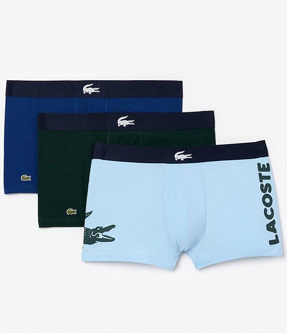 From Lacoste, this 3-pack features: (1) x solid pair of boxer briefs with "Lacoste" wording on one leg and a wraparound big crocodile graphic on the other leg (2) x solid pairs of boxer briefs with embroidered crocodile branding at one leg hem Both have embroidered crocodile branding at the waistband 5" inseam Stretchy cotton/elastane for ultimate comfort Machine wash/tumble dry Imported.