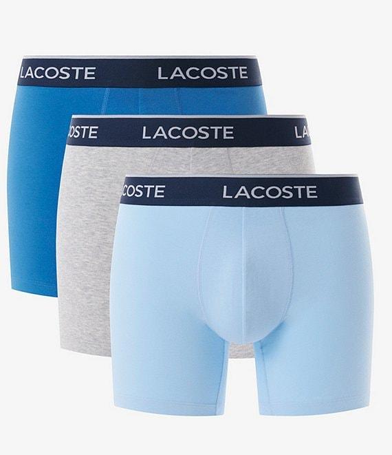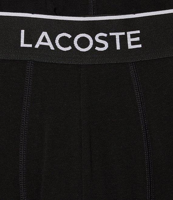 From Lacoste, this 3-pack features: (3) pack of boxer briefs Regular fit Contrast repeating the "Lacoste" logo on the waistband 5" inseam Soft stretchy cotton/elastane Machine wash/tumble dry Imported.