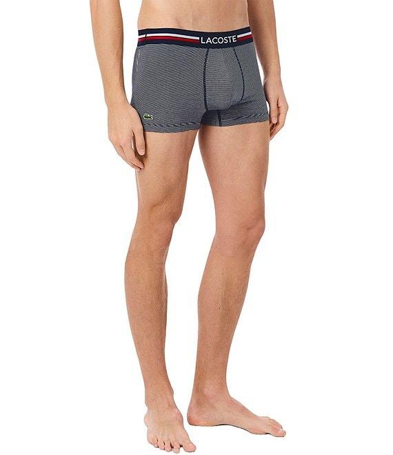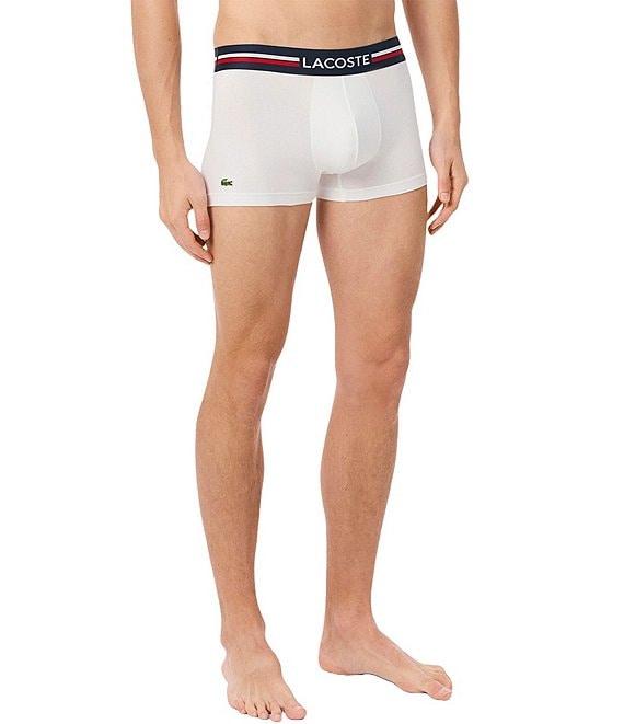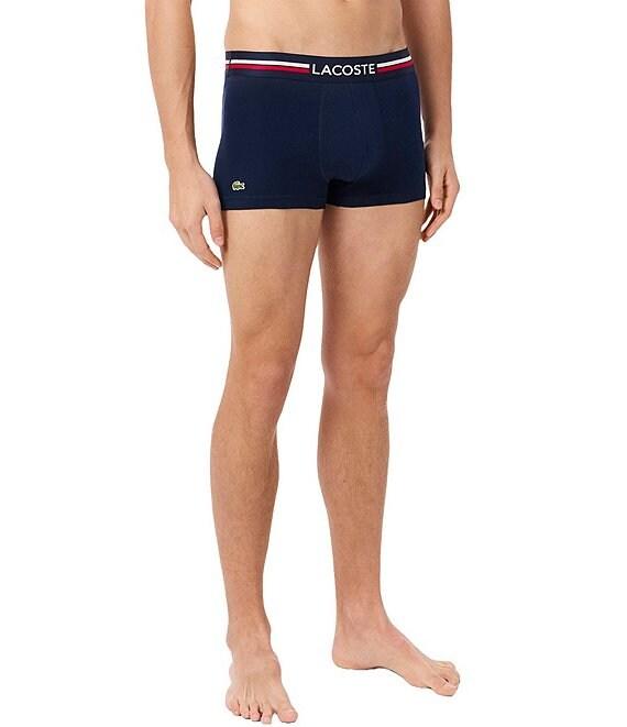 From Lacoste, these 3-pack trunks feature: A set of 3 trunks One with stripes and two solid-colored Crafted from soft, stretchy cotton to provide ultimate comfort Regular fit Regular ease on body, hip and leg Iconic French Flag Embroidered croc on the leg bottom Cotton Machine wash/tumble dry Imported.