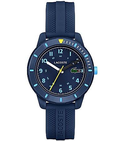 From the Mini Tennis Collection. This Lacoste watch features quartz movement, a rotating bezel, and a mineral crystal covering. The brands signature crocodile logo adorns the green dial at 3 oclock. Quartz movement Rotating bezel Mineral crystal Screw-down crown Green dial Arabic numeral hour markers Second hand Plastic case Silicone strap Deployant buckle Imported FEATURES Water resistant to 5 ATM SIZE Round case, 34mm (1.34). Men Accessories - Watches And Gifts > Lacoste > Saks Fifth Avenue > Barneys. Lacoste. Color: Black.