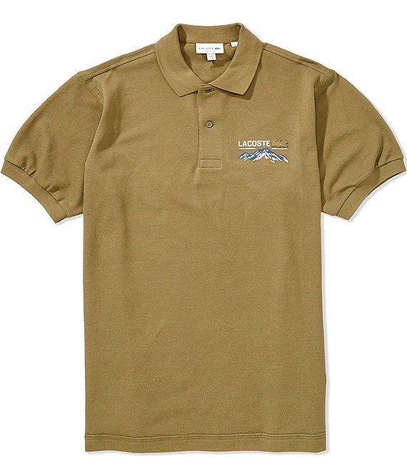 From Lacoste, this polo shirt features: Textured "Lacoste" print branding Polo collar Short sleeves 2-button placket with rubber buttons Embroidered mountain motif on the left side of chest Pullover construction Classic fit Organic cotton pique Machine wash/tumble dry Imported.