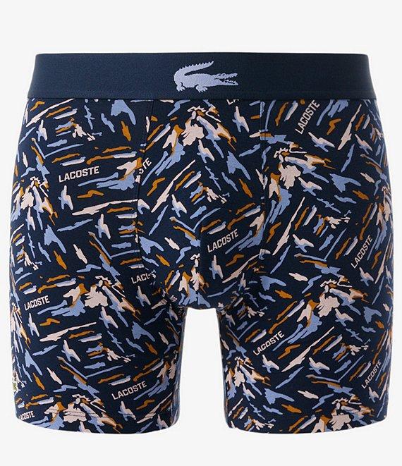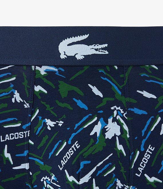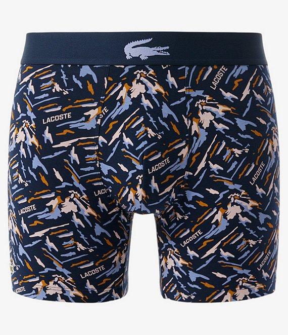 From Lacoste, these boxer briefs feature: Stretch jersey fabric Allover print Comfortable, supportive cut for round-the-clock comfort Approx. 5" inseam Pull-on construction Elasticated waistband with contrast crocodile Cotton/elastane stretch jersey Machine wash/tumble dry Imported.