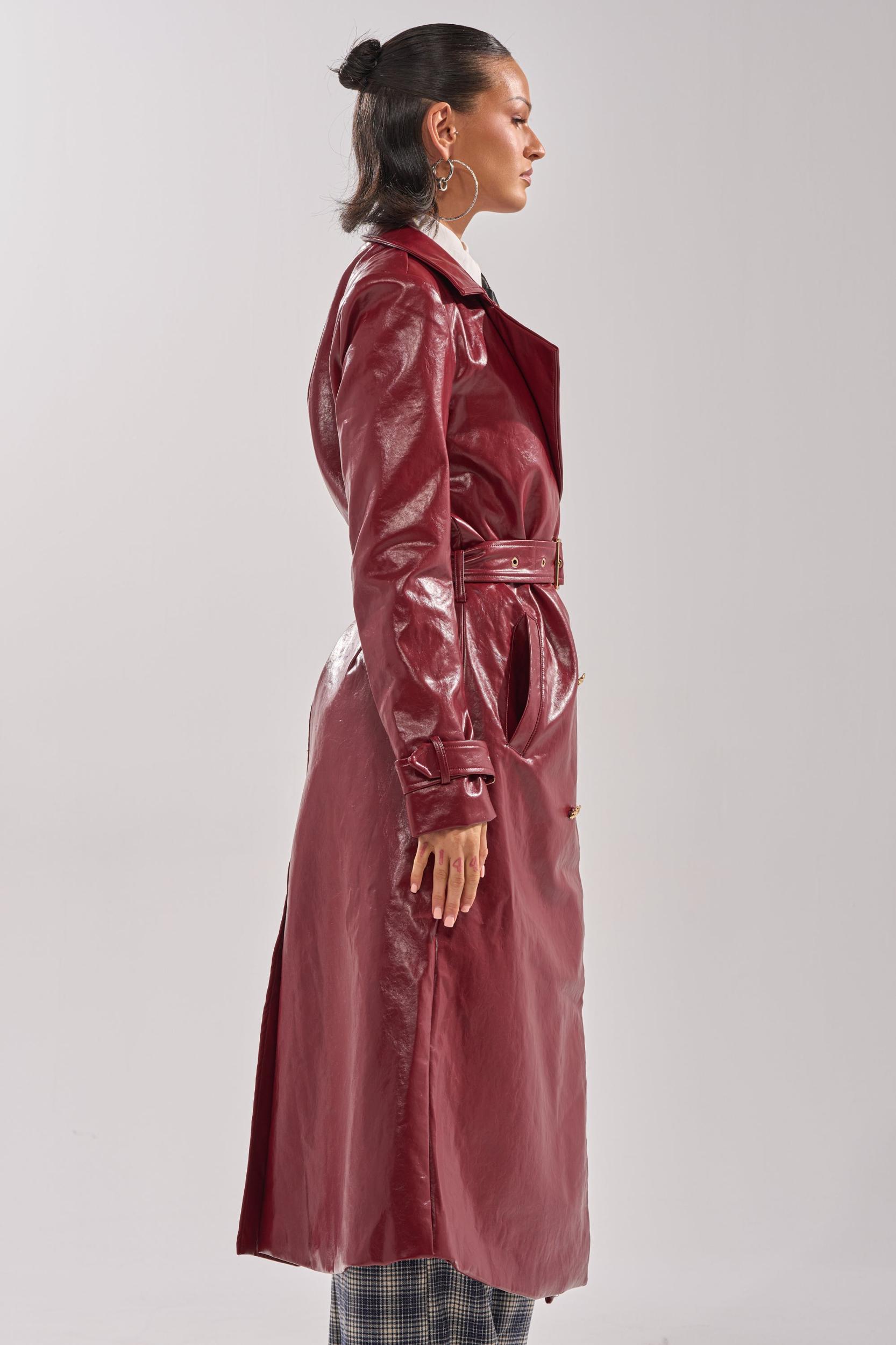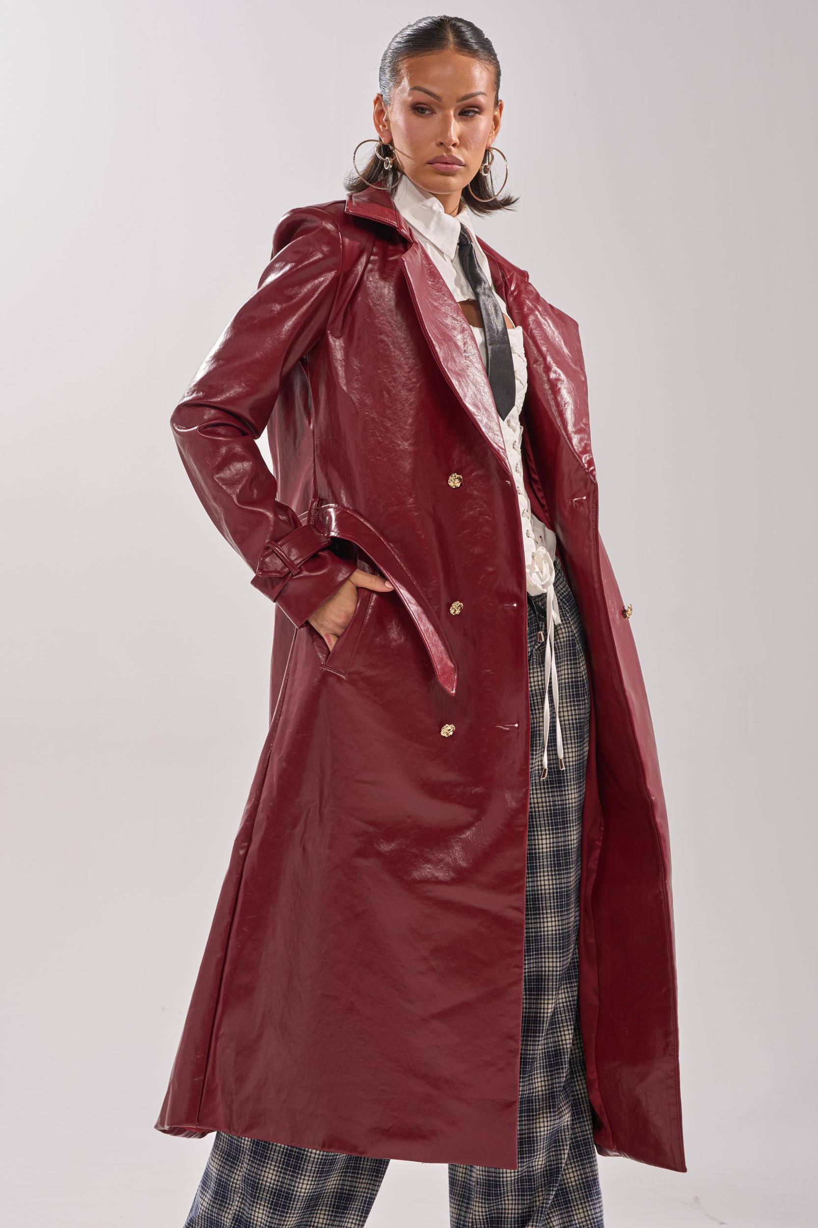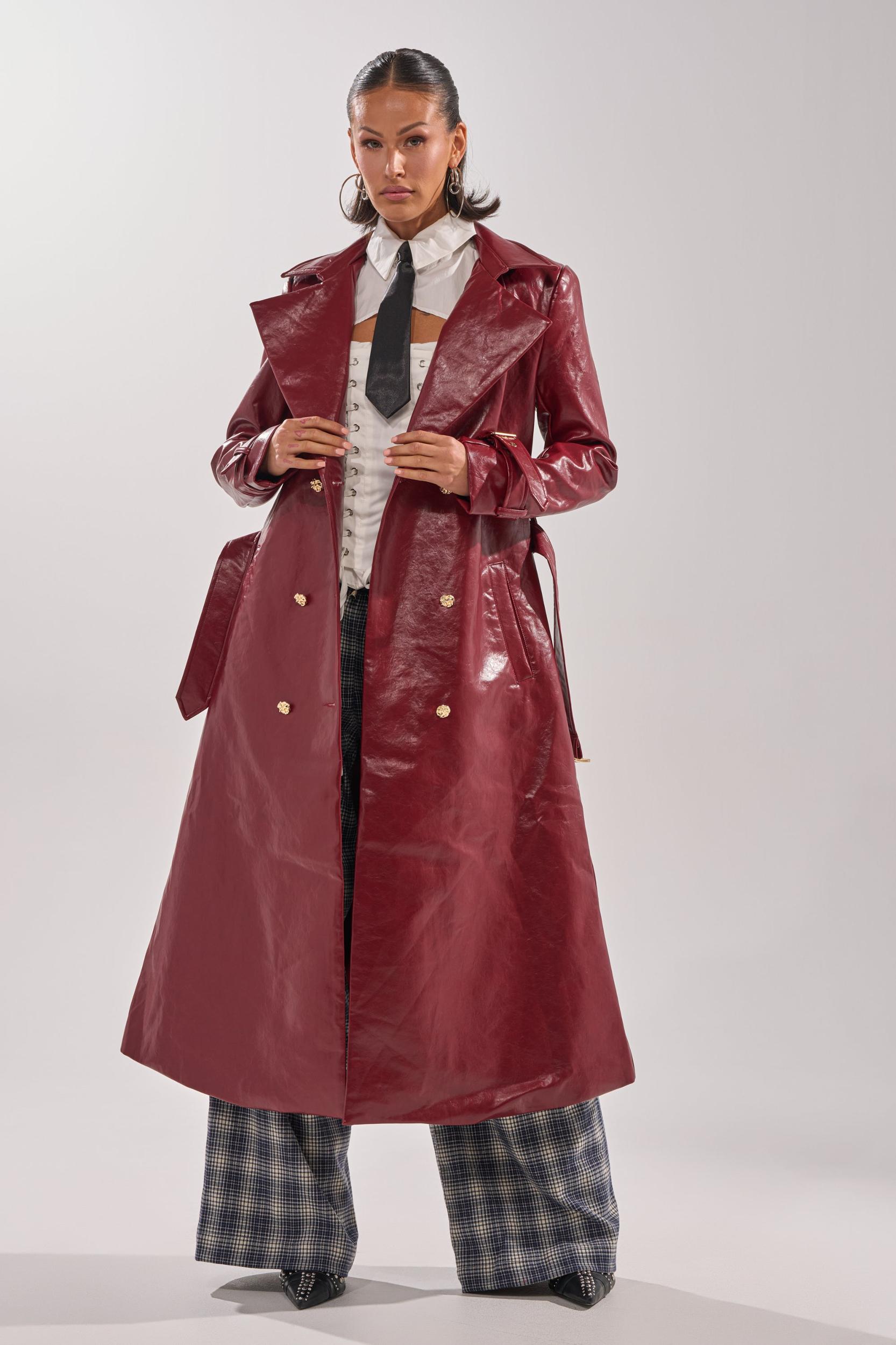 Live life on the edge in the AKIRA Label Lady Danger Faux Leather Trench. Crafted from a glossy faux leather in a rich burgundy colorway, this classy jacket boasts gold-tone hardware, a classic notch lapel collar, lightly padded shoulders, long sleeves with adjustable belted cuffs, a coordinating waist belt, dual waist pockets, and a double-breasted front closure. It also boasts a back vent slit and a tonal, satin inner lining. Complete with an elegant, longline silhouette. Pair with a mock knit sweater, flared jeans, and stiletto booties for a polished finish. - 50% PU 50% Polyester- Hand Wash or Dry Clean- No Stretch- Imported (all measurements approximate from size small)- 48” Shoulder to Hem- 15” Shoulder to Shoulder- 24” Sleeves- Model is 5’7” and is wearing size smallProduct ID: 1061402 (all measurements approximate from size 1X)- 52” Shoulder to Hem- 16” Shoulder to Shoulder- 26” SleevesProduct ID: 1061406