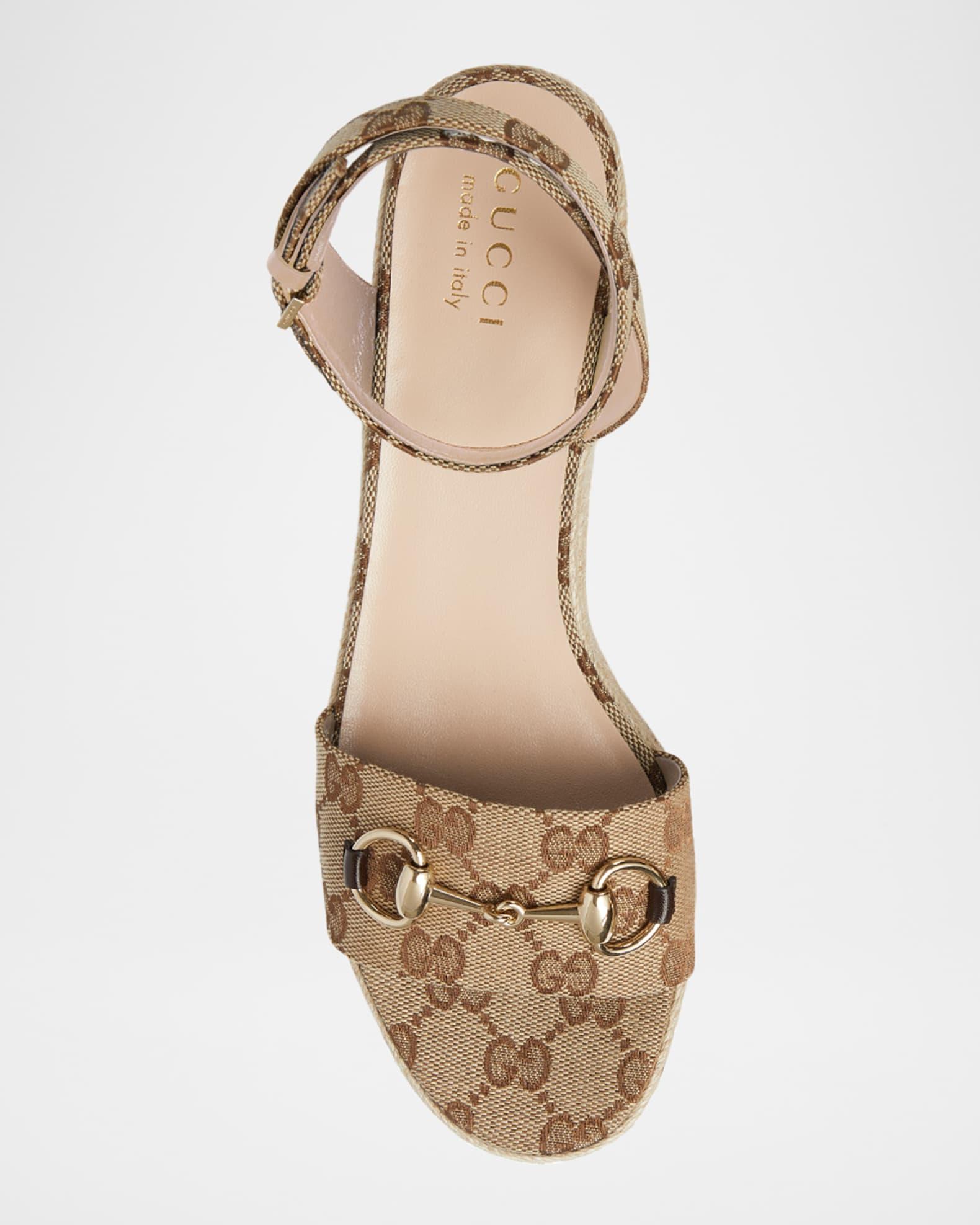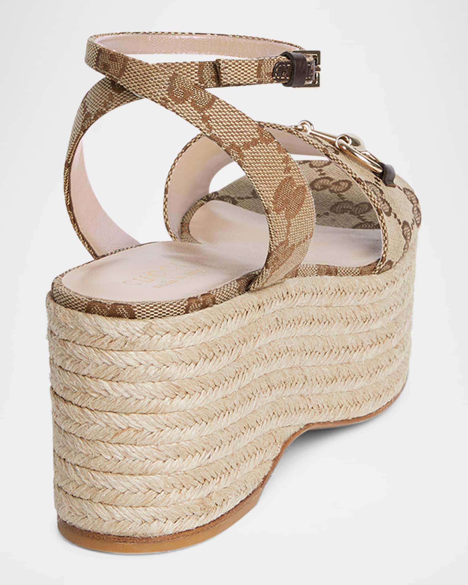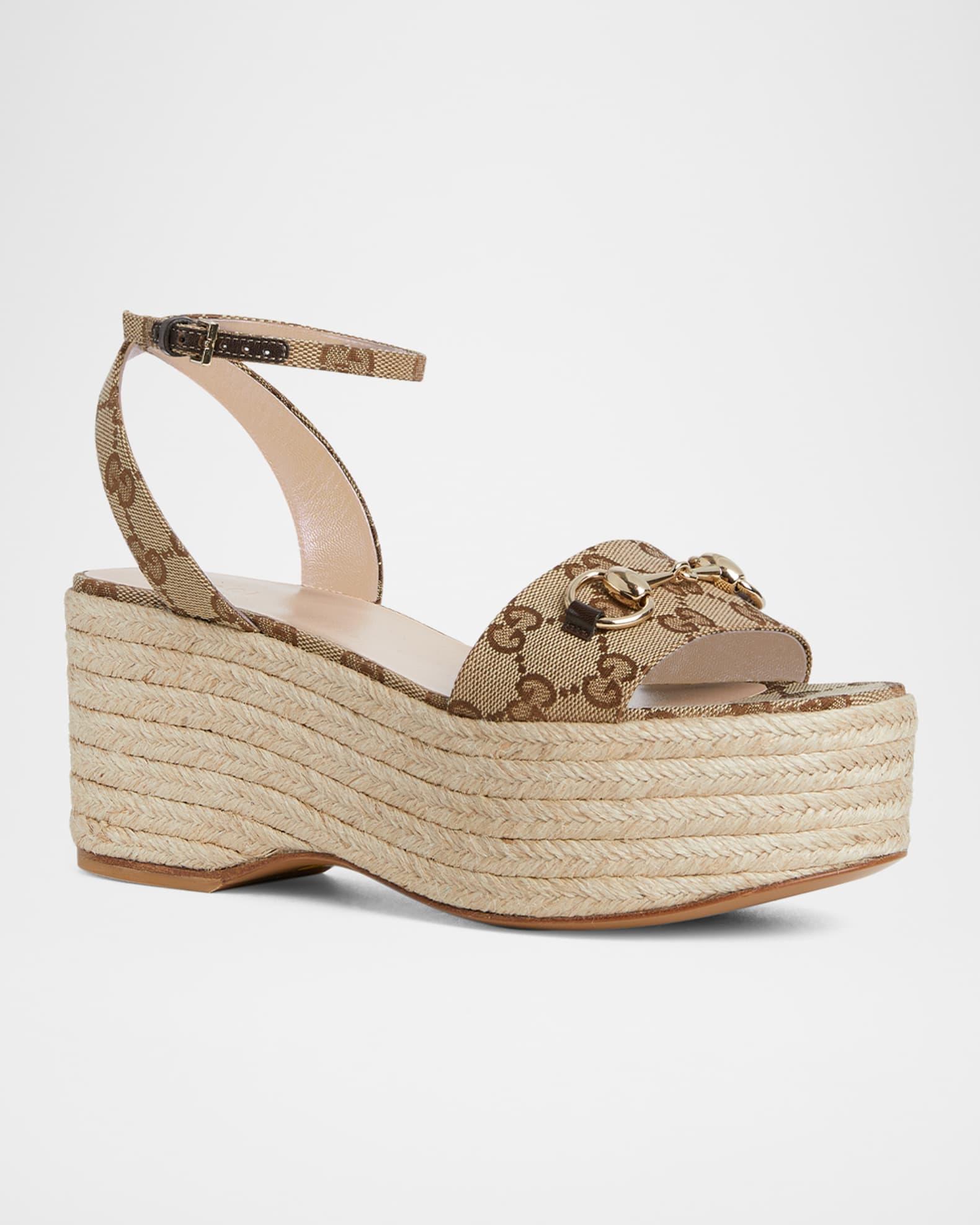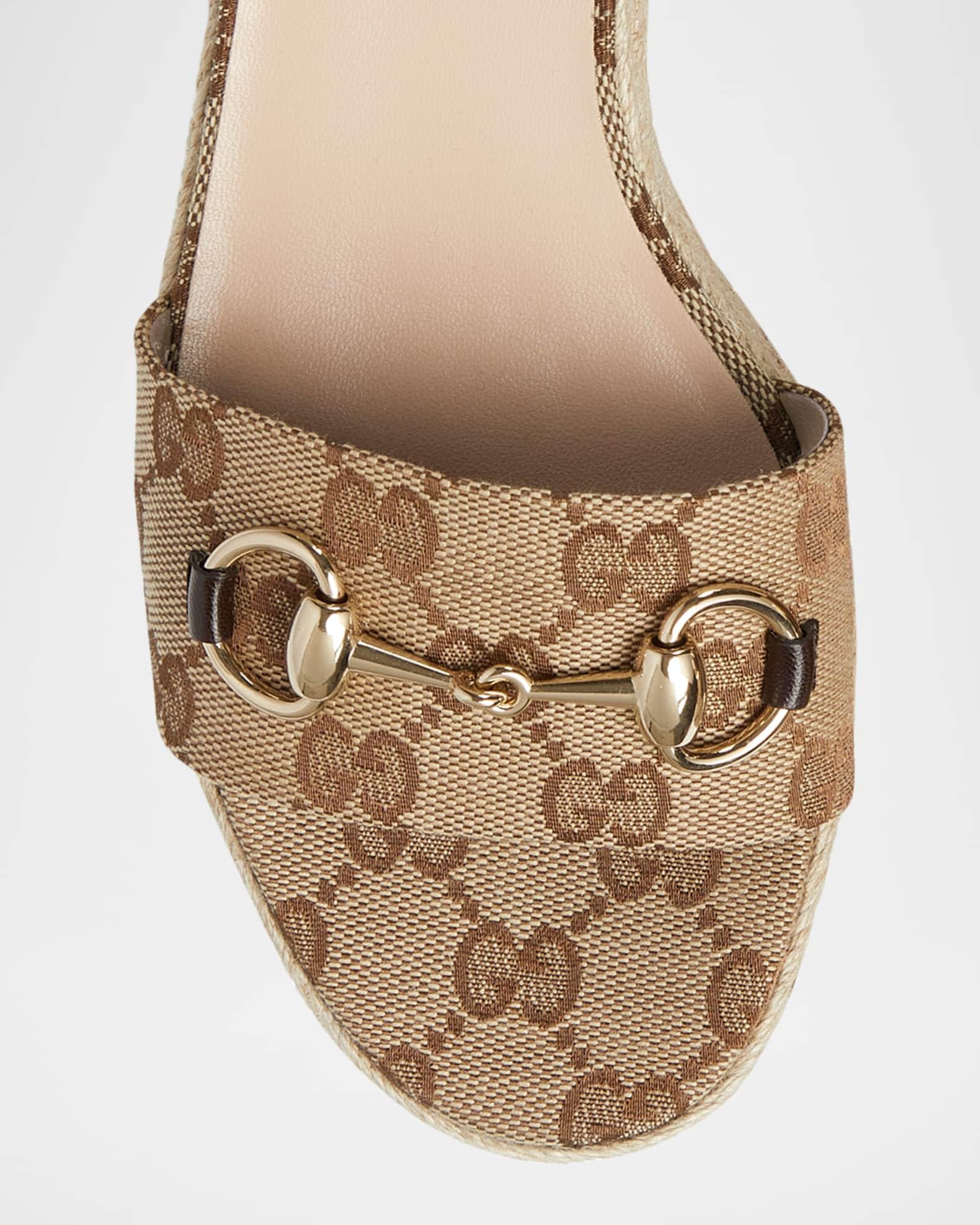 Gucci sandals GG monogram canvas polyester and rubber espadrille sandals with signature lady horsebit 1.25 in / 30 mm platform heel; 1.00 in / 25 mm platform Open toe Single band vamp Adjustable buckle ankle strap Rubber outsole Spot clean, professional cleaning recommended Made in Spain Size Note: Runs true to size.