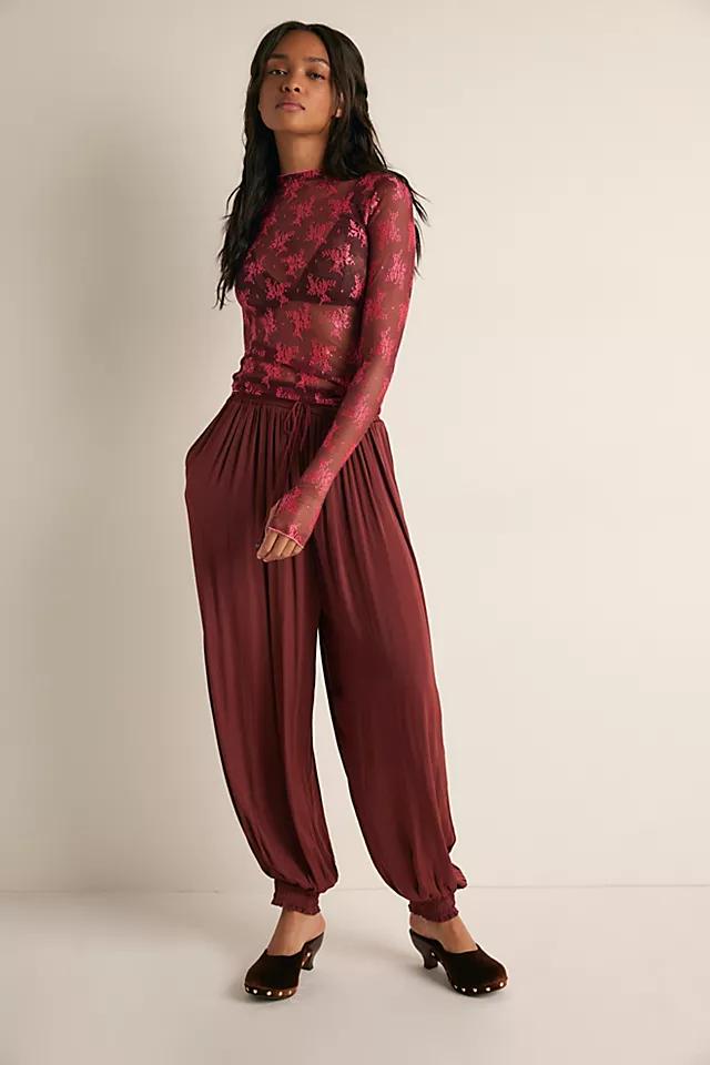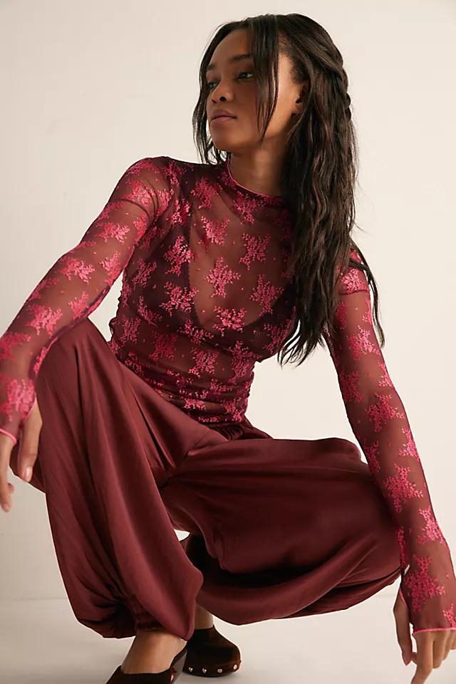 Perfect for layering, this sultry mesh long-sleeve is featured in a sheer design with floral embroidery, a high-neckline and thumbhole details. * Relaxed fit * Fluttery hemline * Unlined and sheer