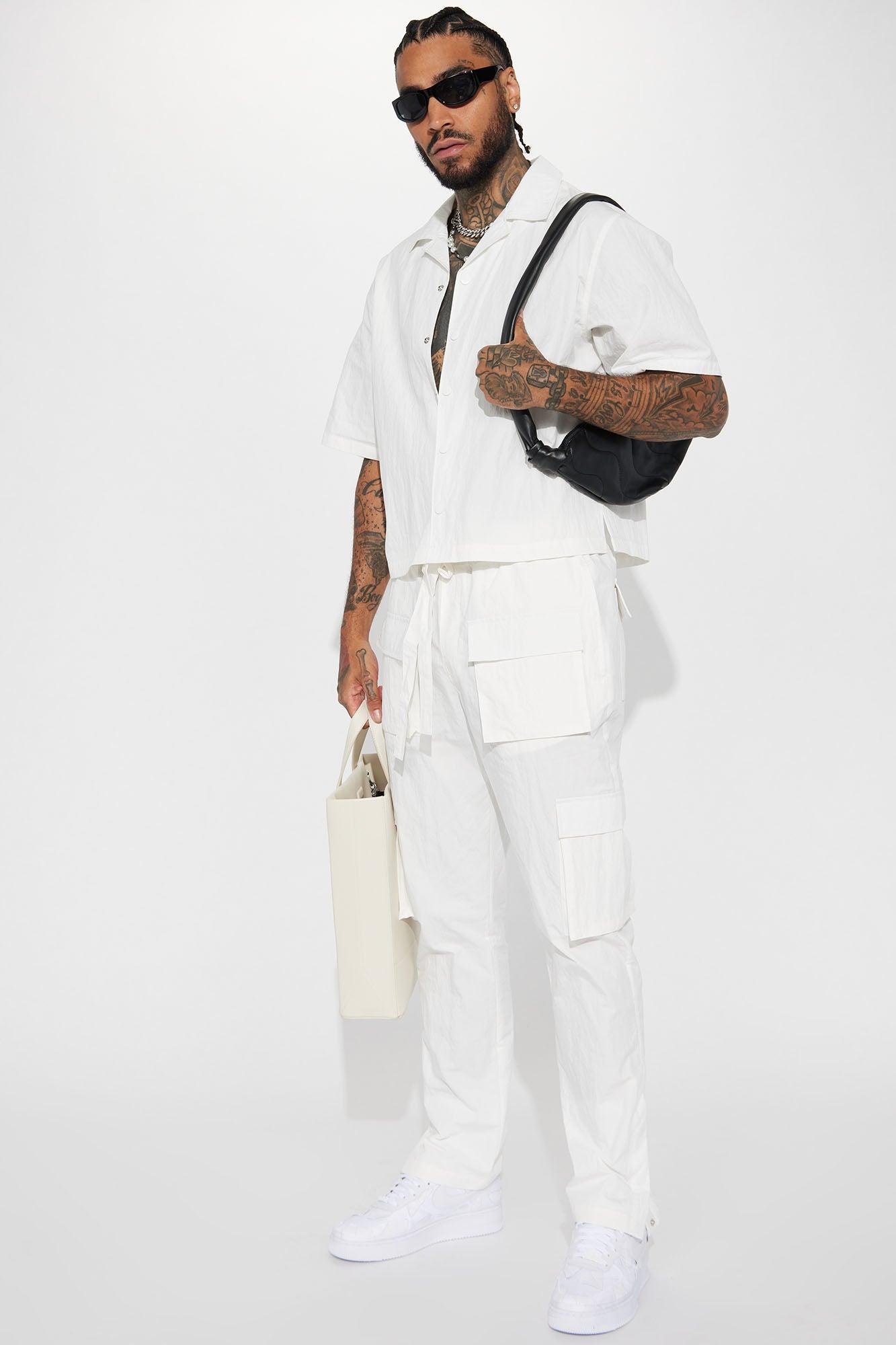 Available In White. Fold Down Collar Front Button Closure Bottom Side Slit Pair With "Lagos Textured Nylon Snap Cargo Pants" Shell: 63% Cotton 37% Nylon Imported