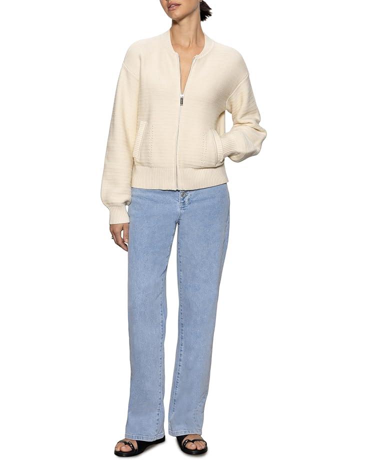 For those days when the temps drop a little, add a cozy layer of warmth in the Sanctuary™ Knitted Bomber. Crafted from a soft cotton blend, this coat features a traditional bomber collar with a front zipper closure, dropped shoulders, long sleeves, and front hand pockets.