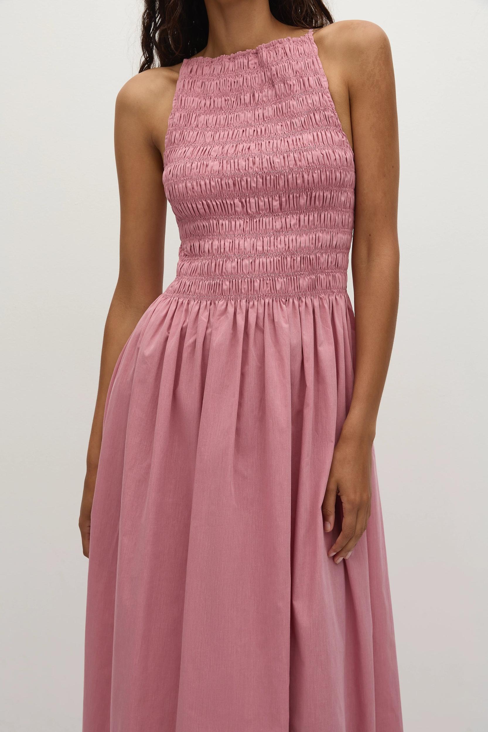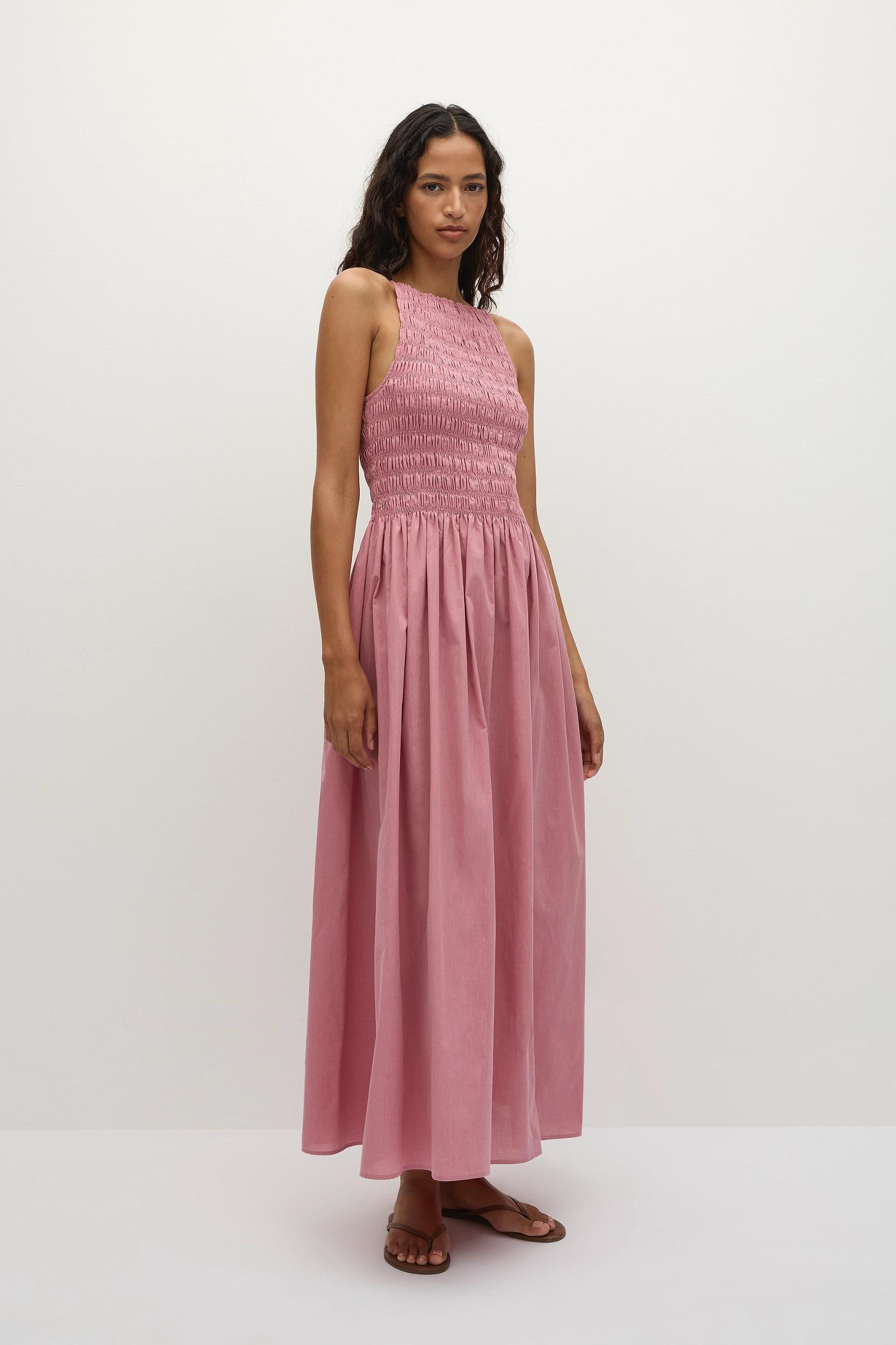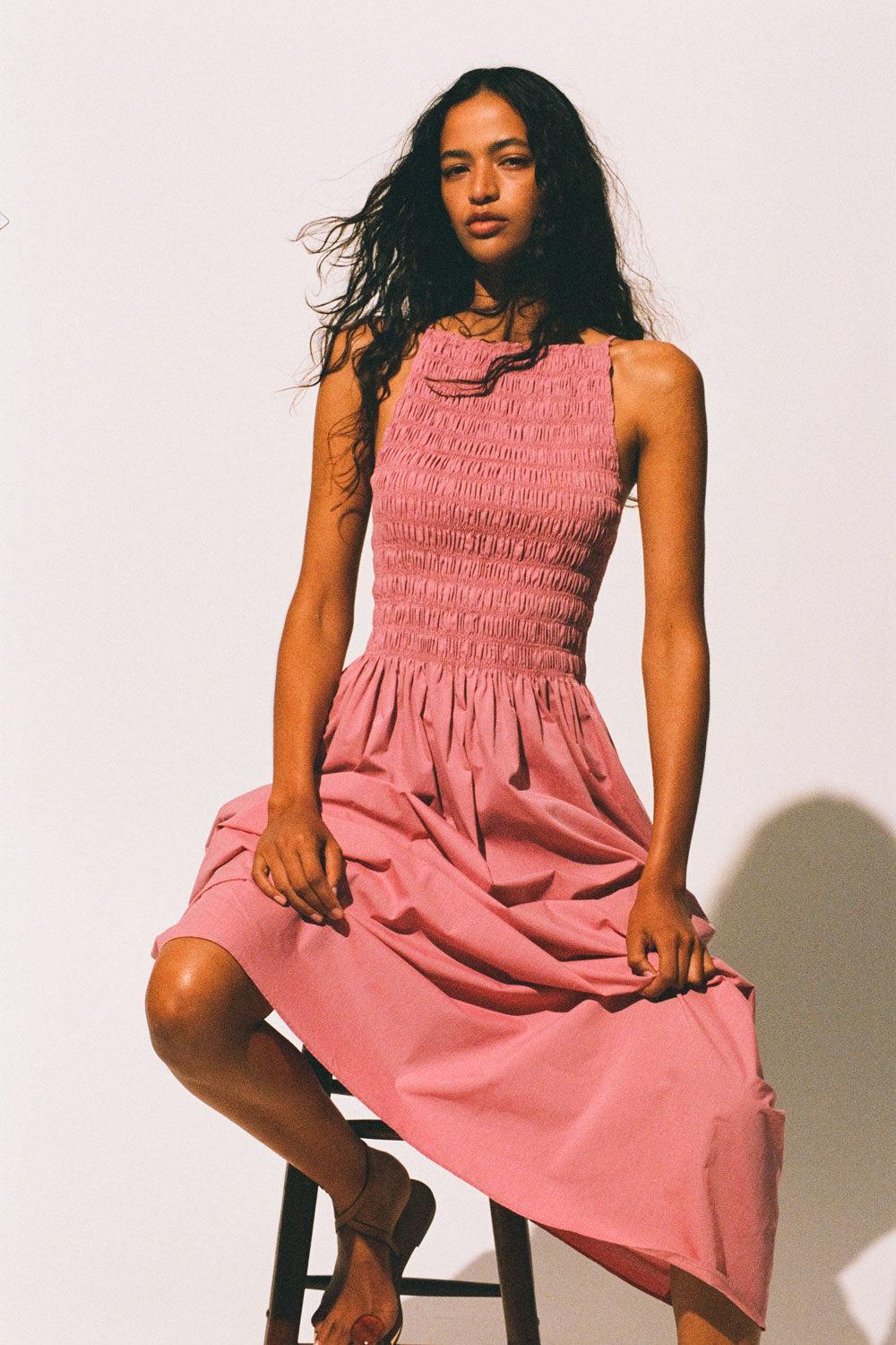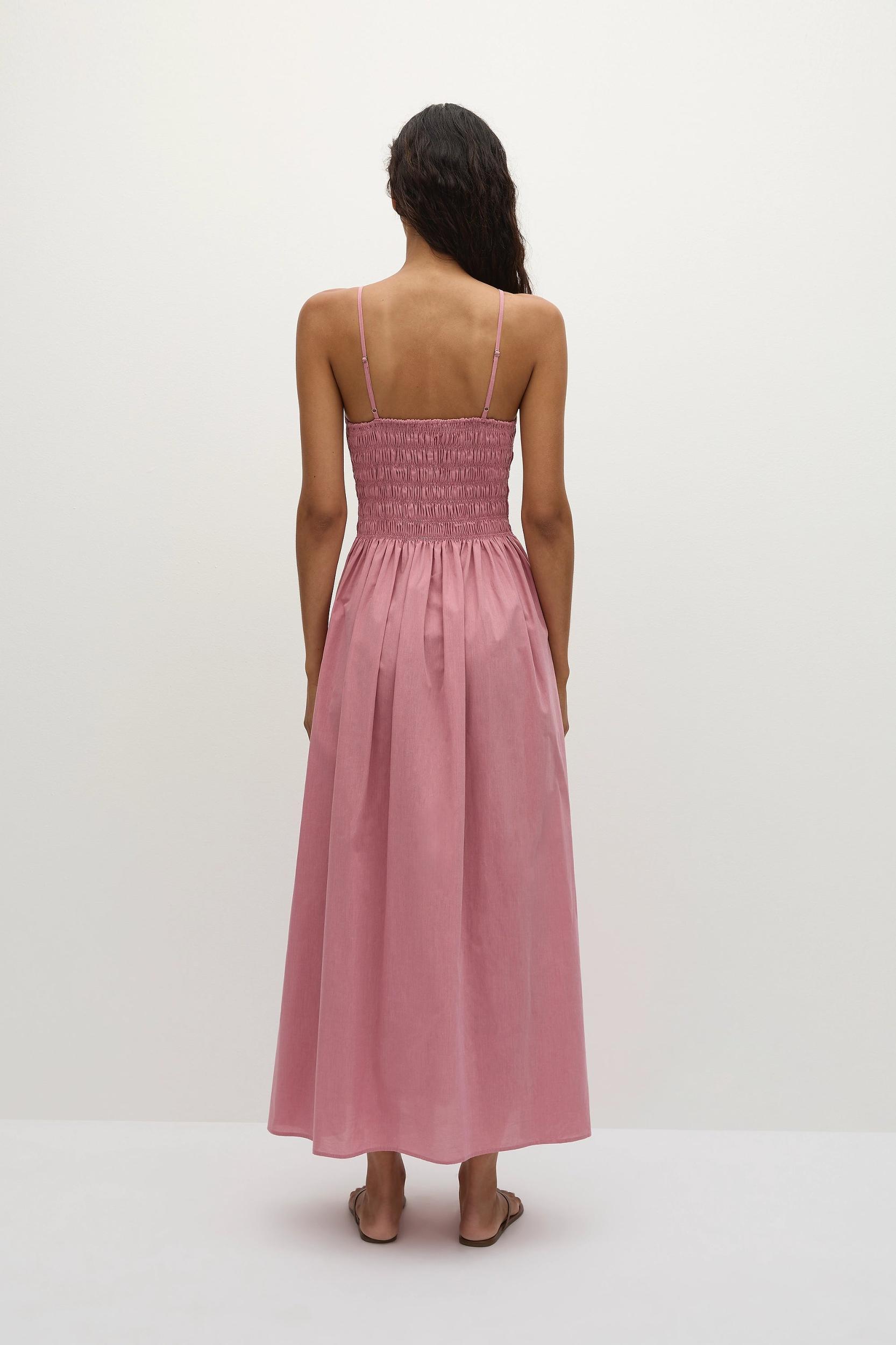 A feminine midi dress with a high square neckline and thin straps, adjustable in length. Shirred through the bodice for additional stretch, it is gathered at the waist and then falls into a soft A-line skirt that crops above the ankles. Designed from a signature 100% organic cotton in a soft valentine pink, it offers throw-on throw-off appeal for long lunches and vacation wear. It is also the perfect segueway to embracing pink tones in your summer wardrobe. This style is true to size. The shirred bodice offers additional stretch.