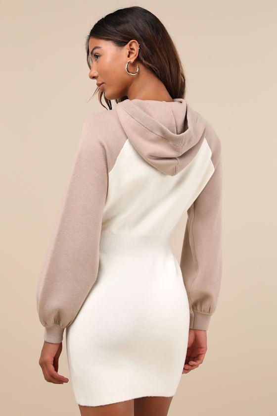 Whether you're running errands or just hanging out with friends, it's easy to look cool and stay cozy with the Lulus Laidback Moments Ivory and Beige Hooded Sweater Mini Dress! This cute dress boasts a trendy color block design, along with a stretchy, medium-gauge sweater knit composition that shapes a hooded neckline (with adjustable drawstrings), long raglan sleeves with a balloon silhouette and fitted cuffs, and a blousy bodic50% e. The banded waist sits atop a bodycon skirt that finishes at a flirty mini hem. Contrasting ribbed knit accents the hood, cuffs, and waist
