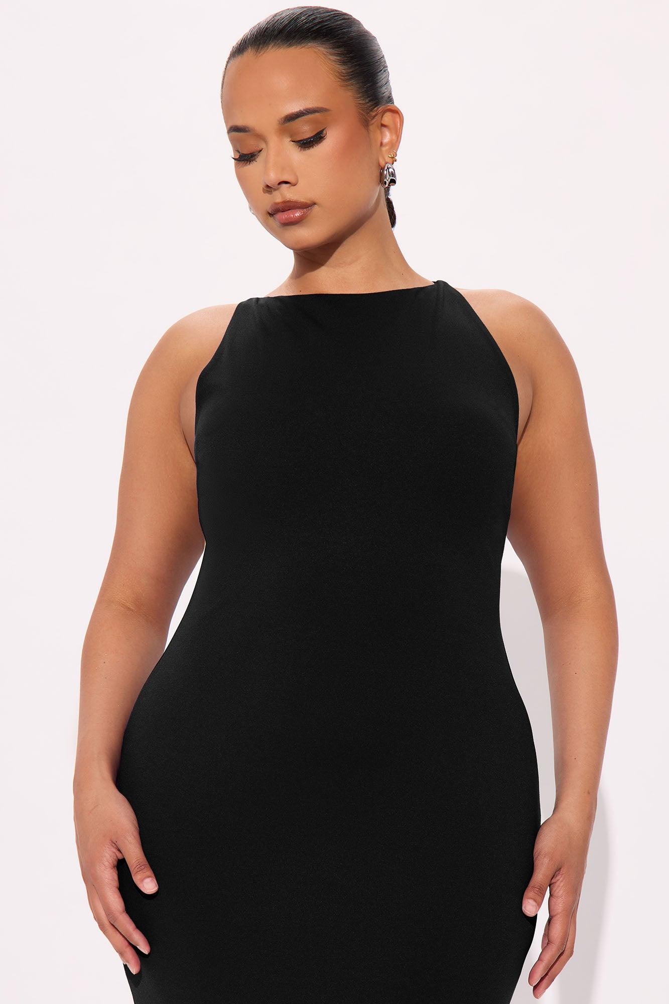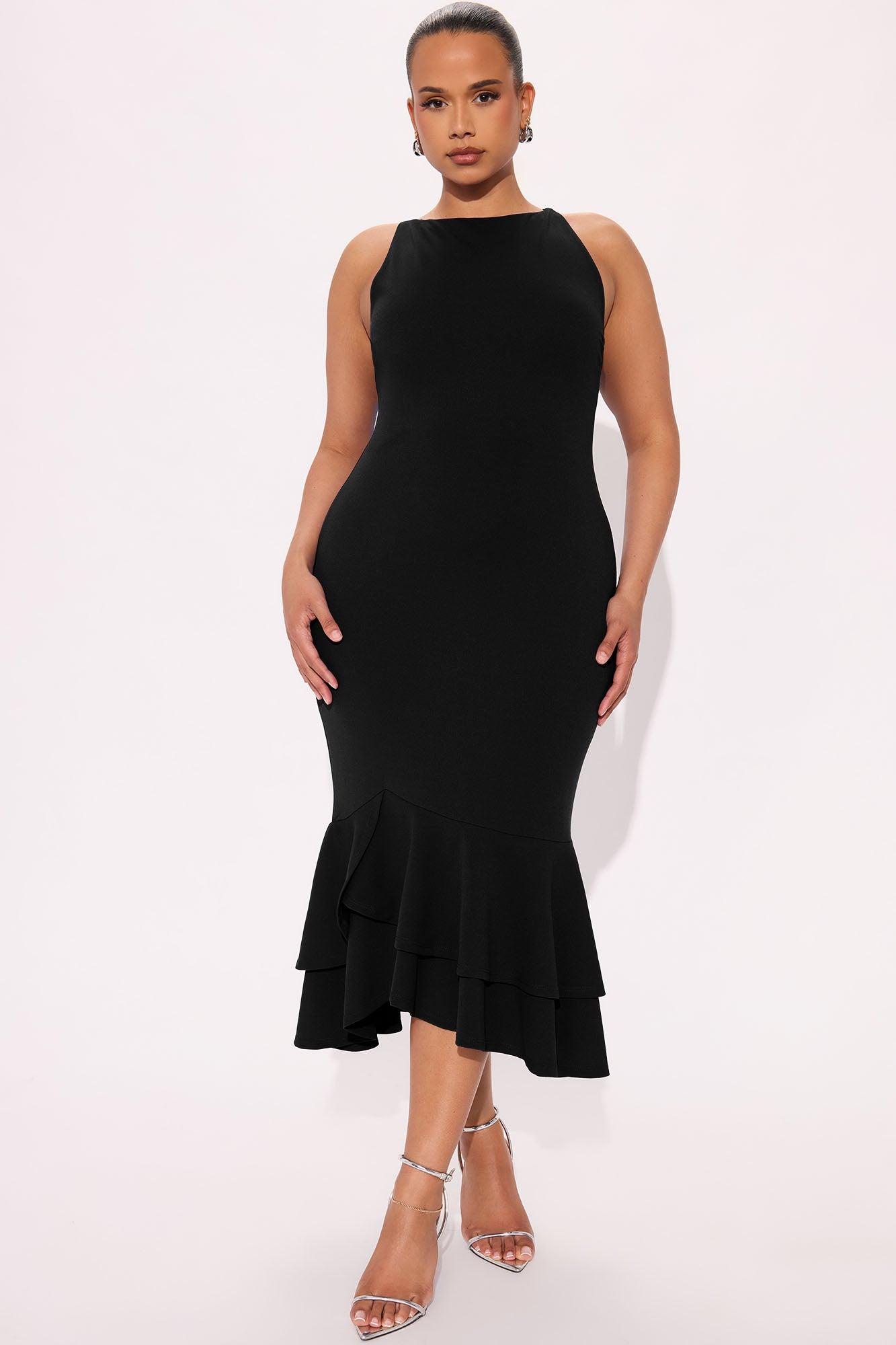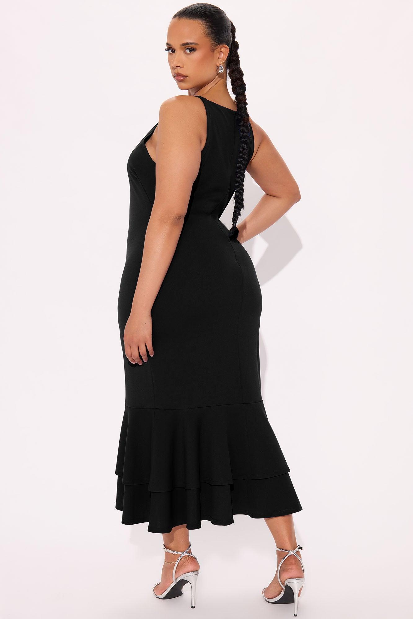 Available In Black, DarkRed And Royal. Crepe Midi Dress High Neckline Sleeveless Ruffle Detail Tiered Asymmetrical Hem Back Zipper Stretch Length Measured Flat = 44" Self: 95% Polyester 5% Spandex Lining: 100% Polyester Imported California Proposition 65WARNING: Cancer and Reproductive Harm - www.P65Warnings.ca.gov.