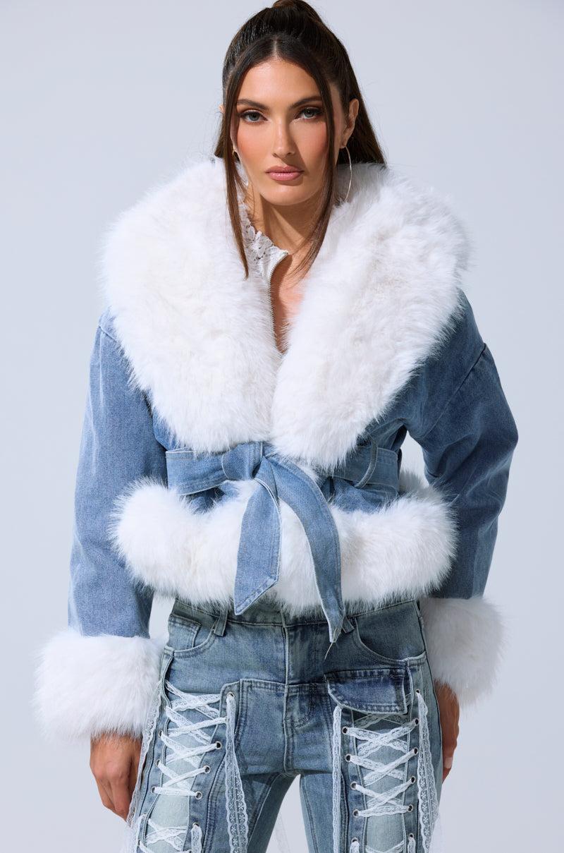 Chase the blues away in The AKIRA Label Lainey Fur Trim Denim Moto. This cozy-chic outerwear piece is crafted from a structured light wash denim base and features a plush faux fur fold-over collar, long sleeves with coordinating fur cuffs, side slant pockets, a tonal self-tie waist belt, and fur trim on the bottom hem. Complete with a plush sherpa inner lining, a cropped robe-like design, and a subtle peplum silhouette. Pair with a knit maxi dress, and stiletto booties for a finished look. - Fabric: 75% Cotton 15% Viscose 10% Polyester, Lining: 100% Polyester, Fur: 100% Polyester, Padding: 100% Polyester- No Stretch- Imported (all measurements approximate from size small)- 17” Shoulder to Hem- 19” Sleeves- 23” Shoulder to ShoulderProduct ID: 433550 (all measurements approximate from size 1X)- 18” Shoulder to Hem- 20” Sleeves- 24” Shoulder to ShoulderProduct ID: 433554