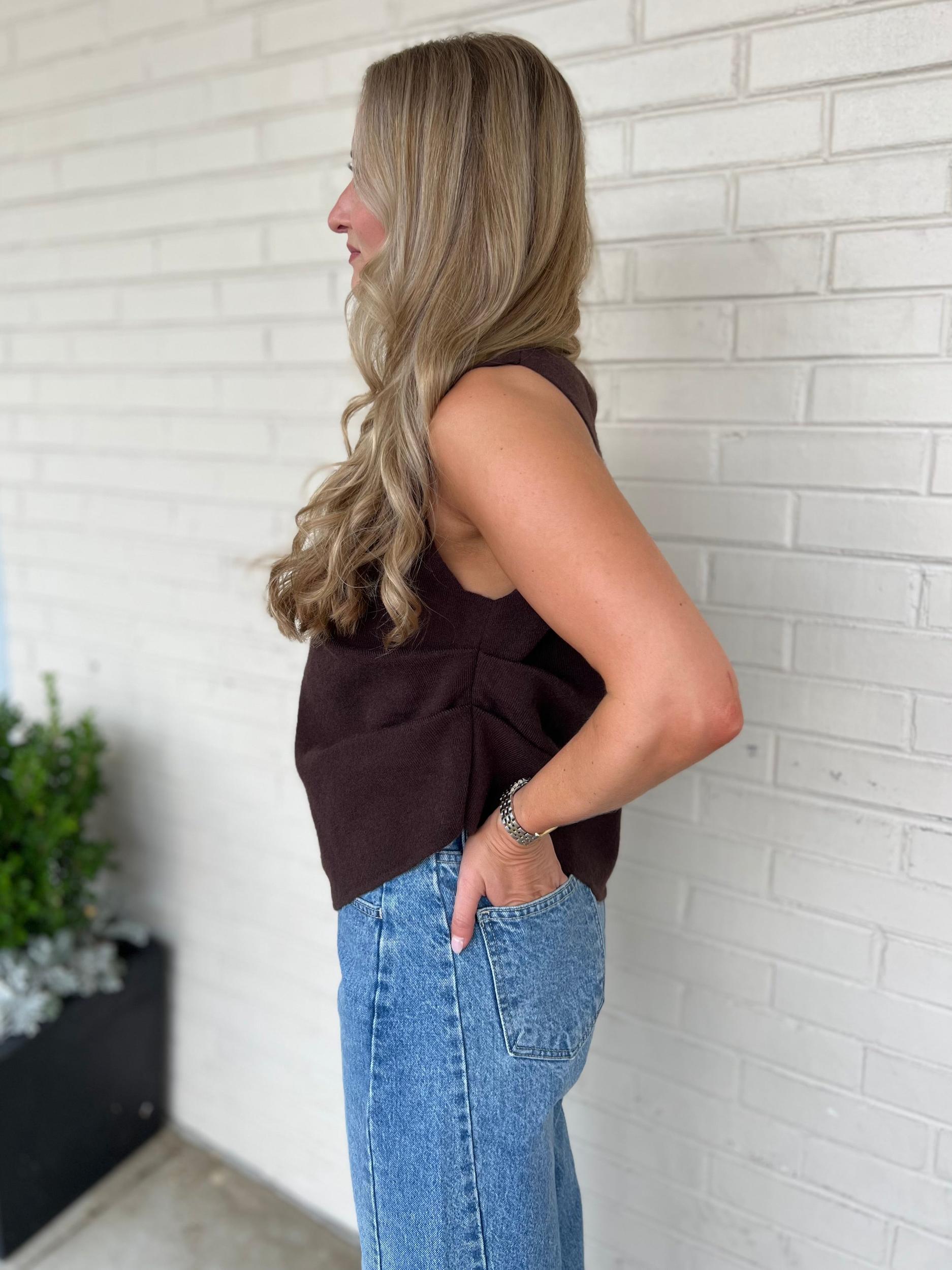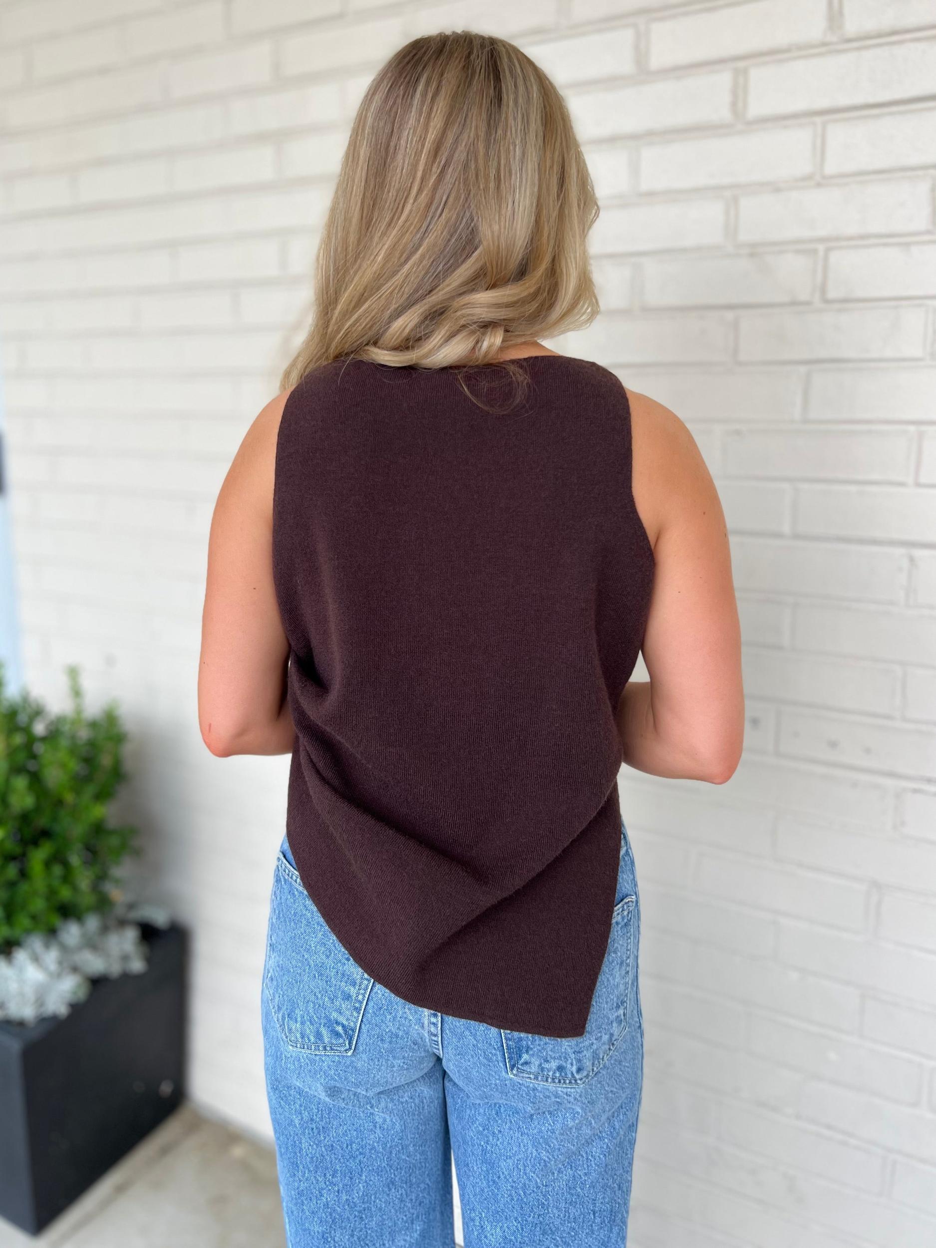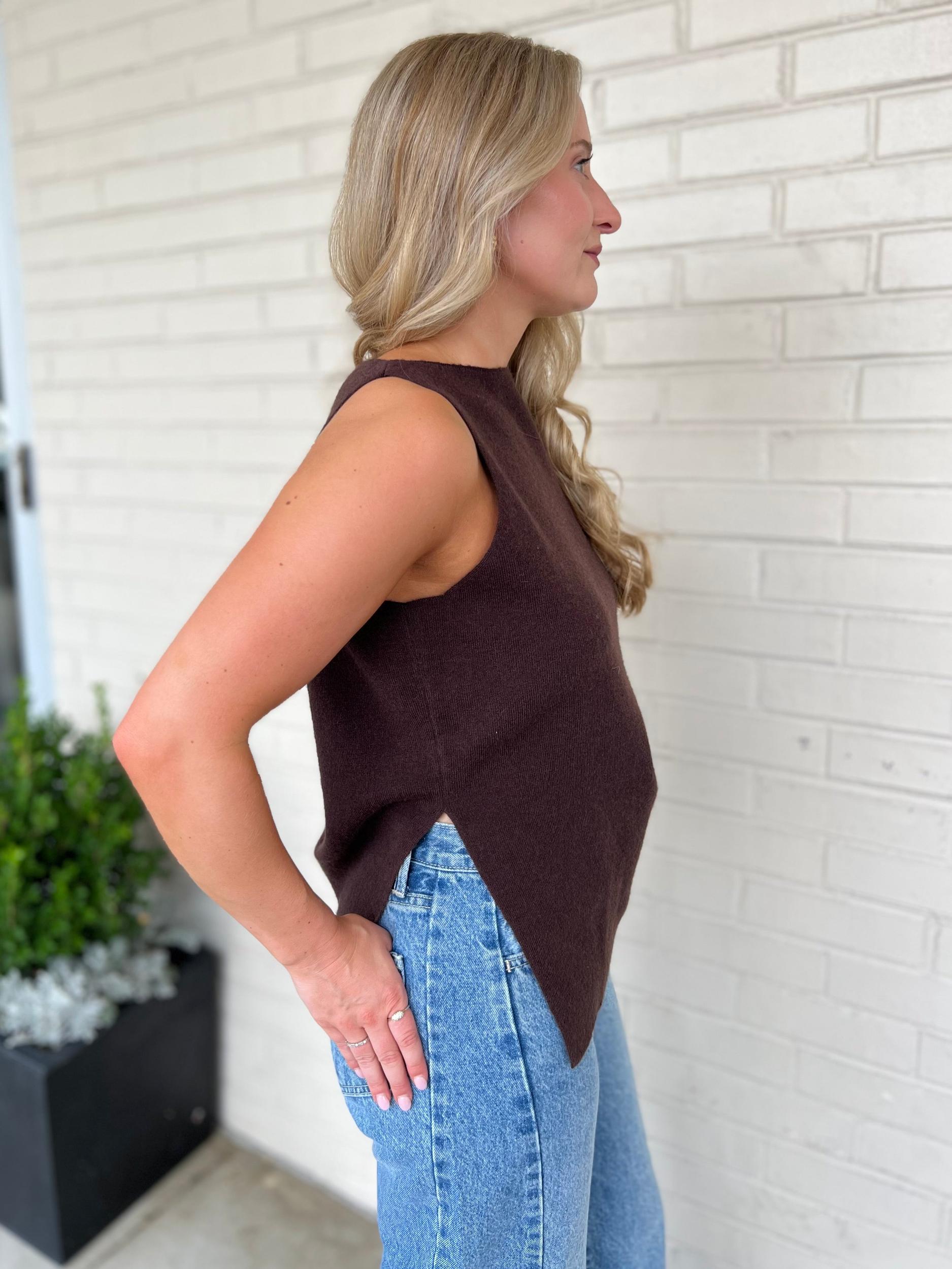 This brown knit tank features charming side gathering and a playful side slit, adding a flirty twist to your casual look. Perfect for layering or wearing solo, it brings cozy comfort with a touch of fun flair.