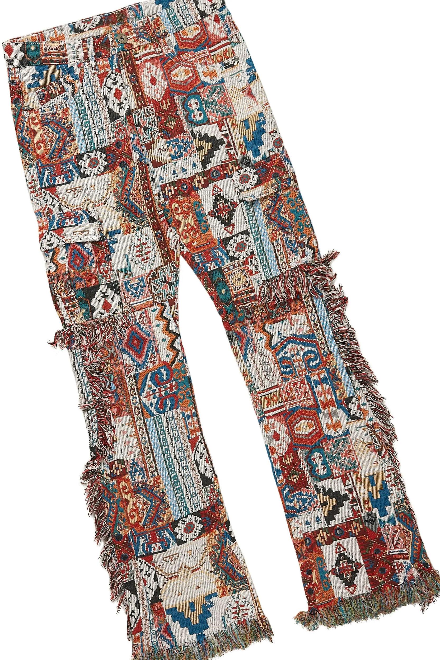 An urban two-piece hoodie and stacked cargo tapestry jean set for men. Designed with organic cotton and extra long legs for a dope streetwear outfit set. Drawstring hood Long sleeves Pullover style Kangaroo pocket Ribbed knit trims Printed RSO logos Custom printed graphics Zip fly with button closure 7-pocket build Stacked construction Flare leg openings 35.75" seams *NOTE: These jeans are purposefully designed with extra long legs so the fabric properly bunches at the hem, creating the stacked flare style.